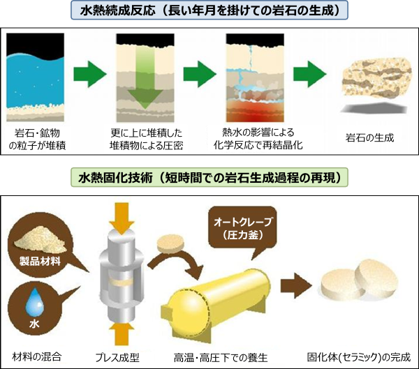 堆積物による圧密や熱水の影響を受けて起こる化学反応(水熱続成反応)によって、岩石が生成される過程を科学的に再現し、200℃・1.6Mpa程度の低エネルギー下でセラミックを製造する技術を水熱固化技術と呼んでいます。