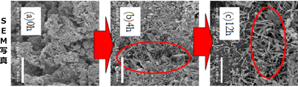 飽和蒸気圧下で水が反応媒体となって、針状結晶のケイ酸カルシウム水和物(トバモライト結晶)が析出し、これらが絡み合って高い強度を発現させ、かつ多孔質(軽量)のセラミックとなります。