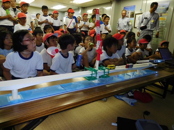 写真は沖縄県那覇市の曙小学校の児童を対象とした橋梁見学会((株)ピーエス三菱さん主催)での模型を用いた橋梁工事の説明状況です。