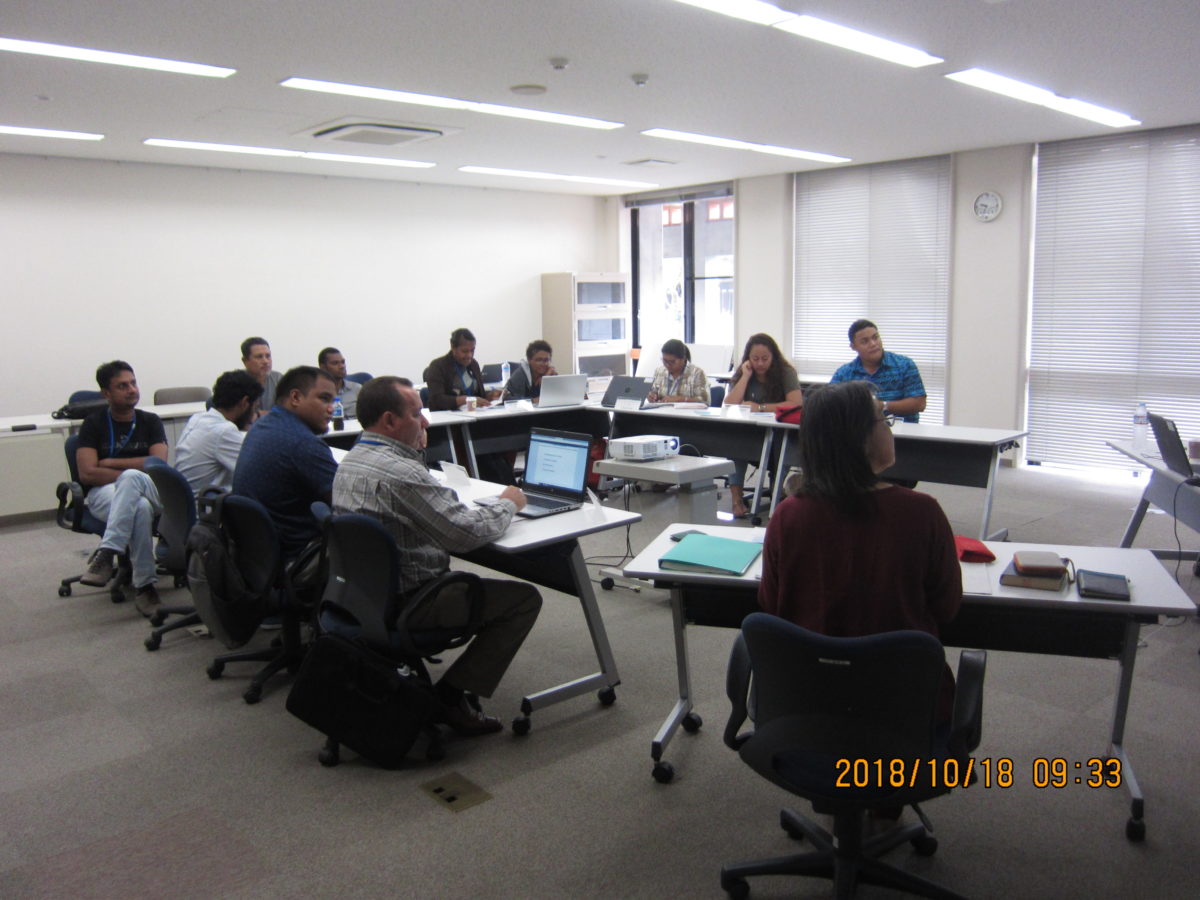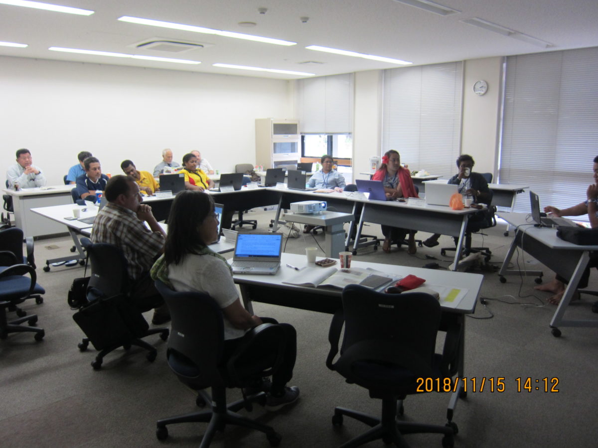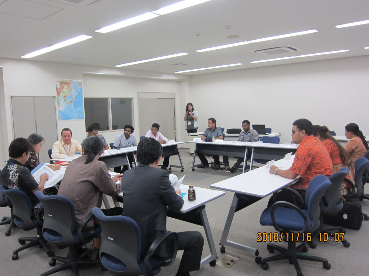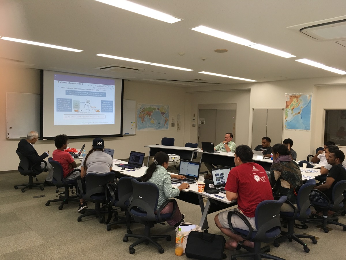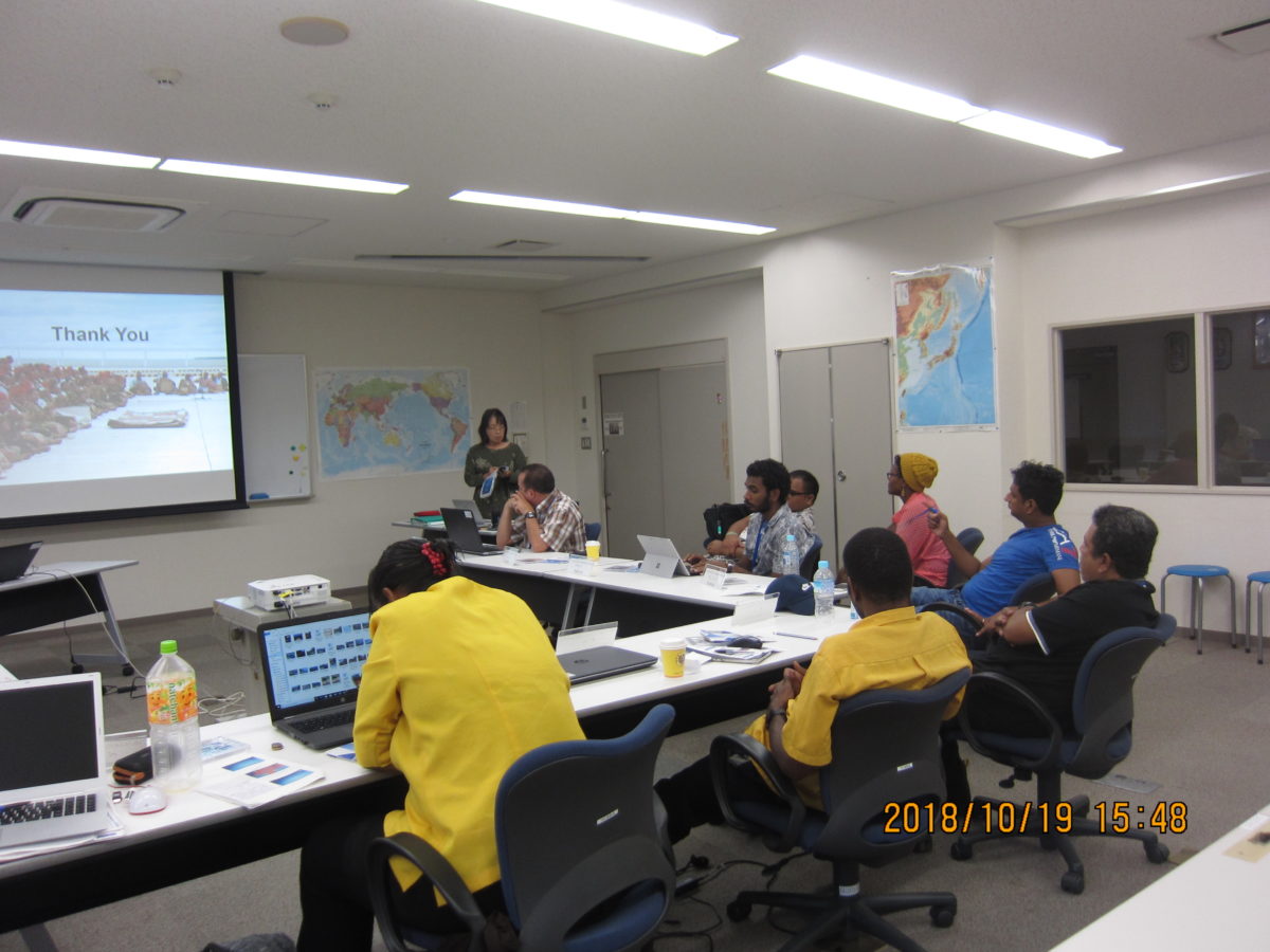 14日、15日はサマリーレポートの発表会でした。研修員がこの研修で学んだことを各自レポートに纏めて発表しました。コメンテーターとして、矢吹名誉教授(琉球大学)、藍檀教授(琉球大学)、望月企画調整官(沖縄総合事務局)、西里主任技師(沖縄県土木建築部)、及び松田課長(しまたて協会)にお越し頂き、各研修員のプレゼンに対して質疑応答をしました。各国の技術的な課題や本研修への提案も発表して頂きましたが、これからの研修会で検討して参ります。地震・津波・洪水等の災害に対する未然防止対策、備えや対応が各国共通の課題として述べられました。
