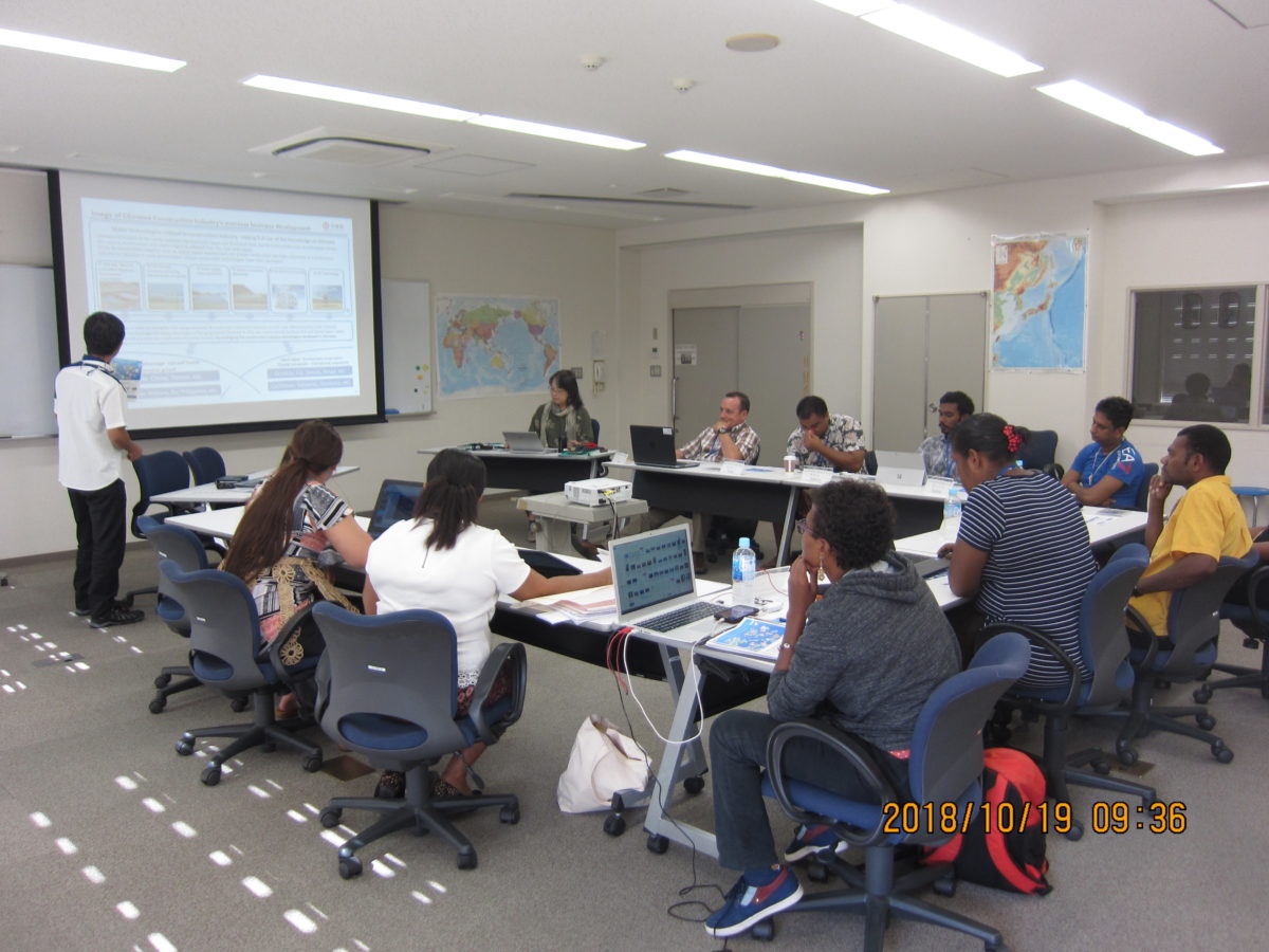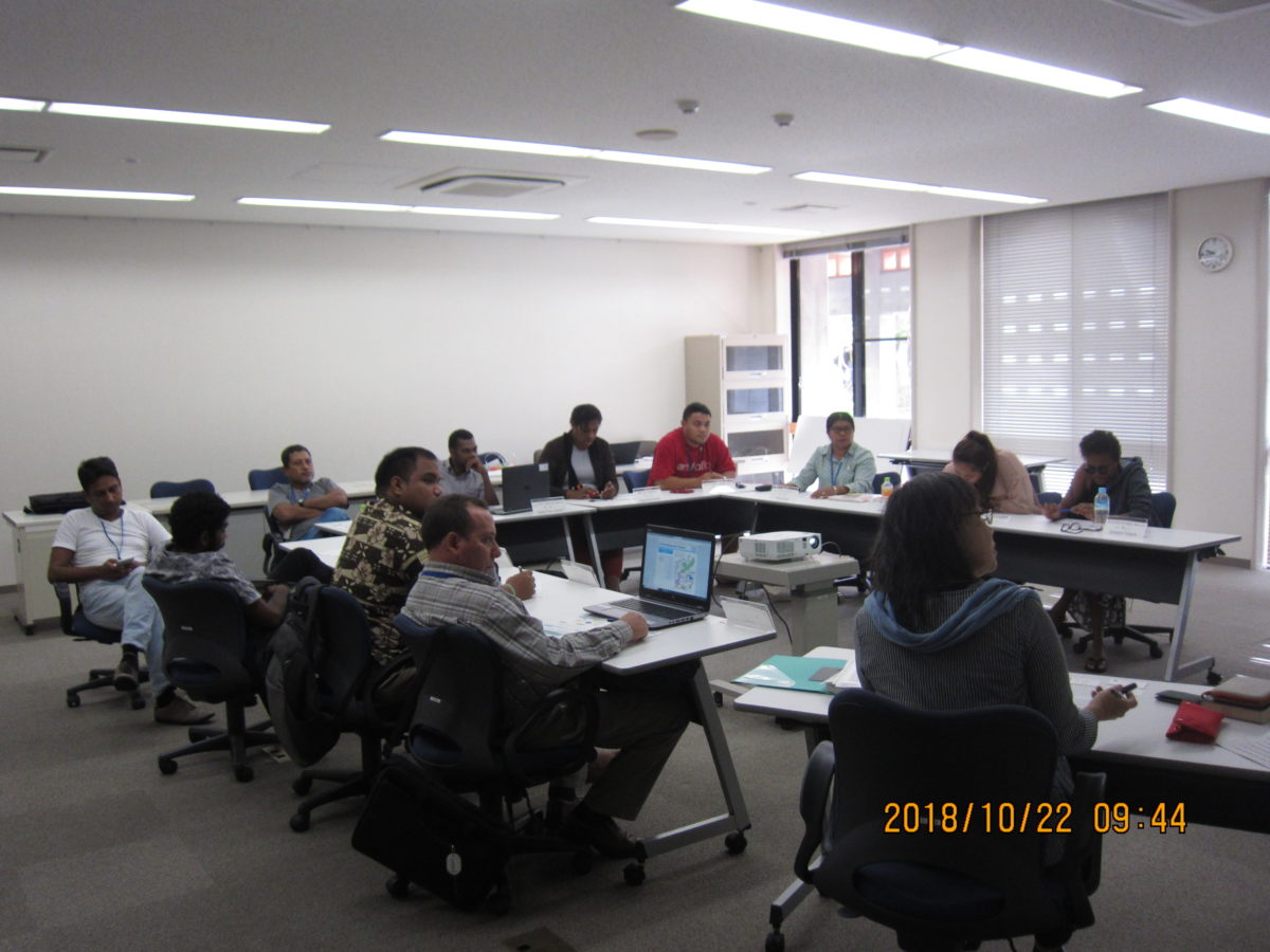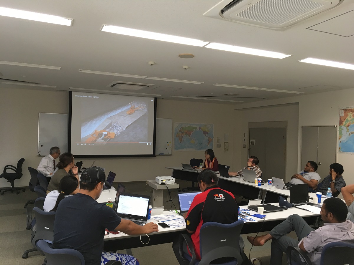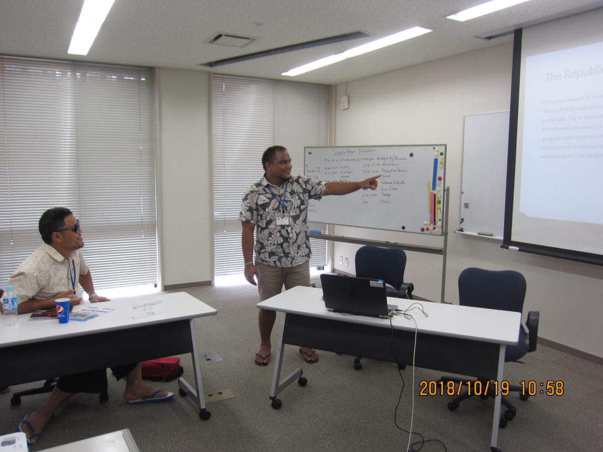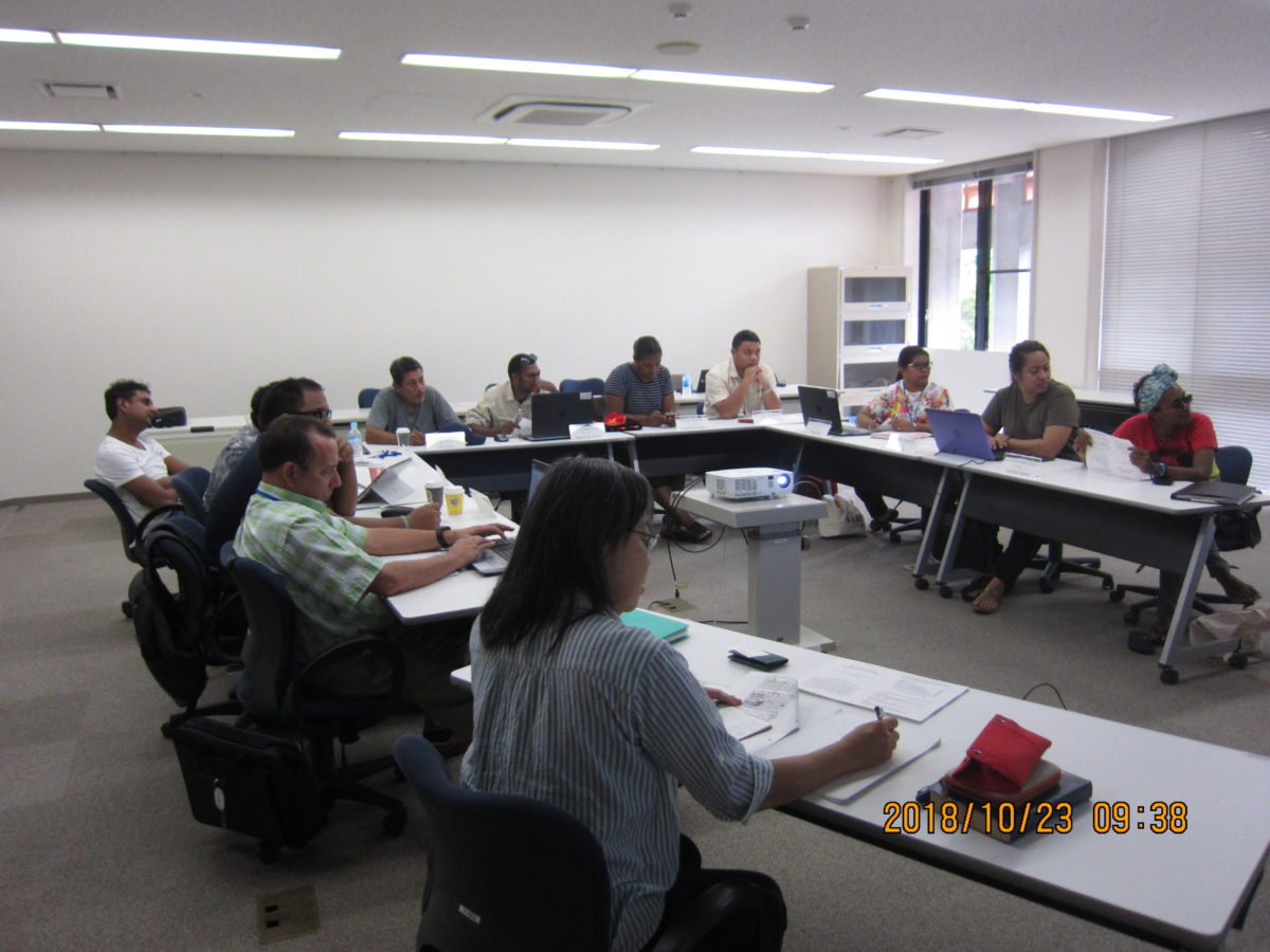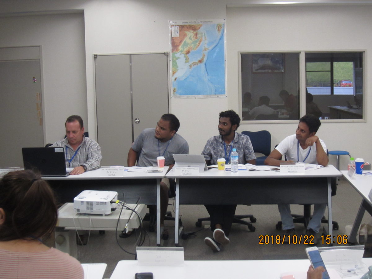 14日、15日はサマリーレポートの発表会でした。研修員がこの研修で学んだことを各自レポートに纏めて発表しました。コメンテーターとして、矢吹名誉教授(琉球大学)、藍檀教授(琉球大学)、望月企画調整官(沖縄総合事務局)、西里主任技師(沖縄県土木建築部)、及び松田課長(しまたて協会)にお越し頂き、各研修員のプレゼンに対して質疑応答をしました。各国の技術的な課題や本研修への提案も発表して頂きましたが、これからの研修会で検討して参ります。地震・津波・洪水等の災害に対する未然防止対策、備えや対応が各国共通の課題として述べられました。