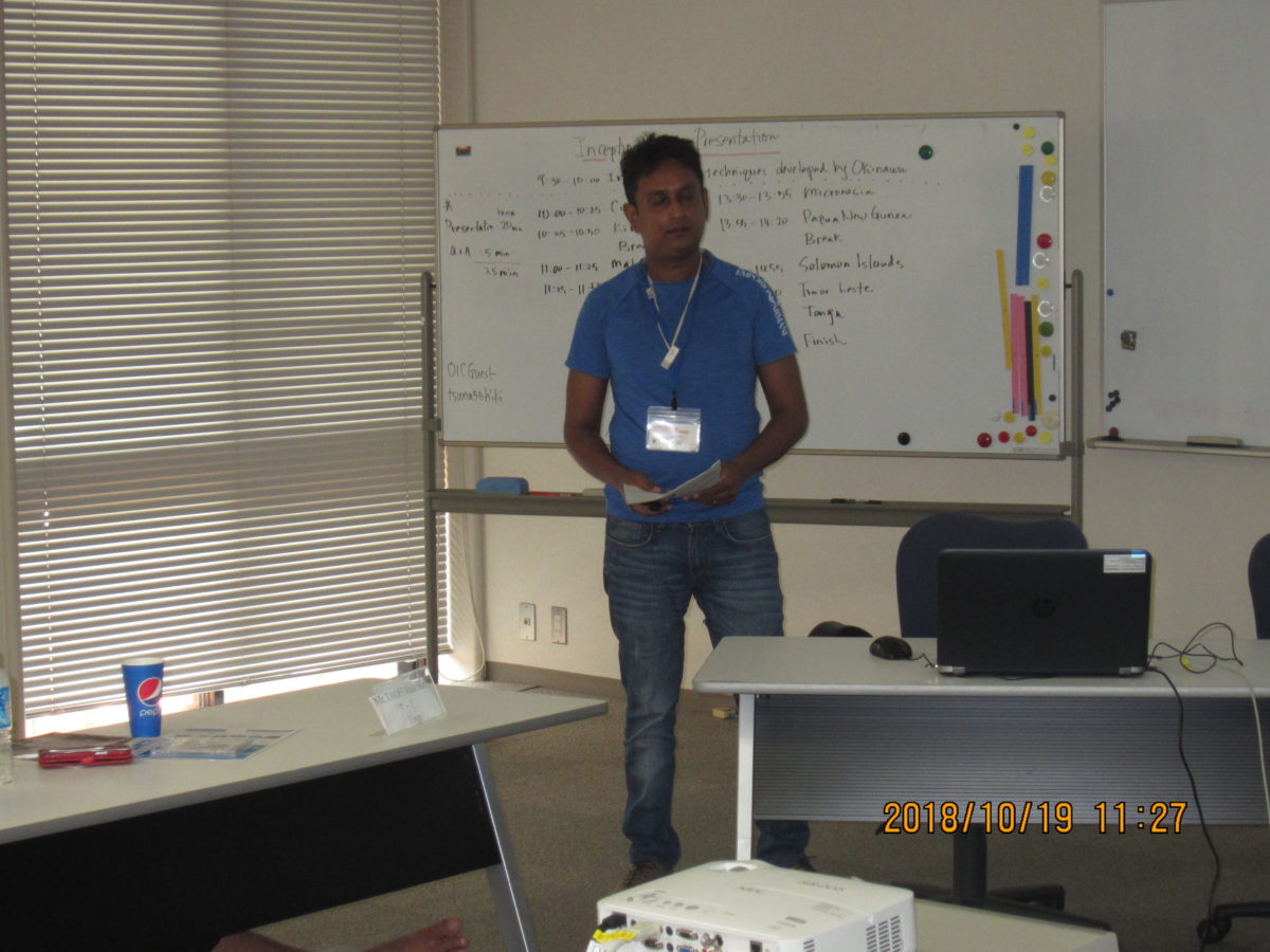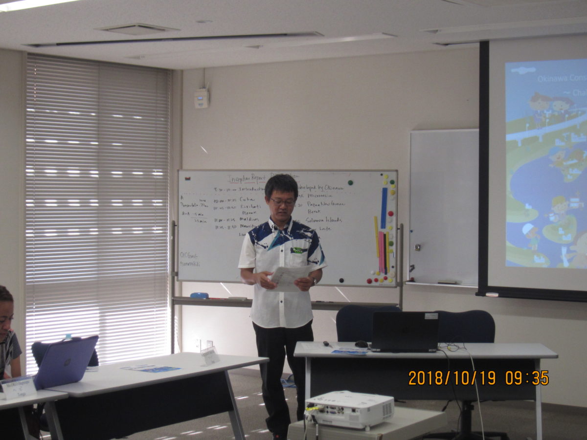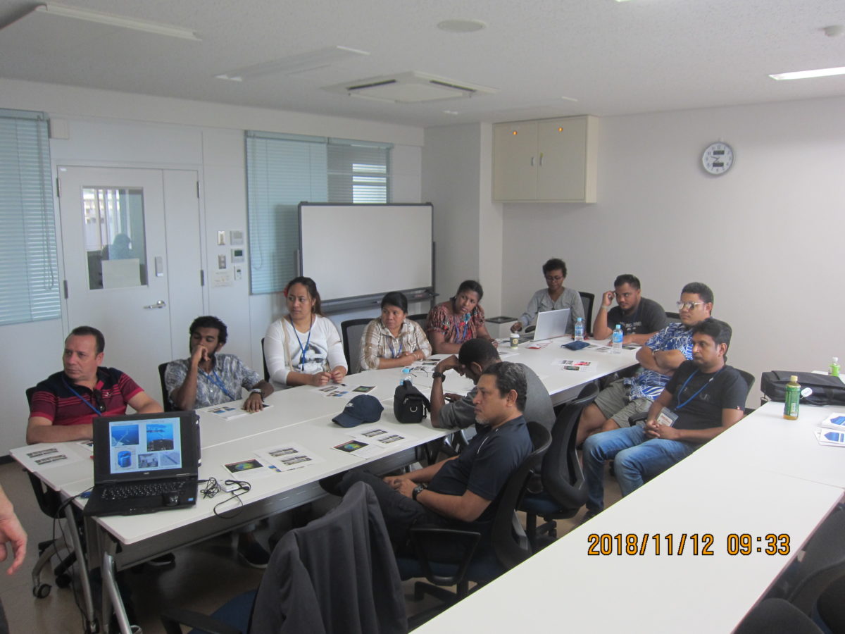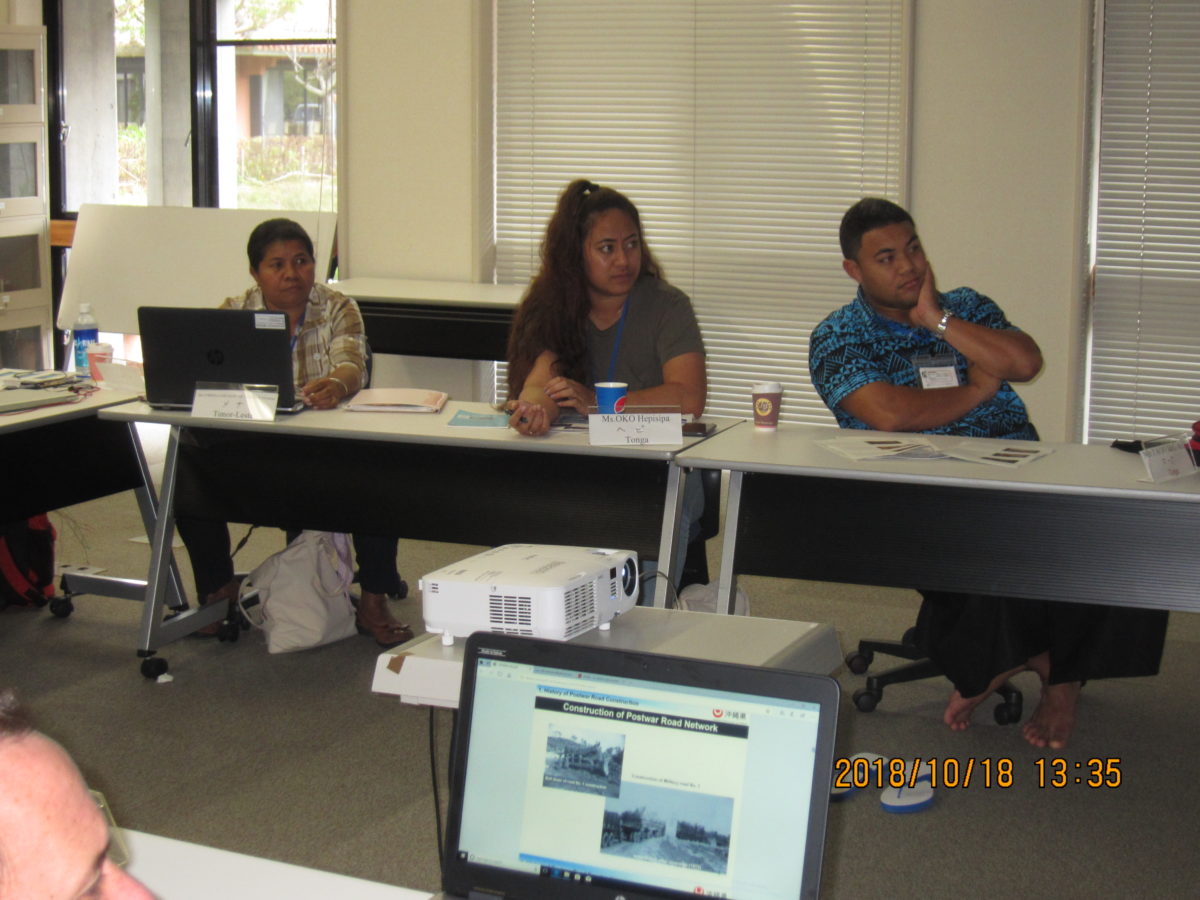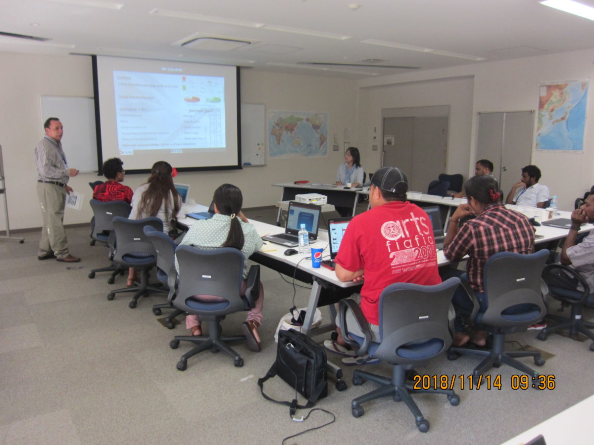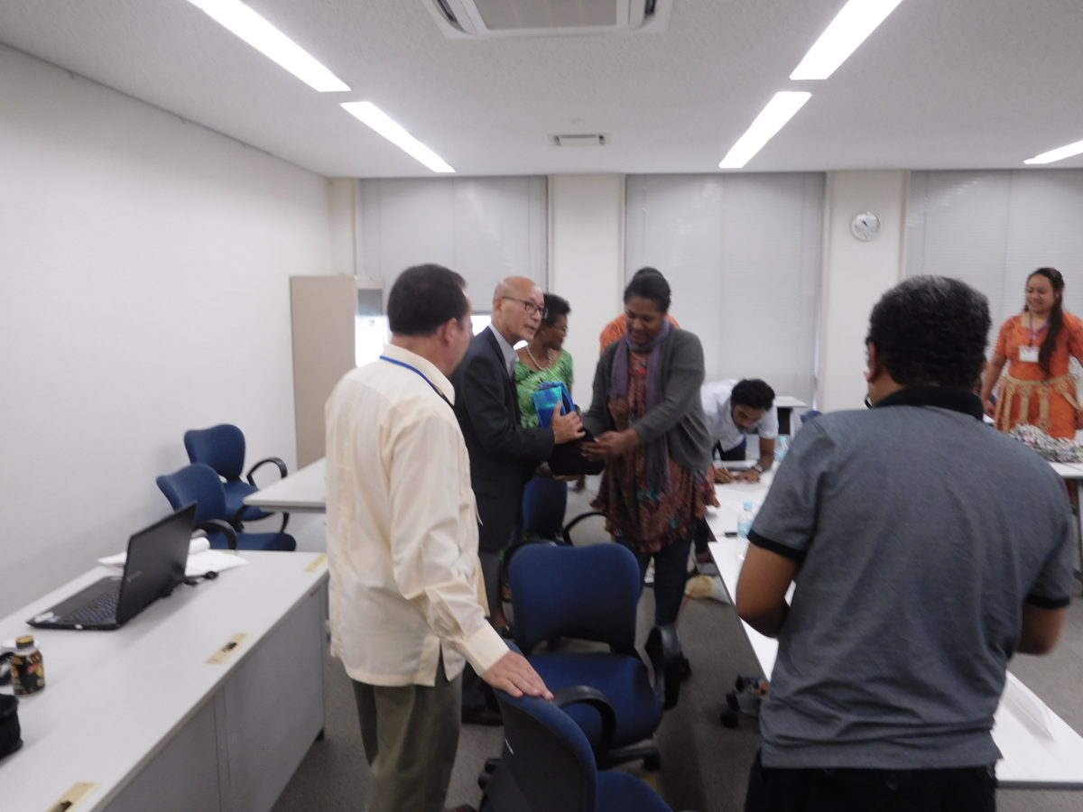 14日、15日はサマリーレポートの発表会でした。研修員がこの研修で学んだことを各自レポートに纏めて発表しました。コメンテーターとして、矢吹名誉教授(琉球大学)、藍檀教授(琉球大学)、望月企画調整官(沖縄総合事務局)、西里主任技師(沖縄県土木建築部)、及び松田課長(しまたて協会)にお越し頂き、各研修員のプレゼンに対して質疑応答をしました。各国の技術的な課題や本研修への提案も発表して頂きましたが、これからの研修会で検討して参ります。地震・津波・洪水等の災害に対する未然防止対策、備えや対応が各国共通の課題として述べられました。