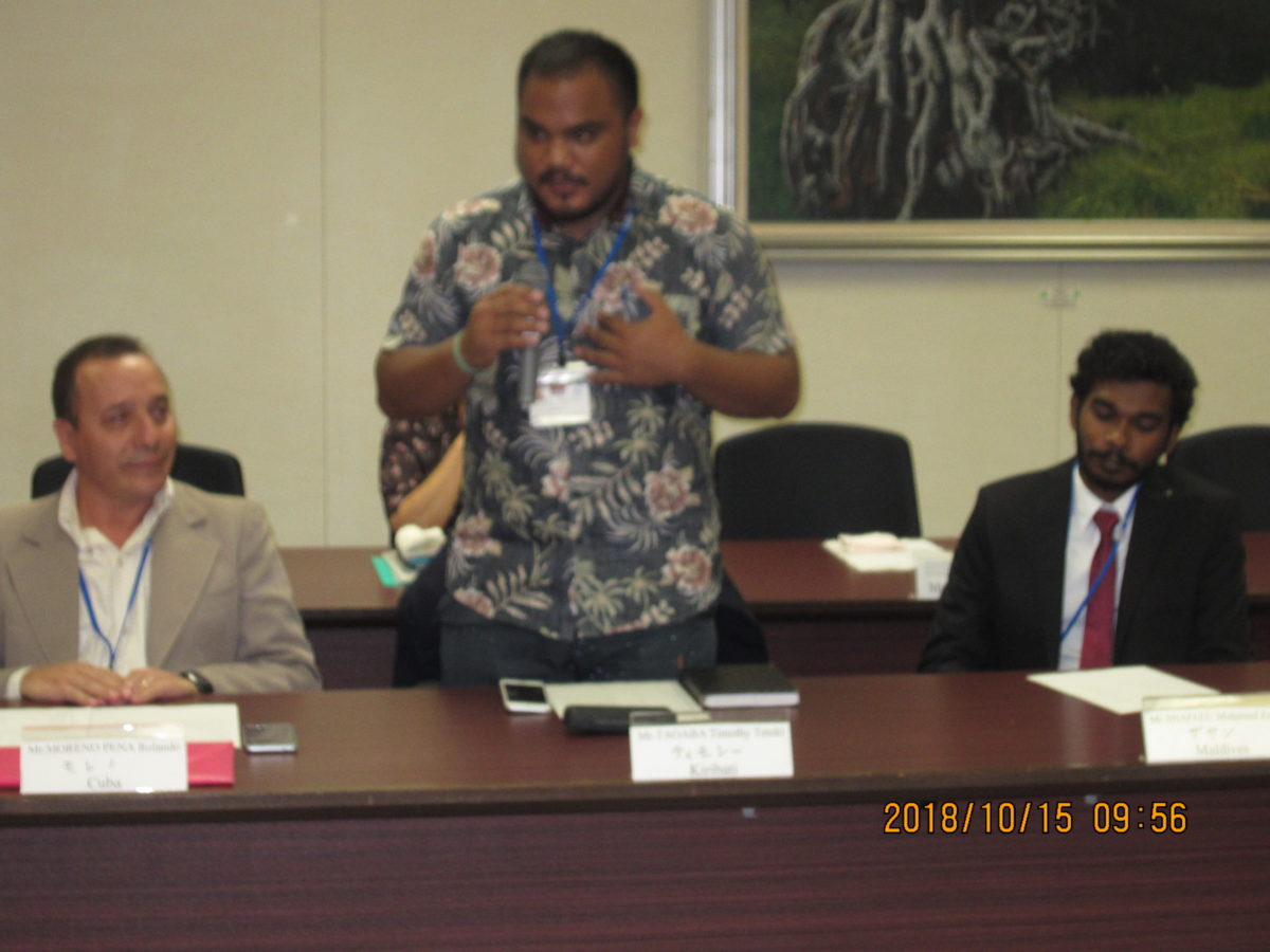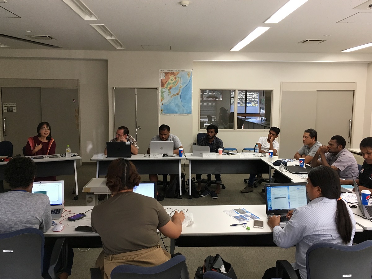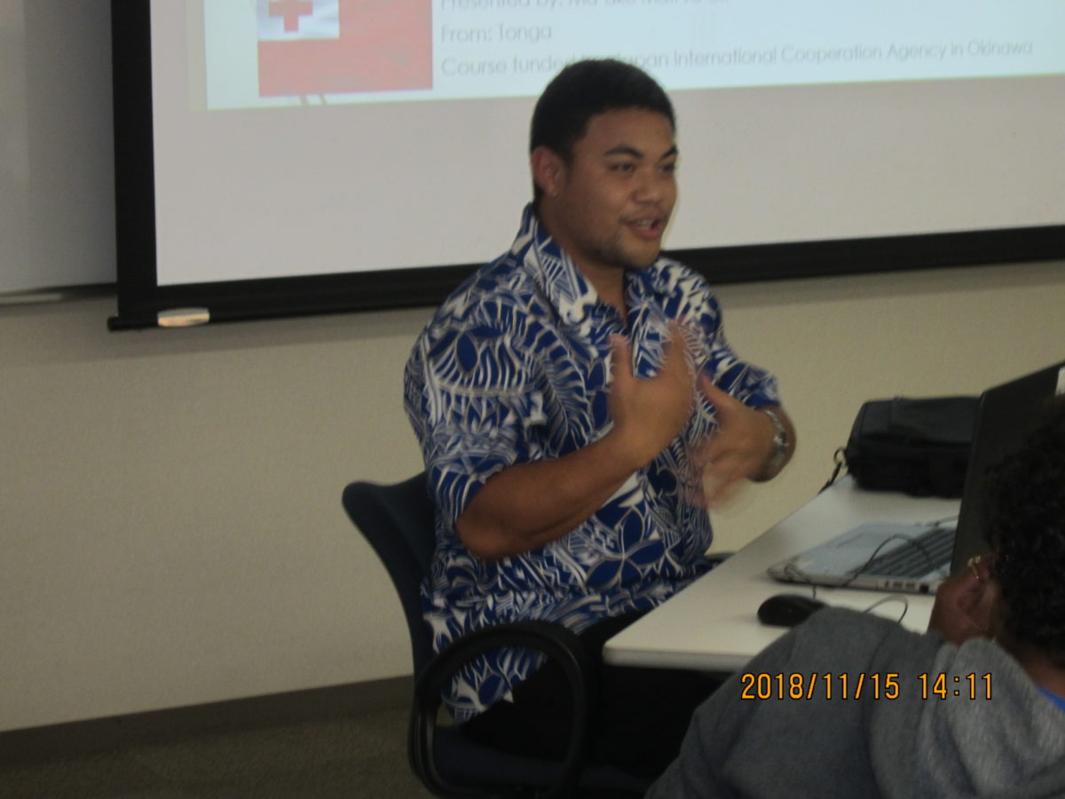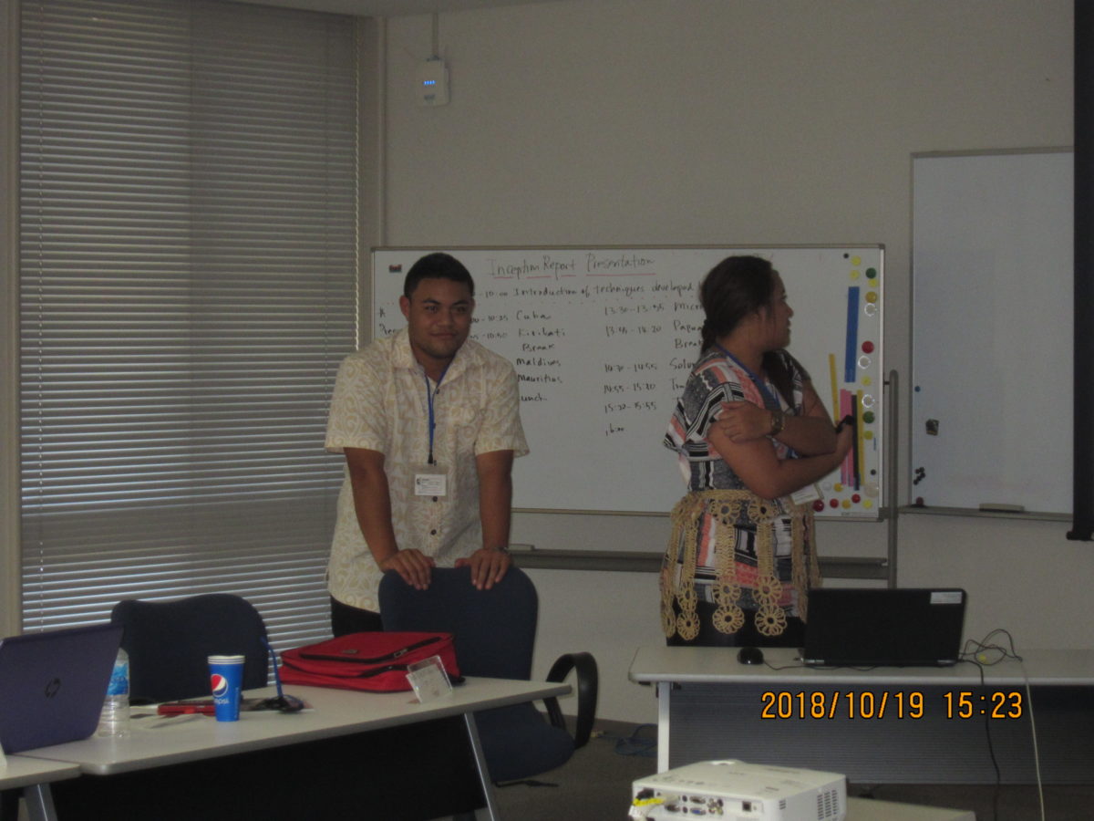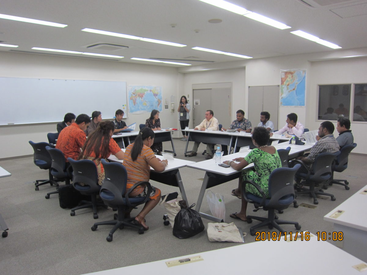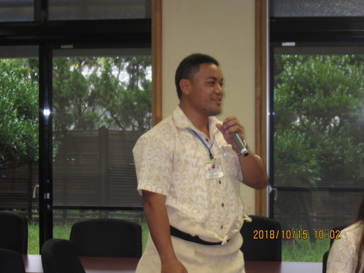 14日、15日はサマリーレポートの発表会でした。研修員がこの研修で学んだことを各自レポートに纏めて発表しました。コメンテーターとして、矢吹名誉教授(琉球大学)、藍檀教授(琉球大学)、望月企画調整官(沖縄総合事務局)、西里主任技師(沖縄県土木建築部)、及び松田課長(しまたて協会)にお越し頂き、各研修員のプレゼンに対して質疑応答をしました。各国の技術的な課題や本研修への提案も発表して頂きましたが、これからの研修会で検討して参ります。地震・津波・洪水等の災害に対する未然防止対策、備えや対応が各国共通の課題として述べられました。