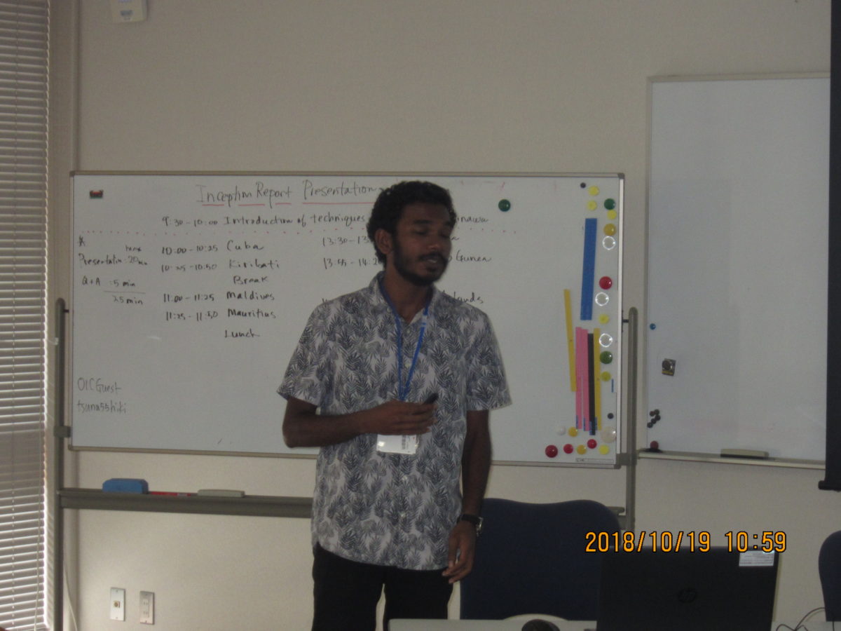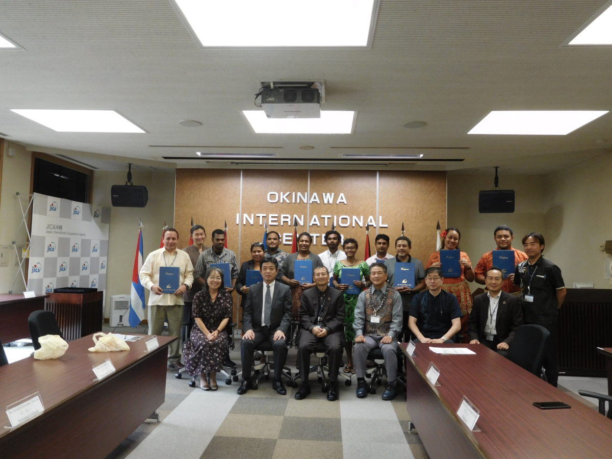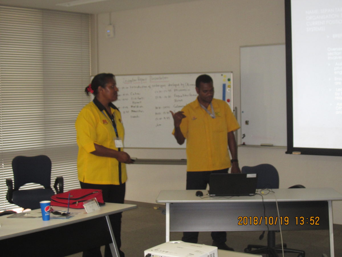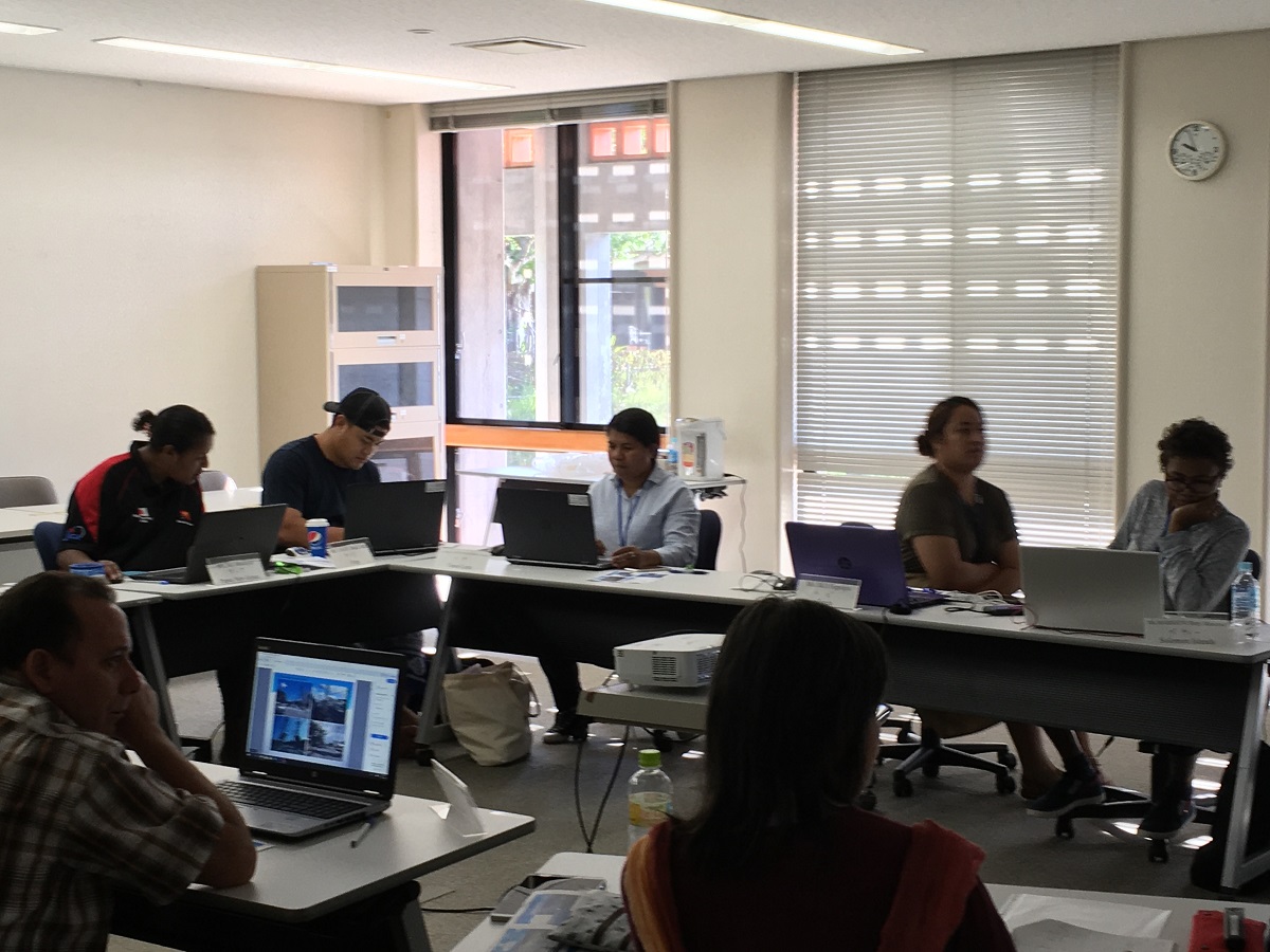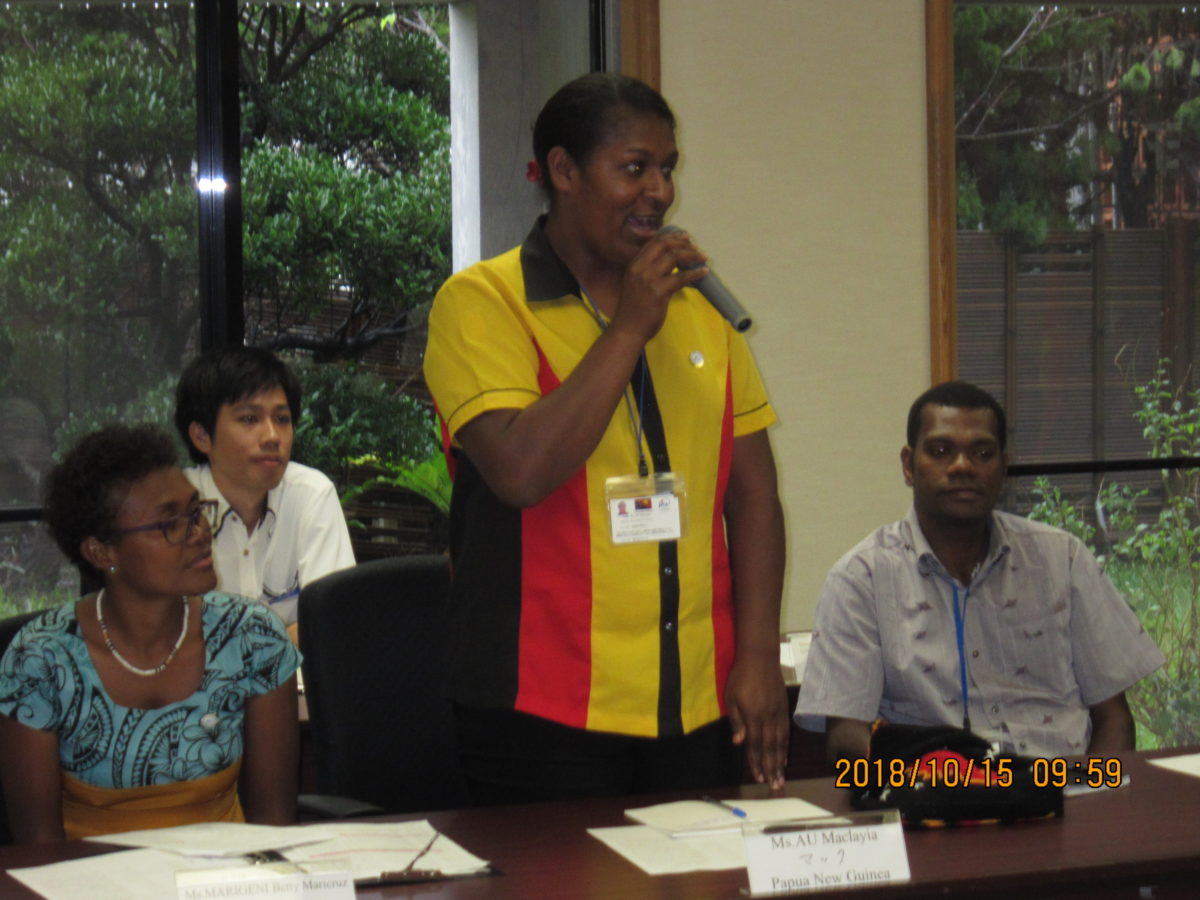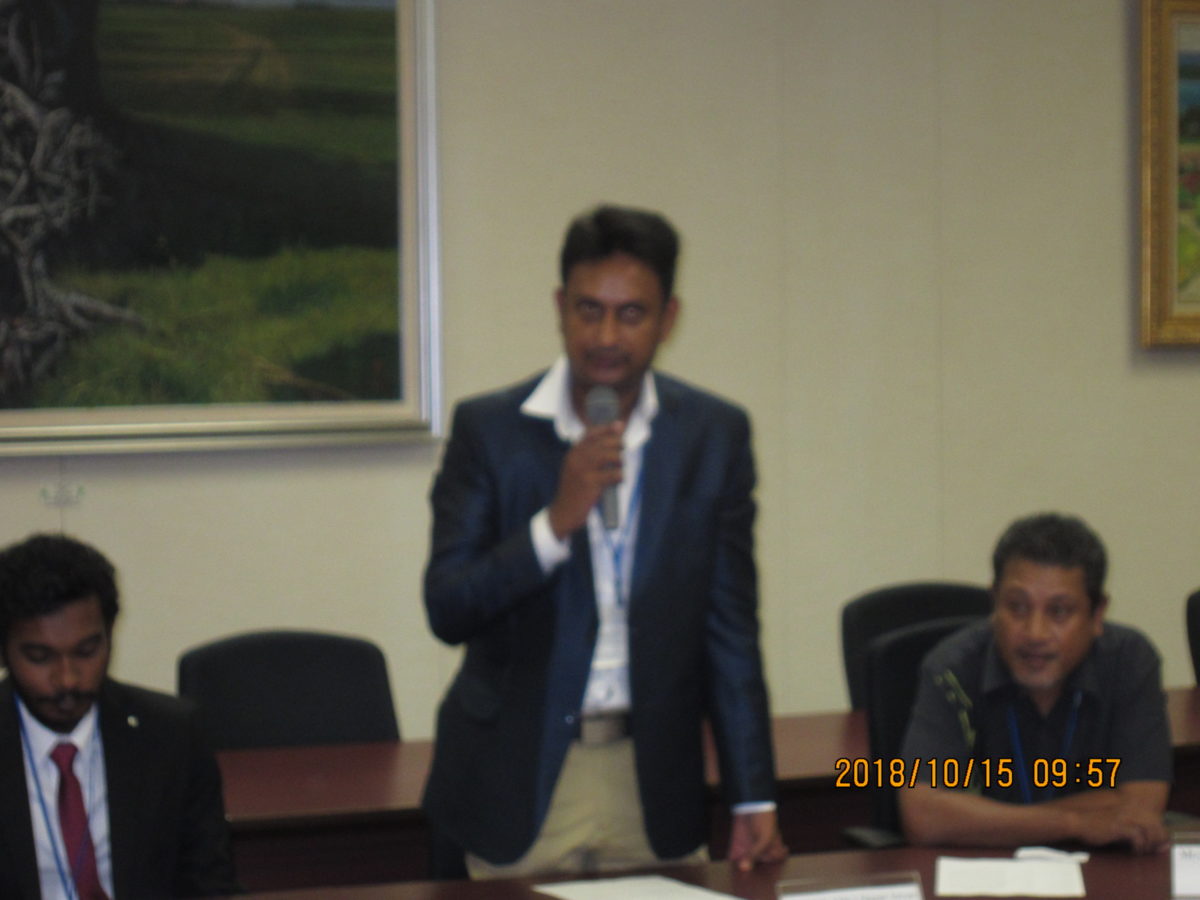 14日、15日はサマリーレポートの発表会でした。研修員がこの研修で学んだことを各自レポートに纏めて発表しました。コメンテーターとして、矢吹名誉教授(琉球大学)、藍檀教授(琉球大学)、望月企画調整官(沖縄総合事務局)、西里主任技師(沖縄県土木建築部)、及び松田課長(しまたて協会)にお越し頂き、各研修員のプレゼンに対して質疑応答をしました。各国の技術的な課題や本研修への提案も発表して頂きましたが、これからの研修会で検討して参ります。地震・津波・洪水等の災害に対する未然防止対策、備えや対応が各国共通の課題として述べられました。