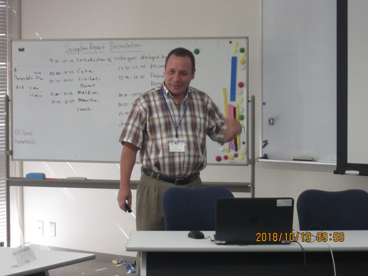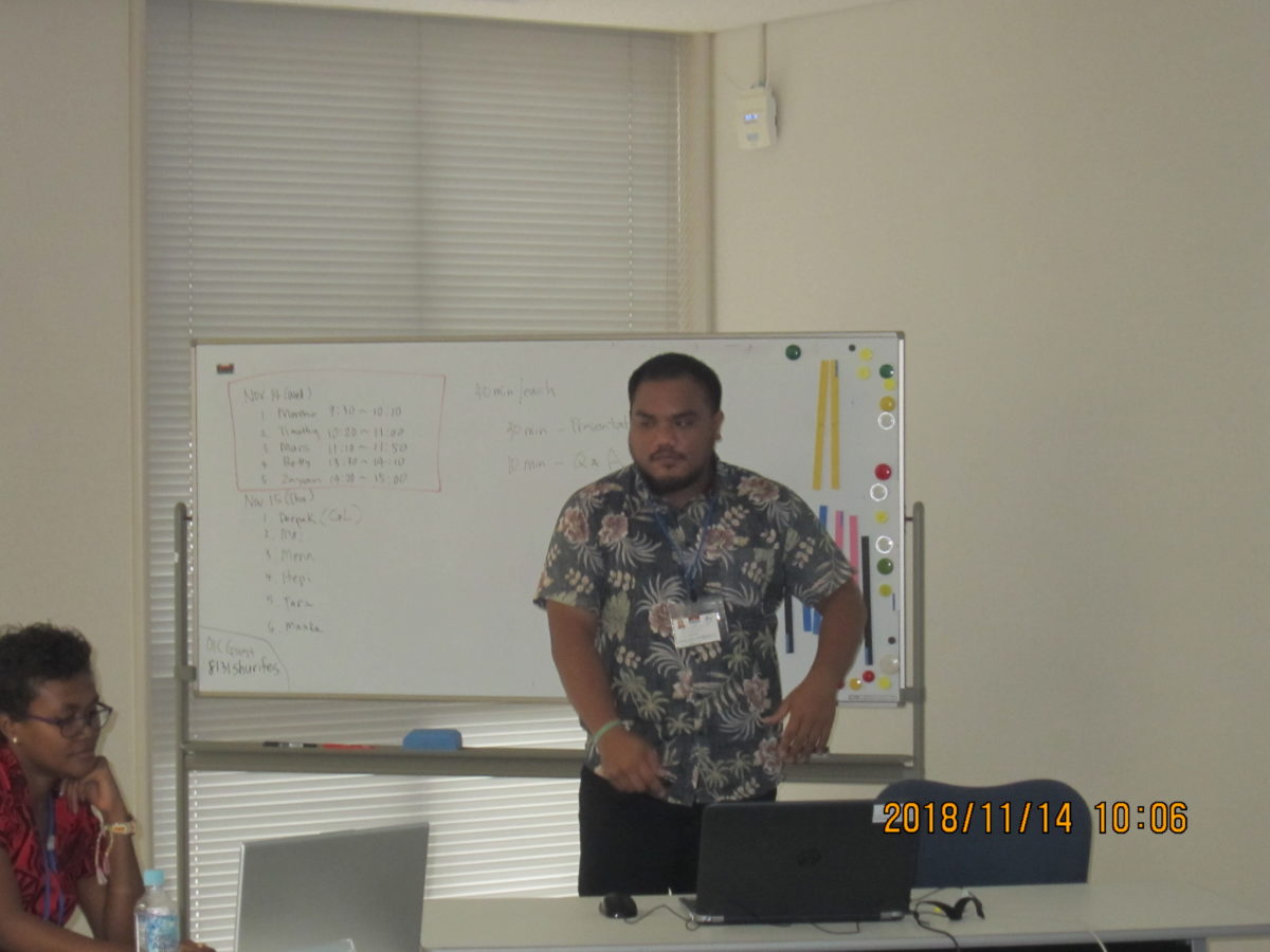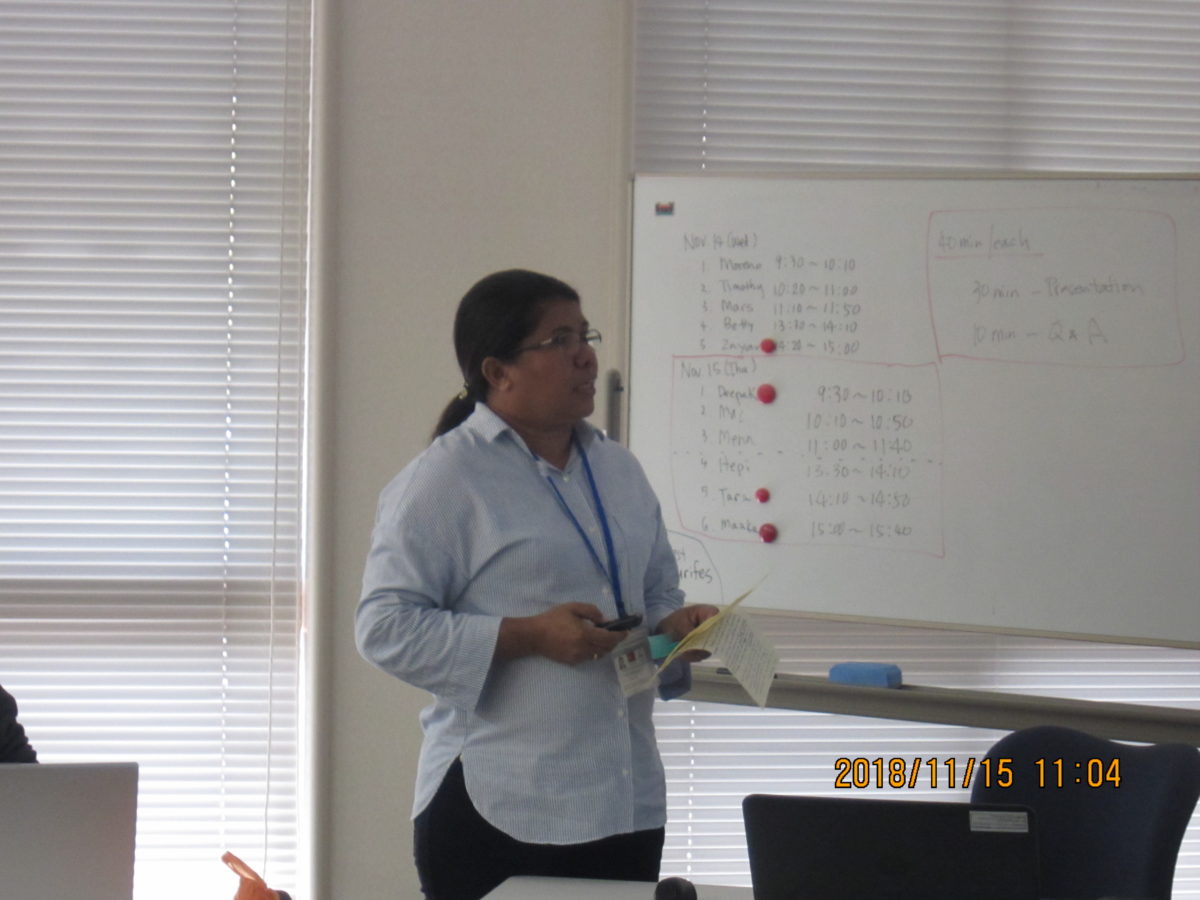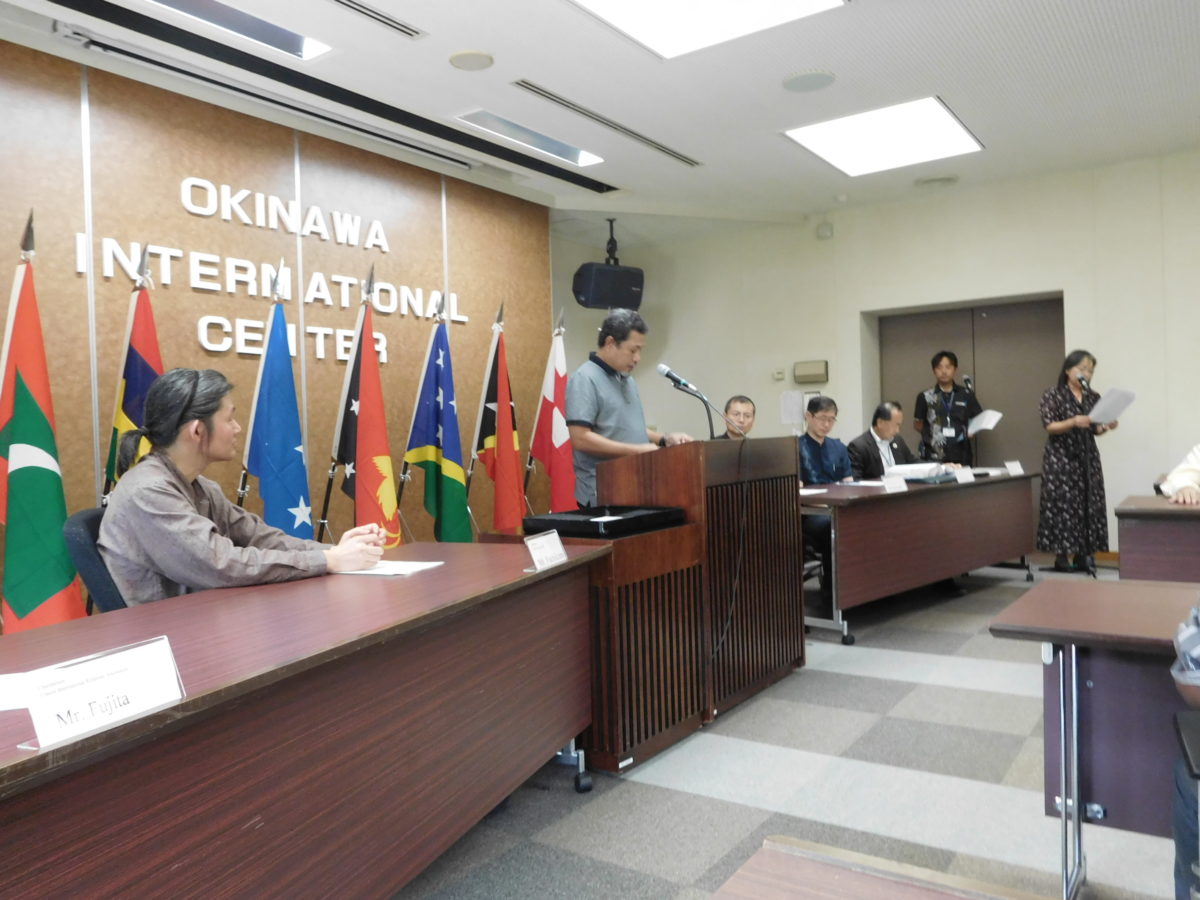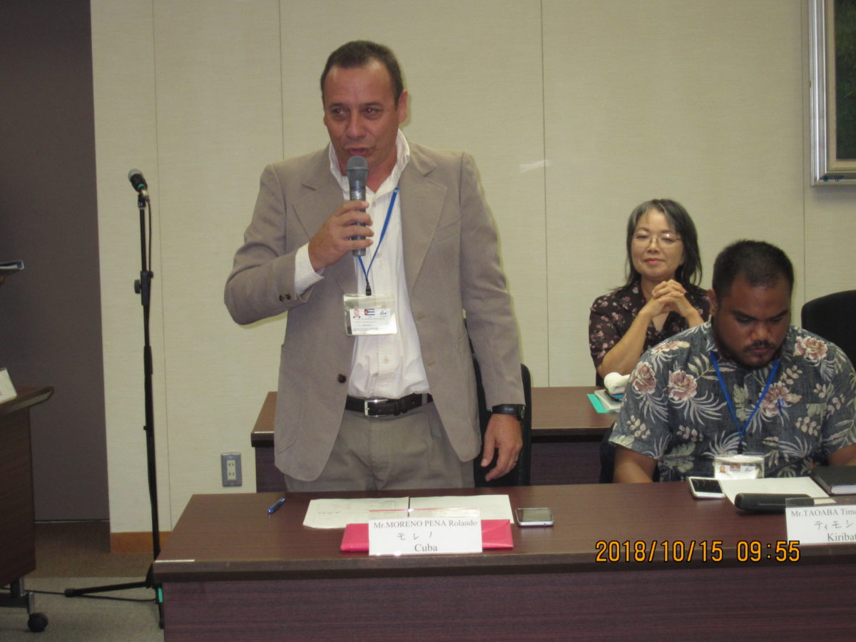 14日、15日はサマリーレポートの発表会でした。研修員がこの研修で学んだことを各自レポートに纏めて発表しました。コメンテーターとして、矢吹名誉教授(琉球大学)、藍檀教授(琉球大学)、望月企画調整官(沖縄総合事務局)、西里主任技師(沖縄県土木建築部)、及び松田課長(しまたて協会)にお越し頂き、各研修員のプレゼンに対して質疑応答をしました。各国の技術的な課題や本研修への提案も発表して頂きましたが、これからの研修会で検討して参ります。地震・津波・洪水等の災害に対する未然防止対策、備えや対応が各国共通の課題として述べられました。