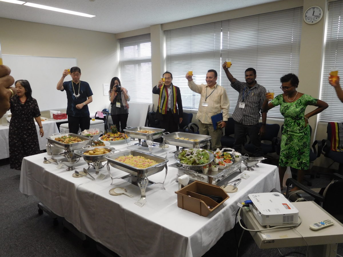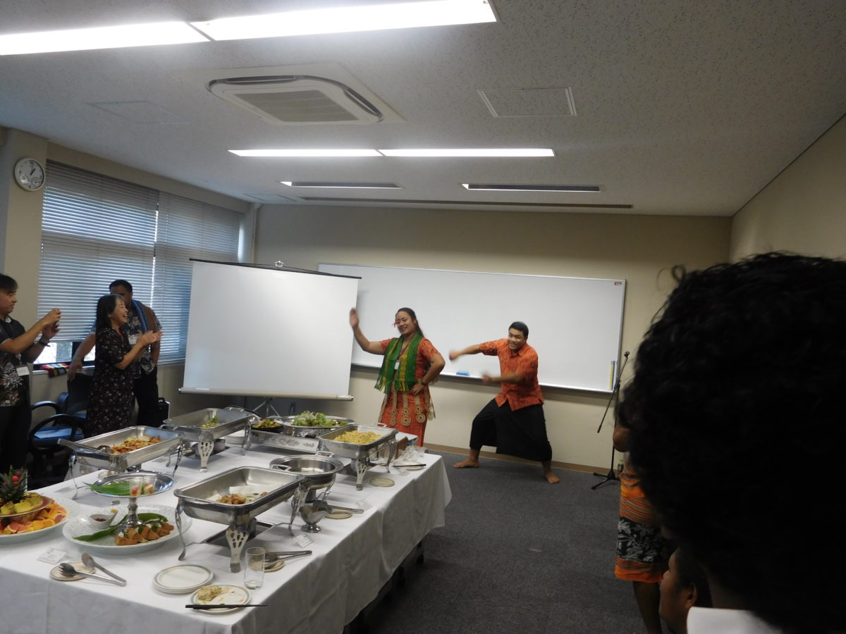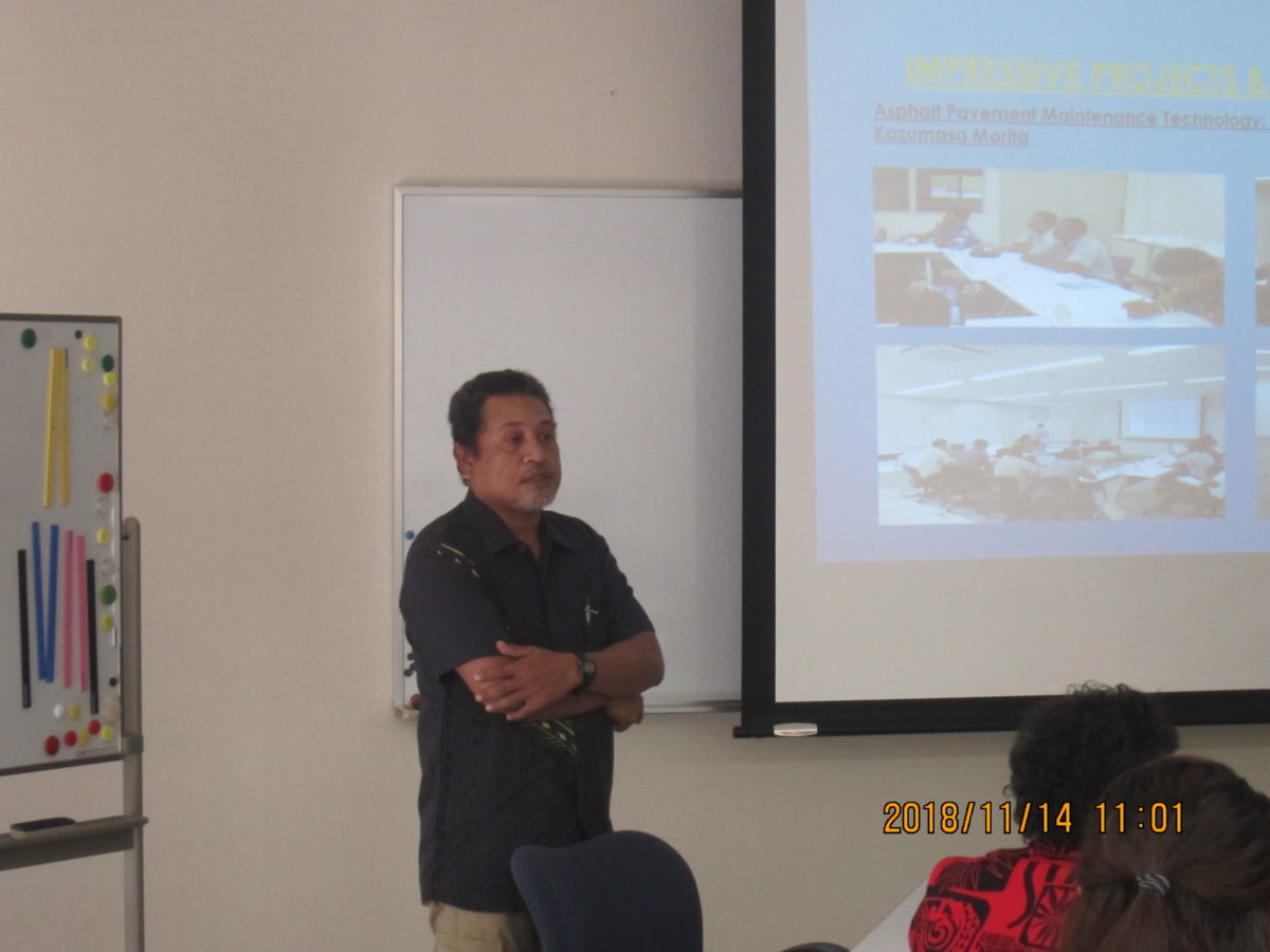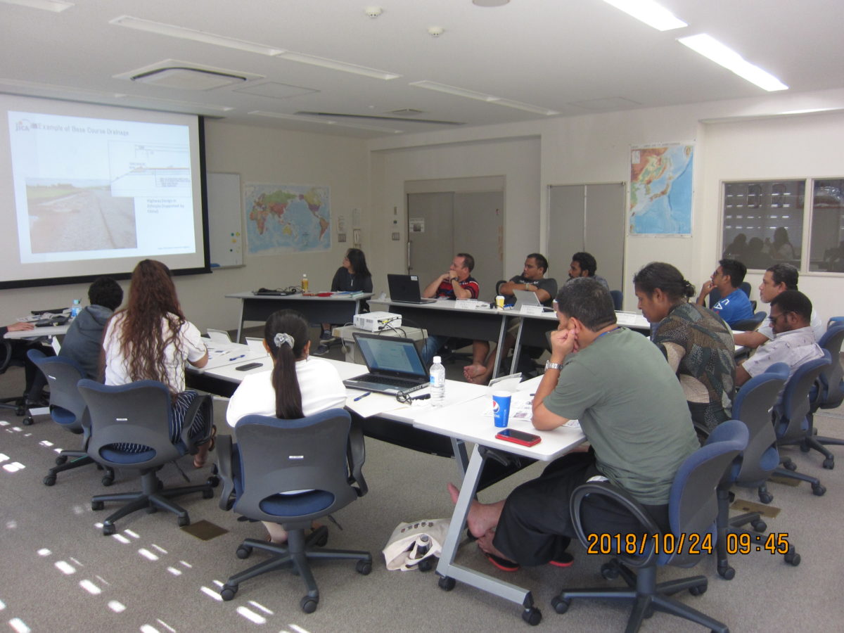 昨日で全ての研修プログラムが終了し、本日は朝10時から「Evaluation Meeting」と称し、各研修員から本コースに対する評価を聞きました。研修は満足度の高い評価を受けると同時に、さらに詳細な分野の研修コース(廃棄物処理、ドローン&3D、交通計画、構造物設計計算、現場安全管理 など)の創設を望む声が寄せられました。11:30からは閉講式を行い、その後閉講パーティが行われました。研修中の写真で作成したスライドショーやトンガの踊りなどが披露され、思い出に残るとても楽しい時間を過ごすことができました。