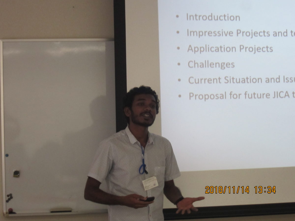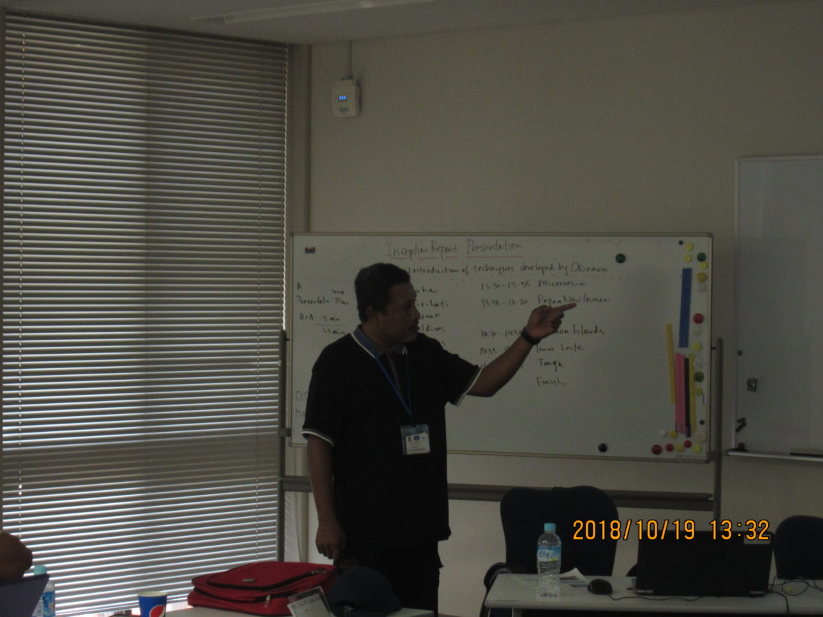 We spent two days for presentation of participants' summary reports. They summarized what they have learnt during this training in the report and presented to audience. The audience who were invited to give comments and questions to the presentations were Hon. Prof. Yabuki (University of the Ryukyus), Prof. Aydan (University of the Ryukyus), Mr. Mochizuki (Senior Officer for Planning and Coordination at Okianwa General Bureau), Mr. Nishizato (Chief Engineer at Civil Engineering Dept., Okinawa Pref. Gov.), and Mr. Matsuda (Director of Planning Section, Okinawa Shimatate Association). The reports also included the technical issues of each country and suggestions to this training which will be reflected to the future curriculum. We found that the preventive measures, preparedness and response for disasters, e.g. earthquake, tsunami, and flood, were thecommon issue for many countries.