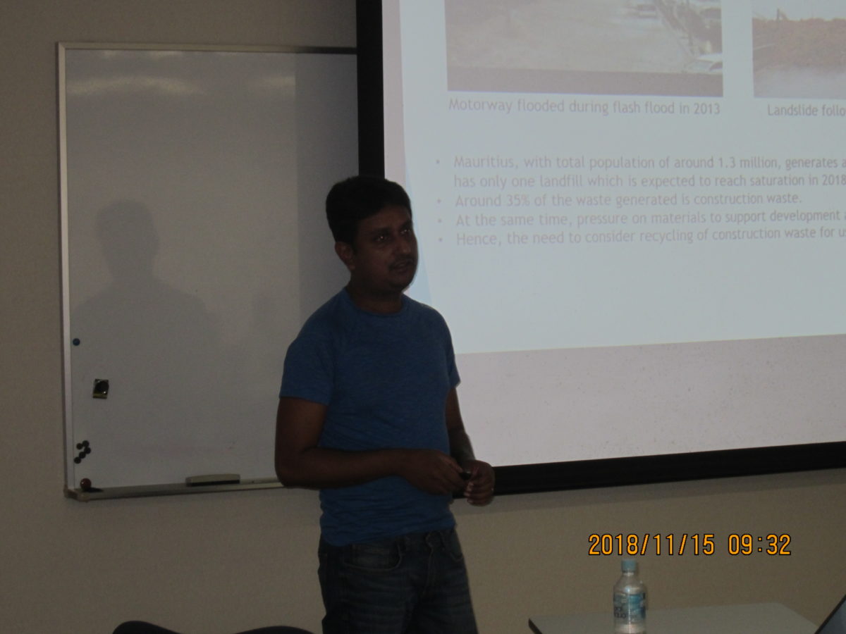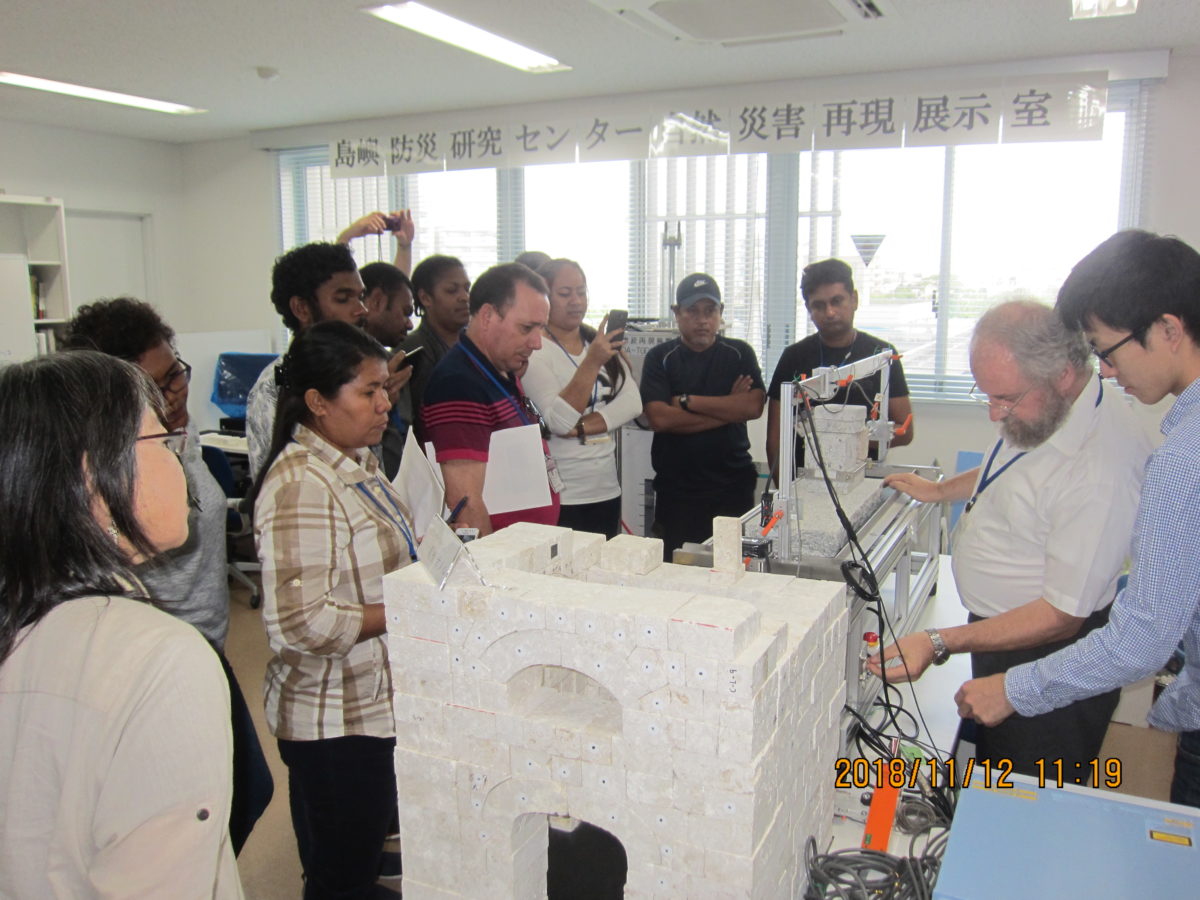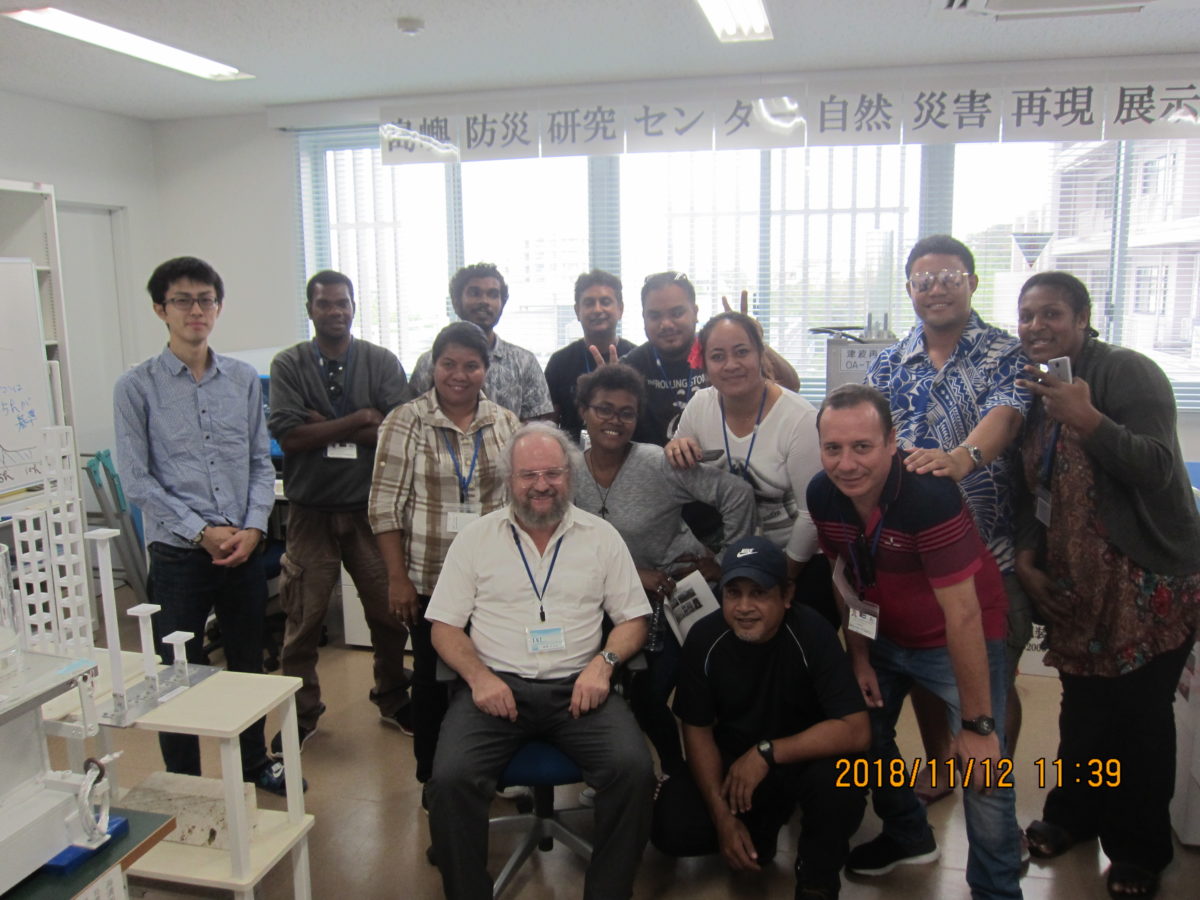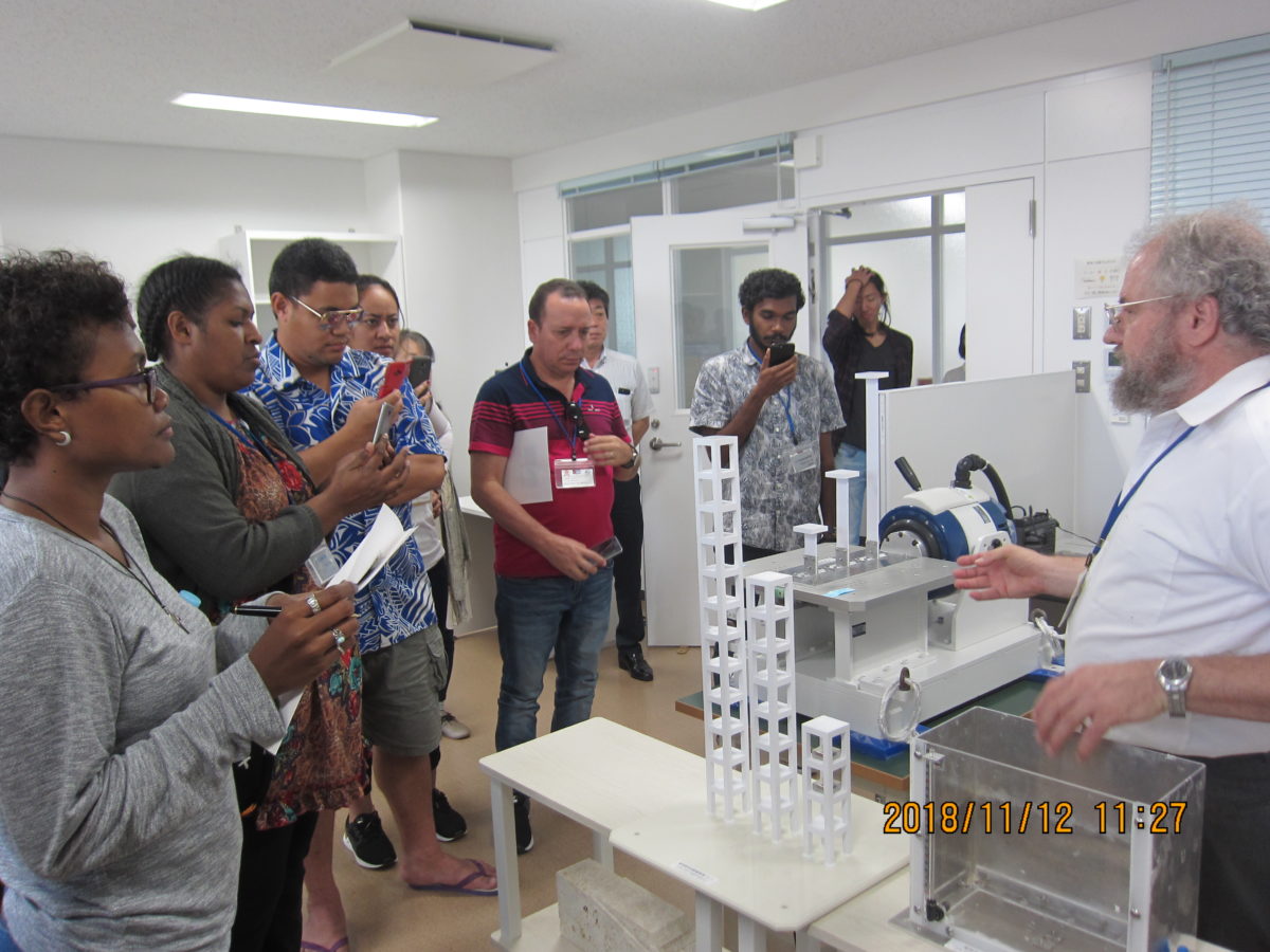 午前は、琉球大学地域創生総合研究棟会議室で「道路工学Ⅱ」藍檀オメル教授の講義でした。道路を中心にした橋、トンネル、法面や盛土等の日本や世界各国の被害状況を写真で数多く紹介し、道路メンテナンスの課題、非破壊試験、及び有限要素法やドローンを活用した新たな設計方法等の事例を示しながら解説しました。後半は、地震、津波等の発生を再現できる実証設備に移動し、いろんなシミュレーションを行って頂きました。