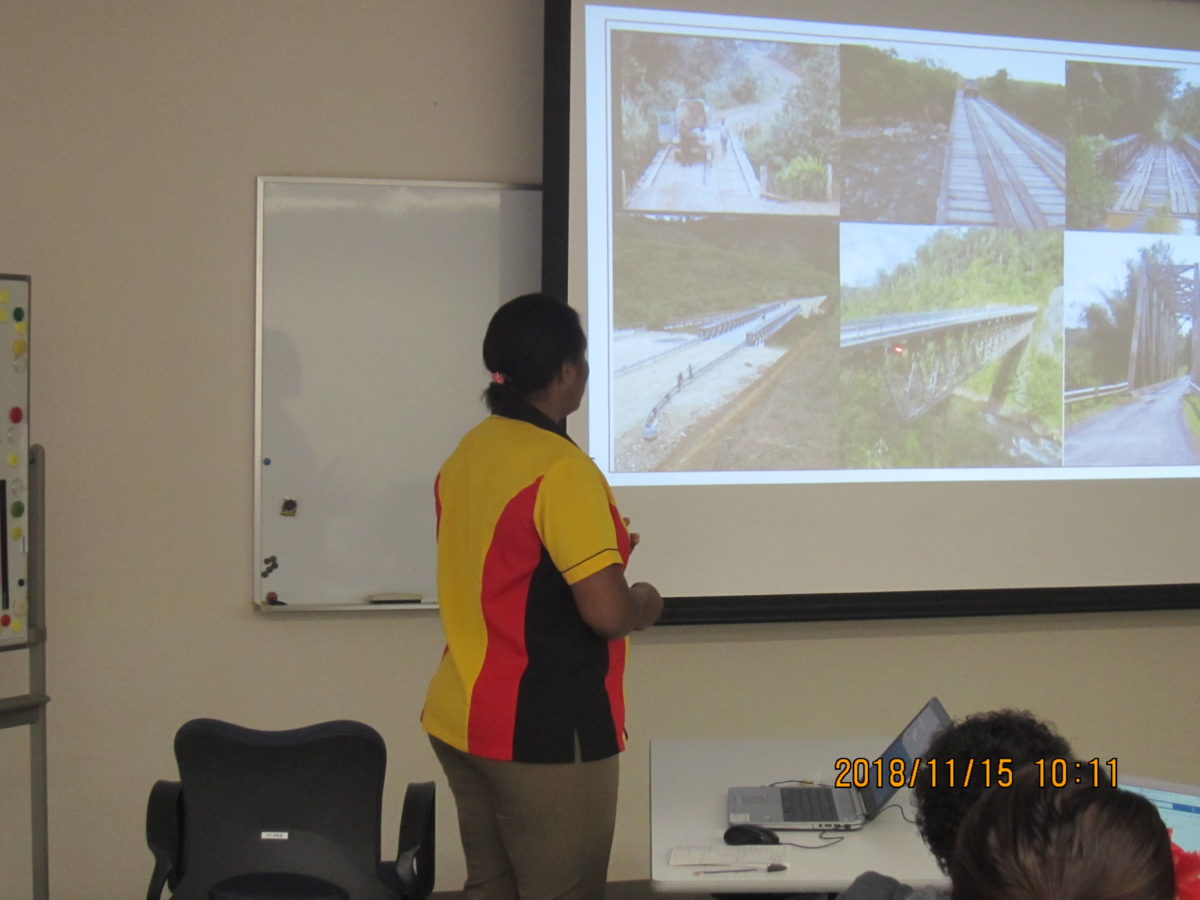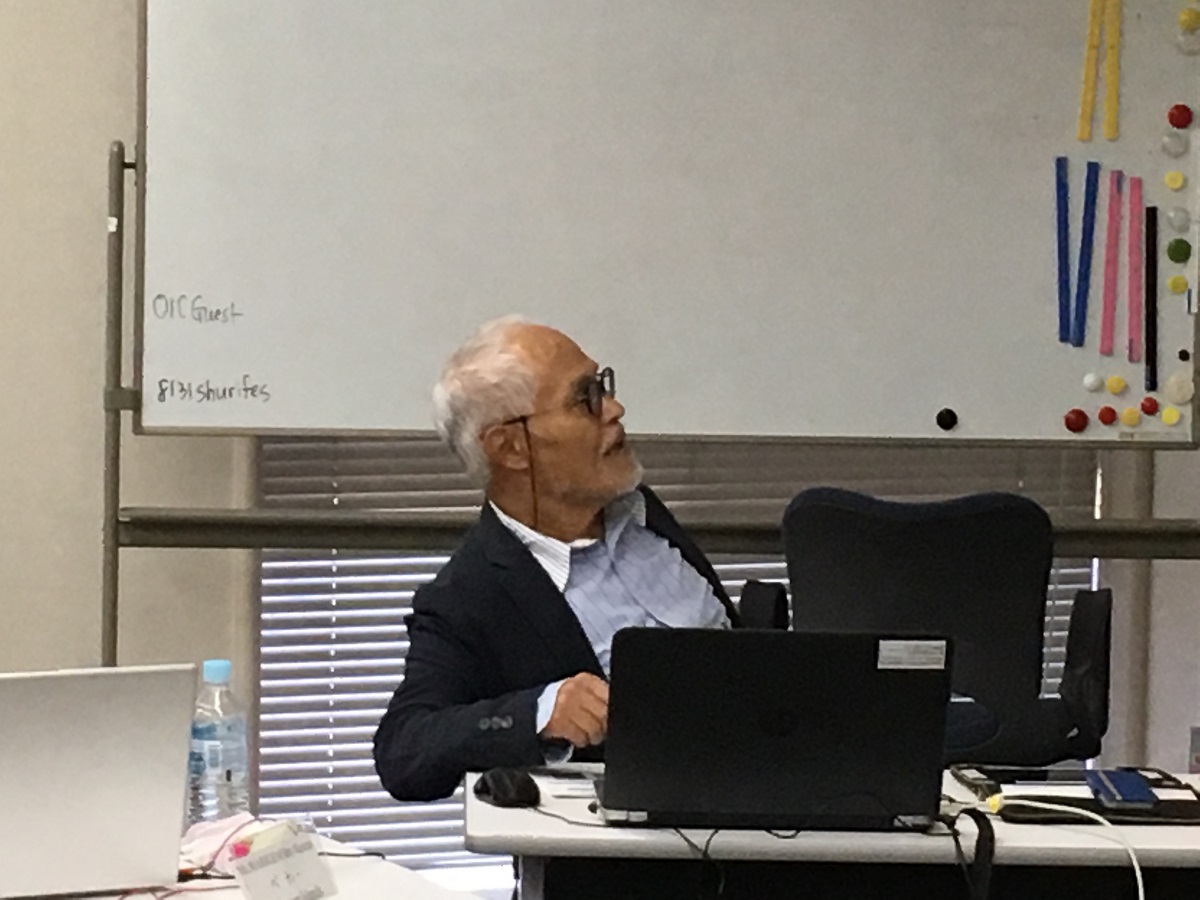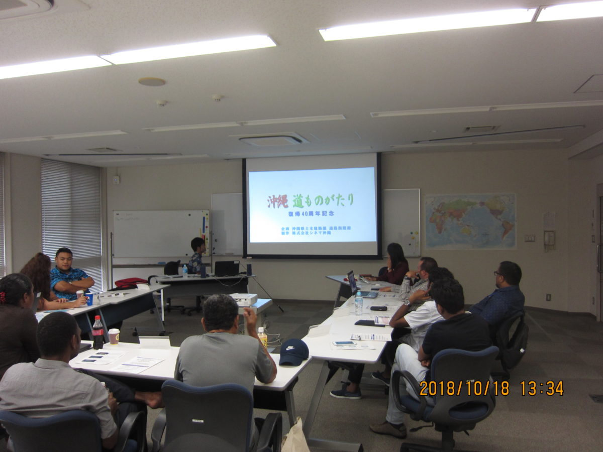 午後は沖縄県土木建築部道路街路課企画調整班の稲主任によるテーマ「沖縄県の道路整備の歴史、今後の道路計画」の講義で、まず「沖縄道ものがたり」のビデオをCDN照屋さんの英訳で視聴しました。その後、沖縄県の戦後の日本復帰後に行った道路整備状況と、今後のビジョン等の説明を聞きました。