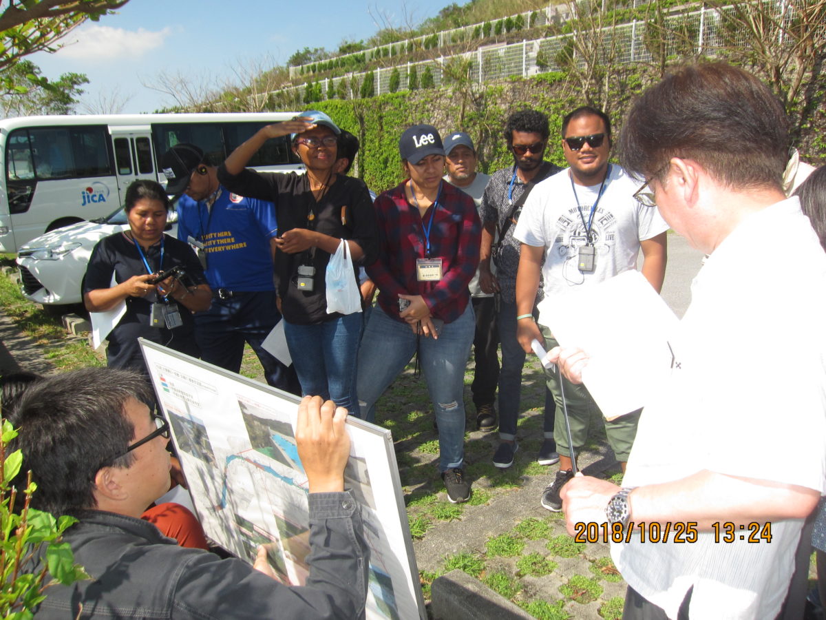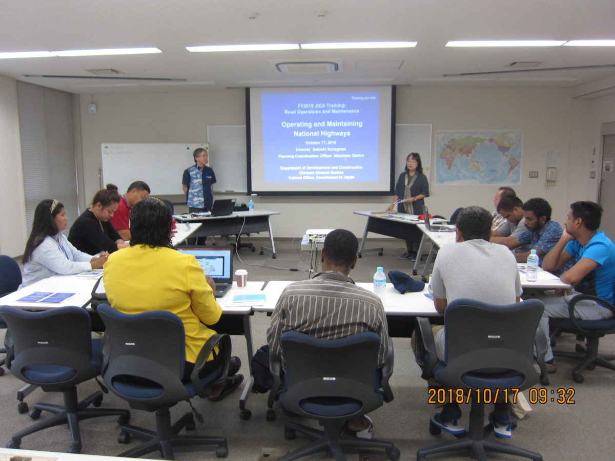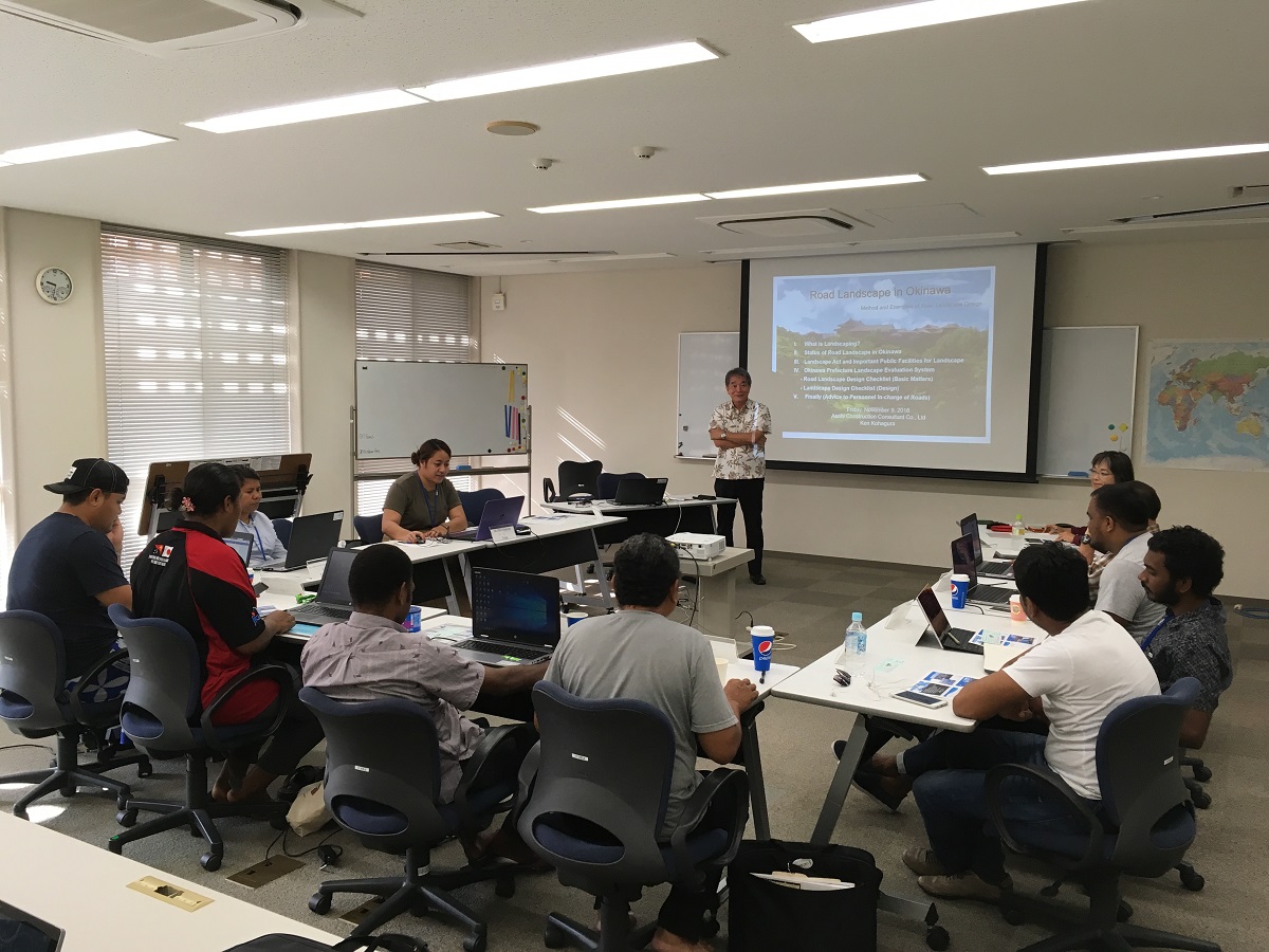午前は沖縄県土木建築部道路管理課の長嶺主任技師、小波津主査、及び川上主任から「沖縄県の道路維持管理業務」テーマに講義を受けました。沖縄県の道路とその管理体制、日常の維持管理業務、各種事業、および許認可等を学びました。最後の許認可に興味を持ち、自国の事例等についての質問がありました。まだ道路法等の整備が遅れている国もありました。