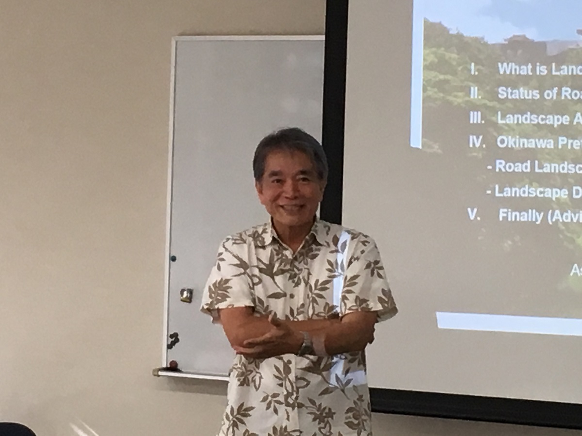 In the morning, the group had a lecture titled "Road Landscape in Okinawa" delivered by Mr. Ken Kohagura, a counselor at Asahi Construction Consultant Co. Ltd. He pointed out problems with road landscape design in Okinawa and elaborated on new strategies showing actual examples. Participants asked many questions about the maintenance and management of street plants.
