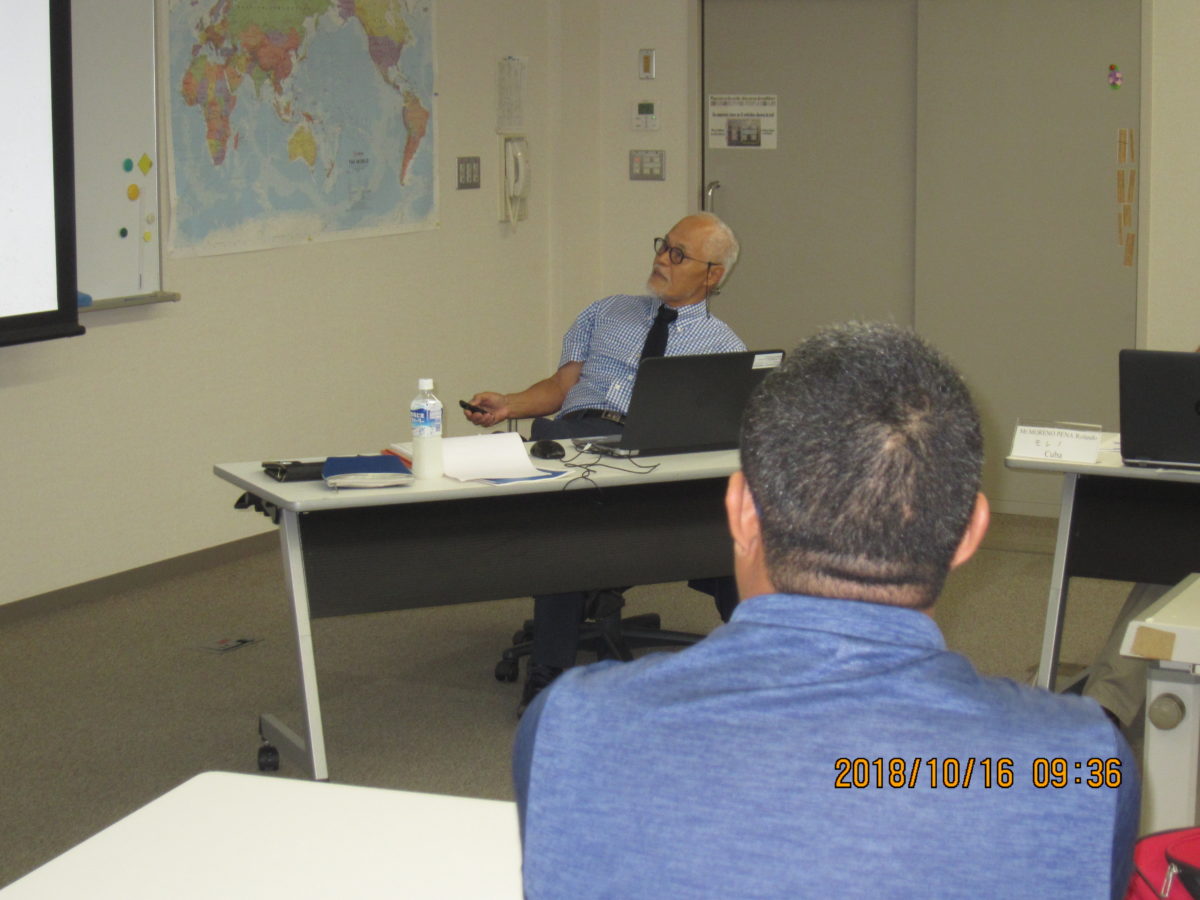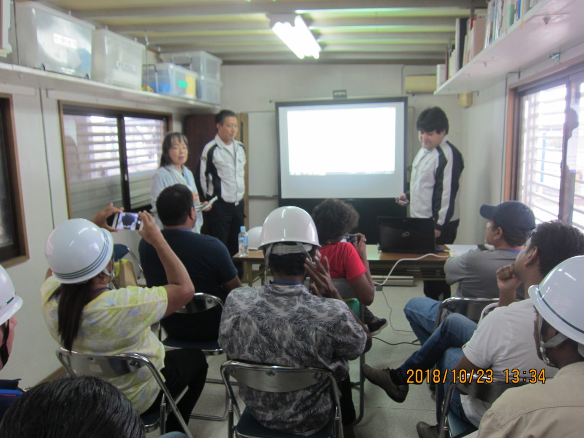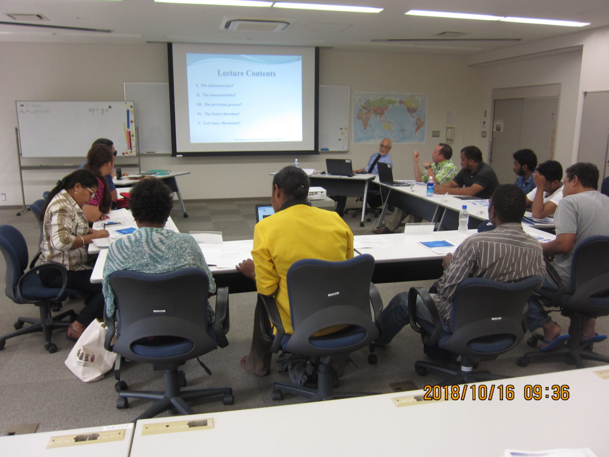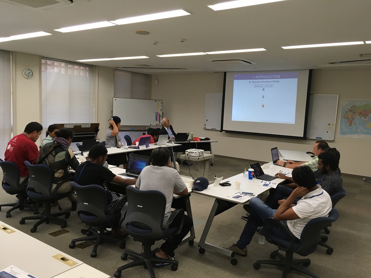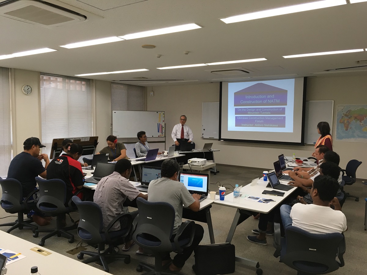 午前は「社会基盤整備概論」のテーマで琉球大学矢吹名誉教授の講義がありました。沖縄の事例(伊良部大橋)やスカイツリーの事例等を取り入れながらの講義に研修生は、熱心に聞き、最後に研修生も含めたディスカッションを行いました。