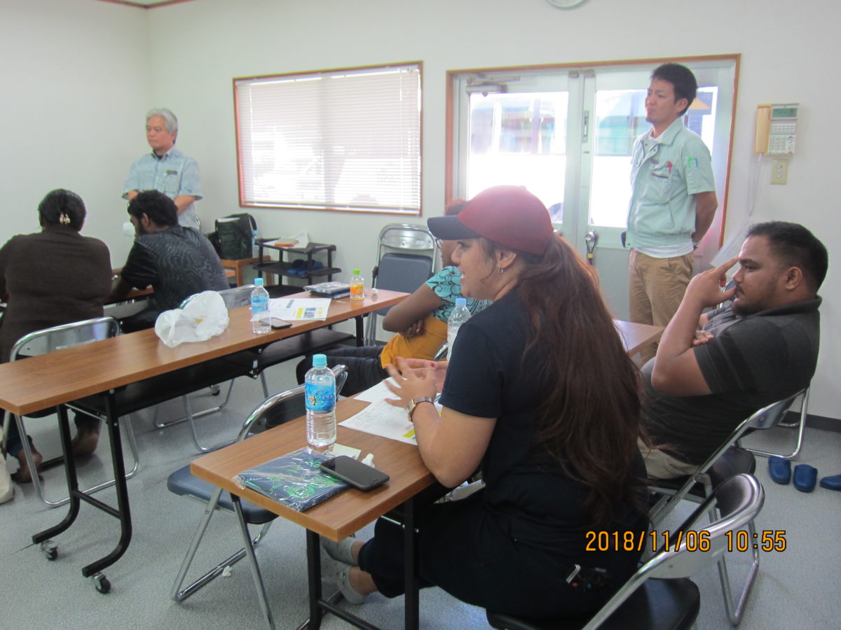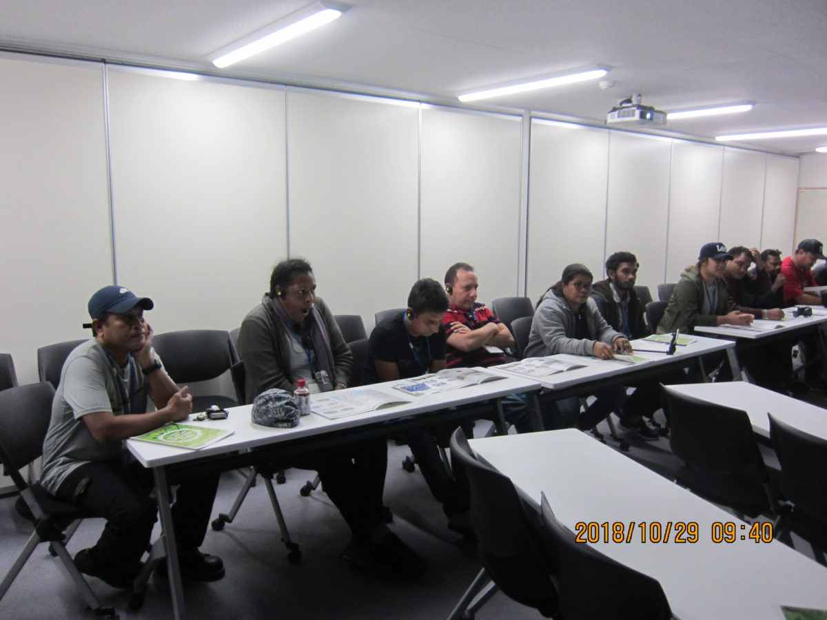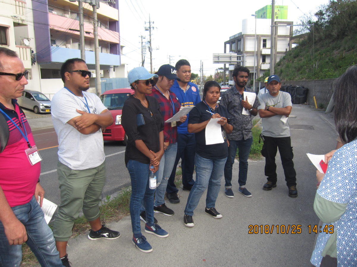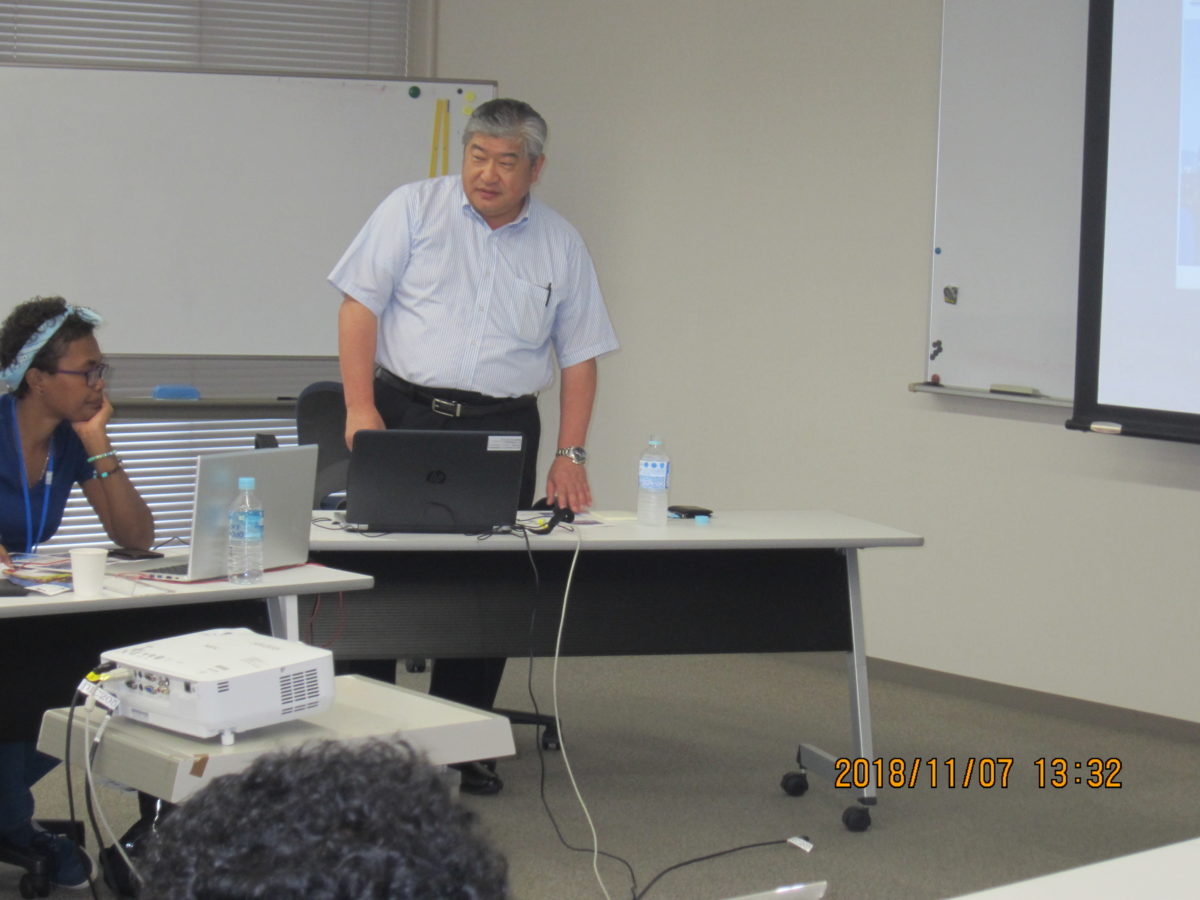 研修初日を迎え午前中は9時半からの開講式の後、NPO法人グリーンアース鈴木代表による県内道路事情説明がありました。道路だけでなく、沖縄県の現状と課題等についても照屋さんの通訳を研修生はメモを取りながら熱心に耳を傾けていました。