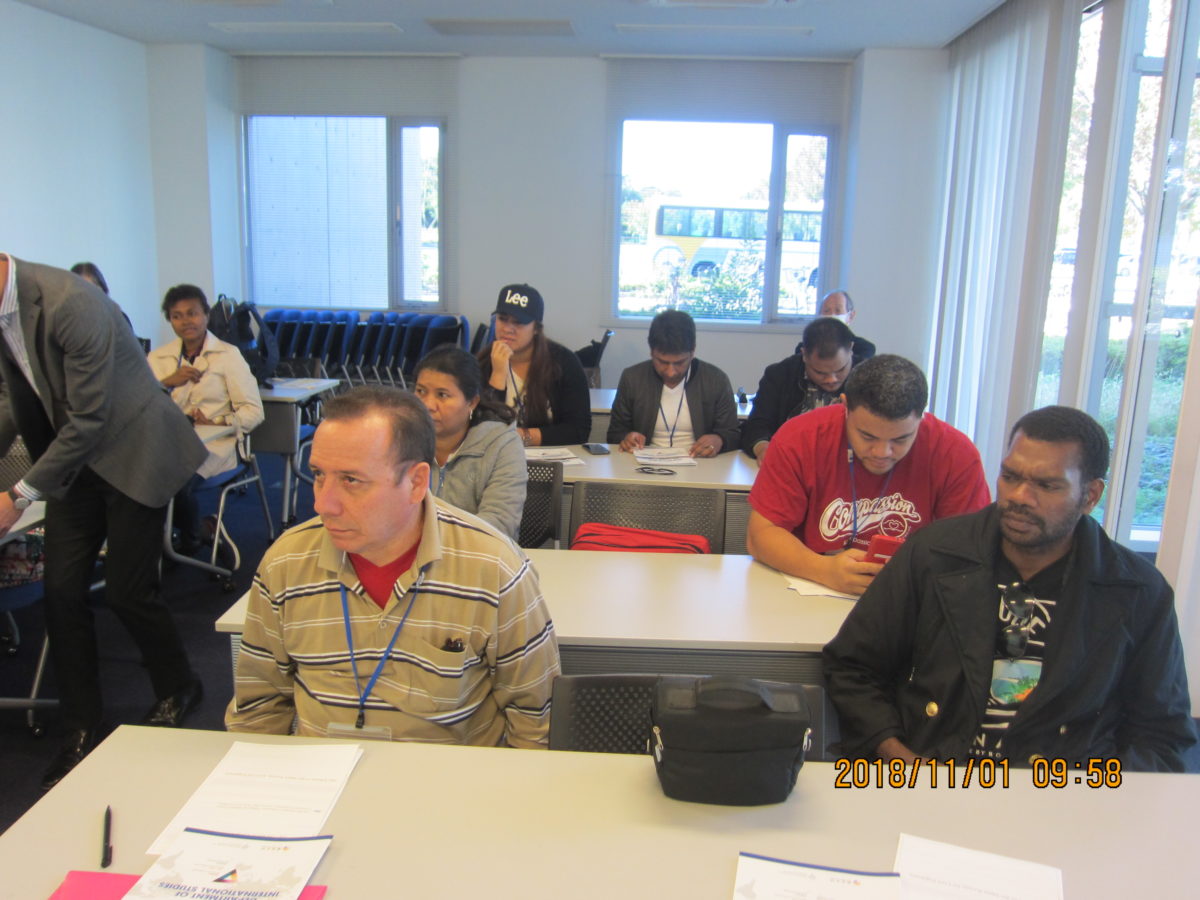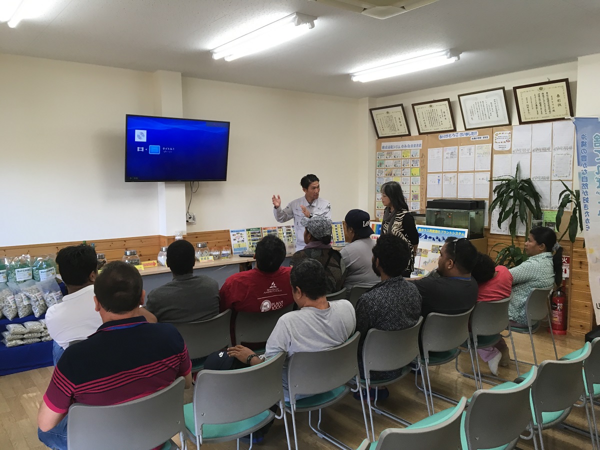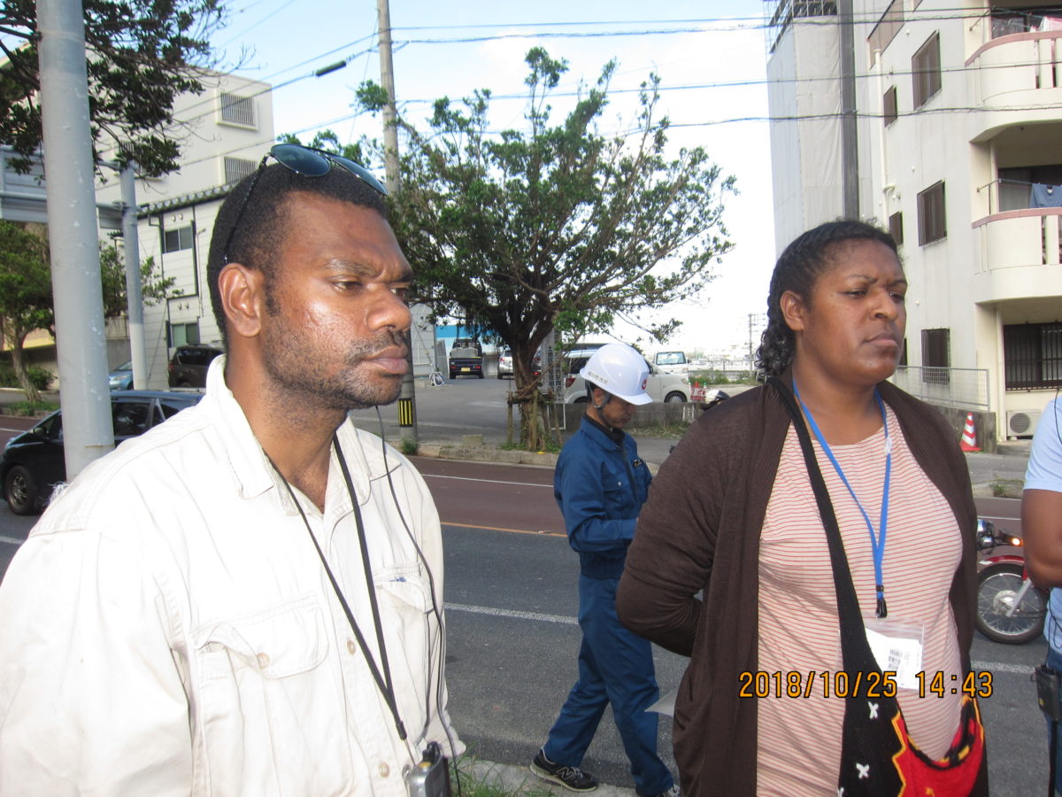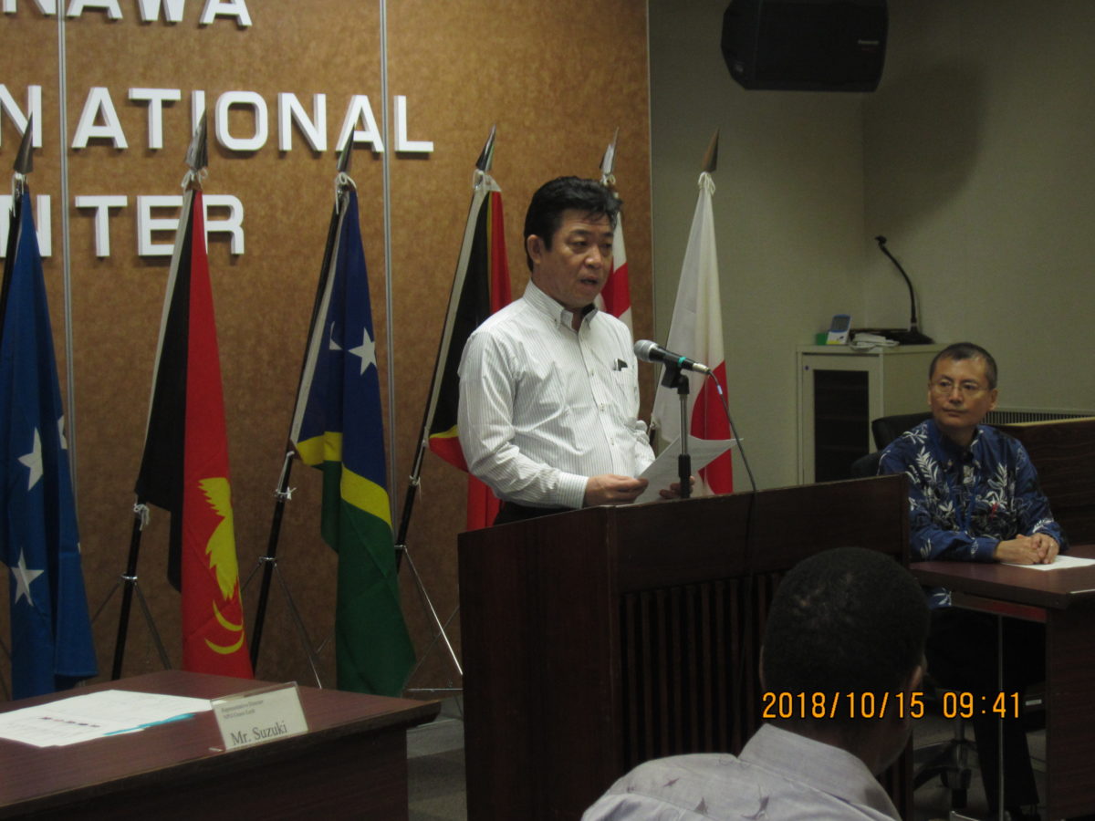 研修初日を迎え午前中は9時半からの開講式の後、NPO法人グリーンアース鈴木代表による県内道路事情説明がありました。道路だけでなく、沖縄県の現状と課題等についても照屋さんの通訳を研修生はメモを取りながら熱心に耳を傾けていました。