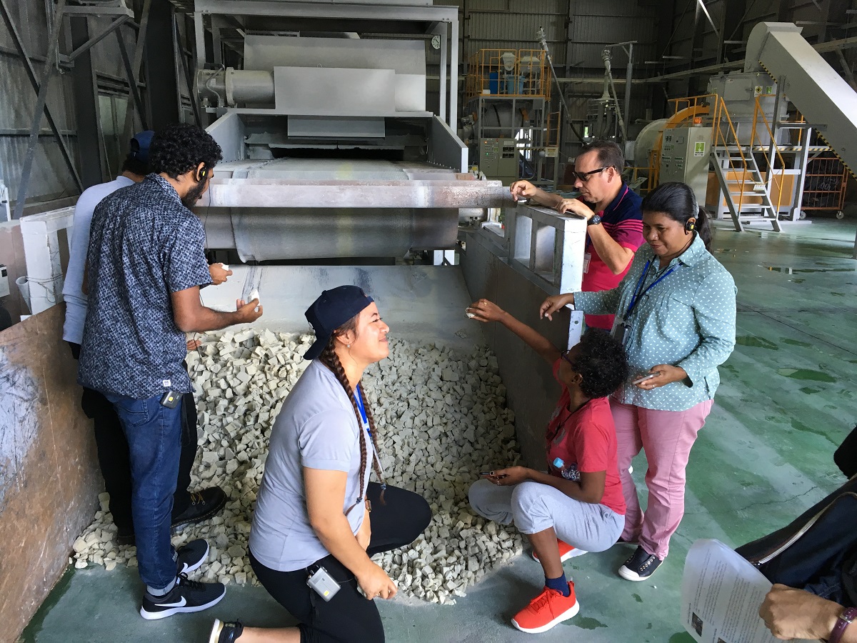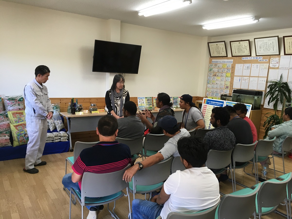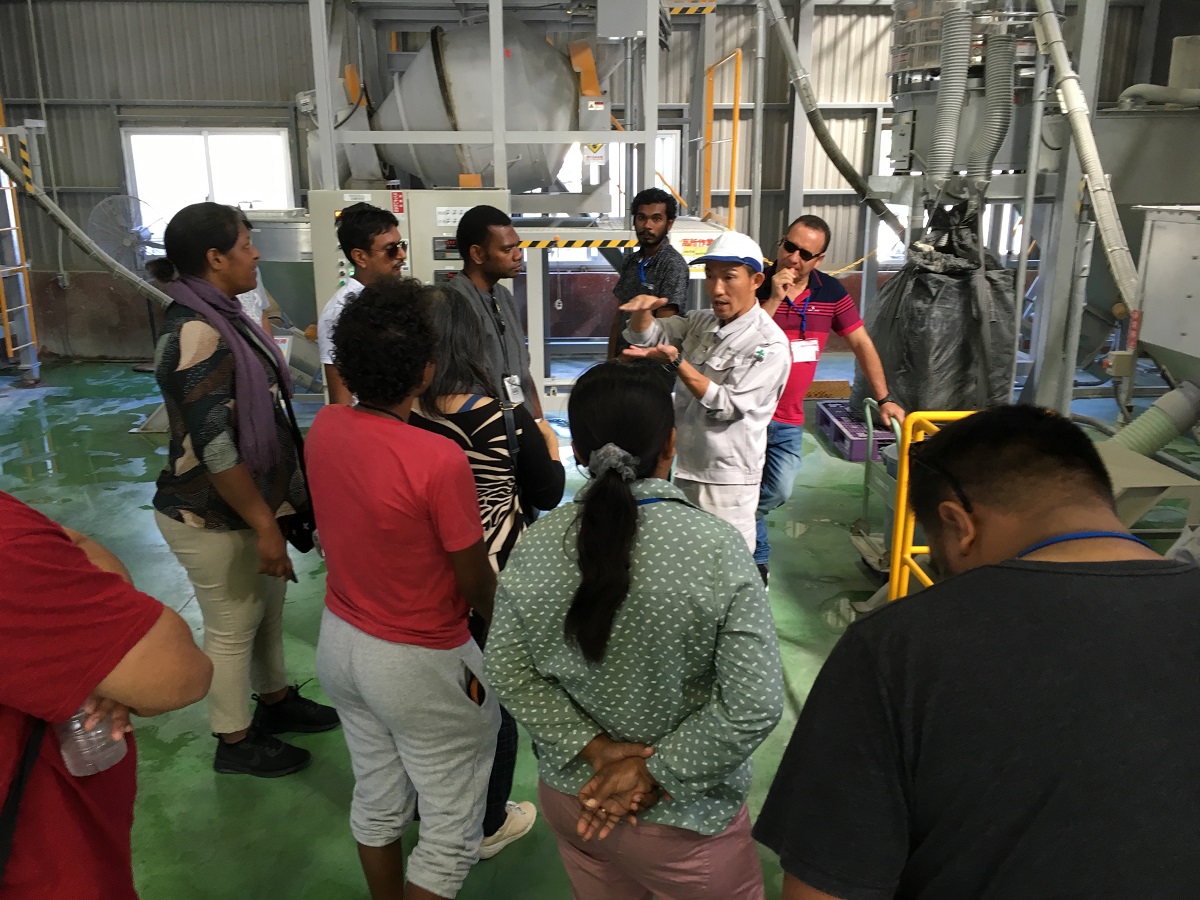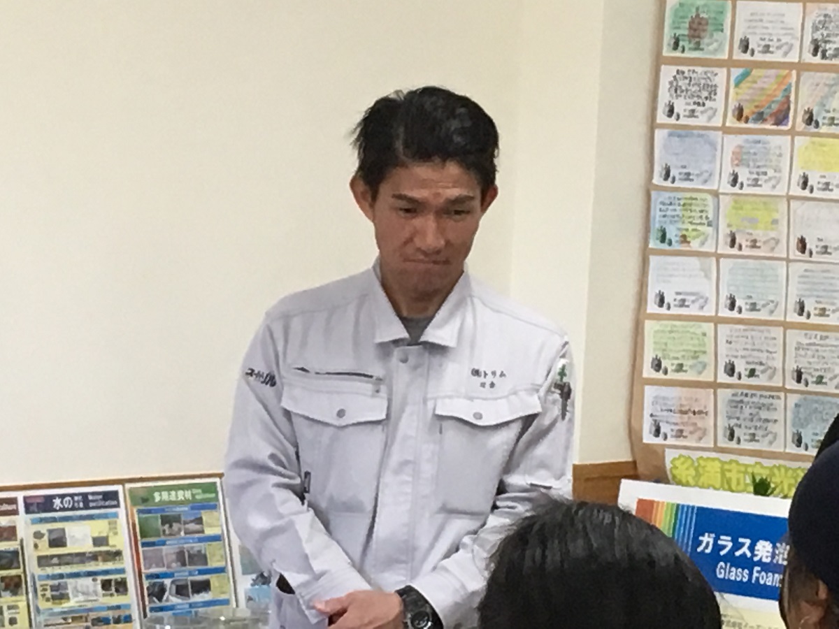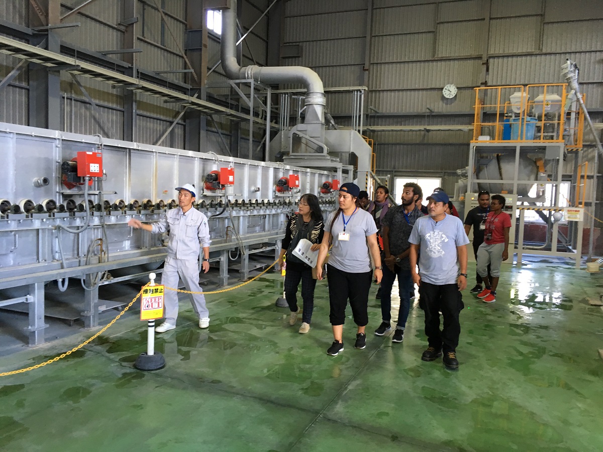 午前は廃ガラスのリサイクル工場株式会社トリムの見学でした。まず、ビデオで廃ガラスを粉砕、粉砕、焼成、発砲させた多孔質軽量発泡材であるスーパーソルの特徴や用途の説明を営業推進室の川合さんから受けました。その後、工場内で実際の製造過程を学びました。リサイクル事業がしっかりとビジネスとして成立していることや独創性の高い一連の製造技術に研修員から称賛の声があがりました。