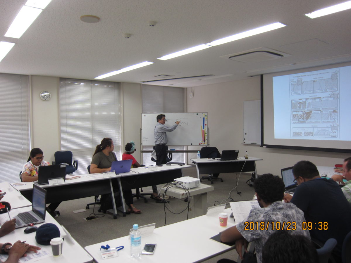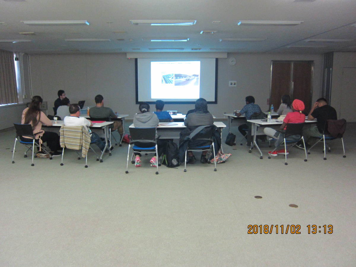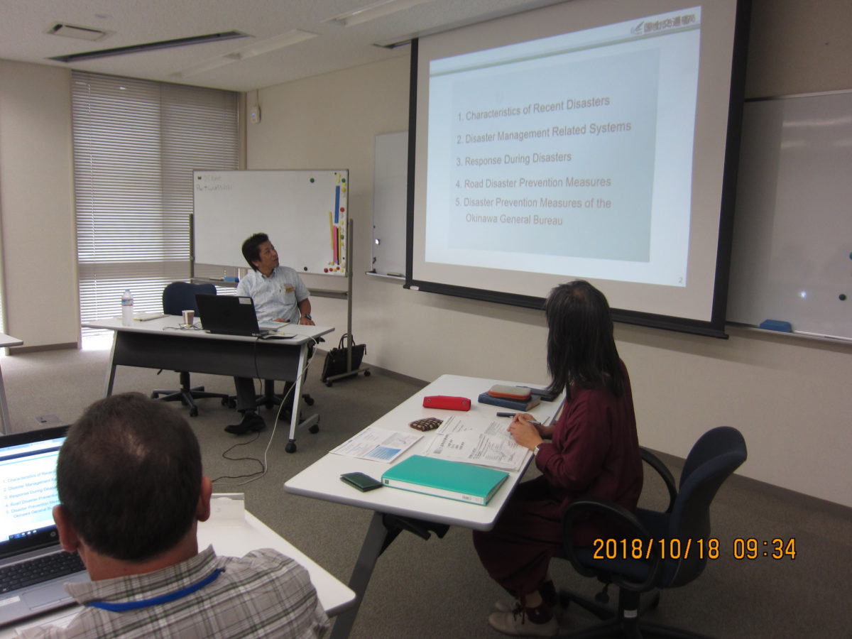 午前は沖縄総合事務局開発建設部上原防災課長による「道路の防災対策」というテーマでの講義で、地震・津波、火山、豪雨による災害の防災対策の説明がありました。研修生各国は同様の災害に悩まされ、災害時の対応や防災対策が自国とどのように違うのか、熱心に聞いていました。また、多くの研修生から災害時の行政のマニュアル英訳版の要望がありました。グローバル化が進む中、住民に対する災害時の対応ガイドラインの英訳版を作成している地方自治体はありました。