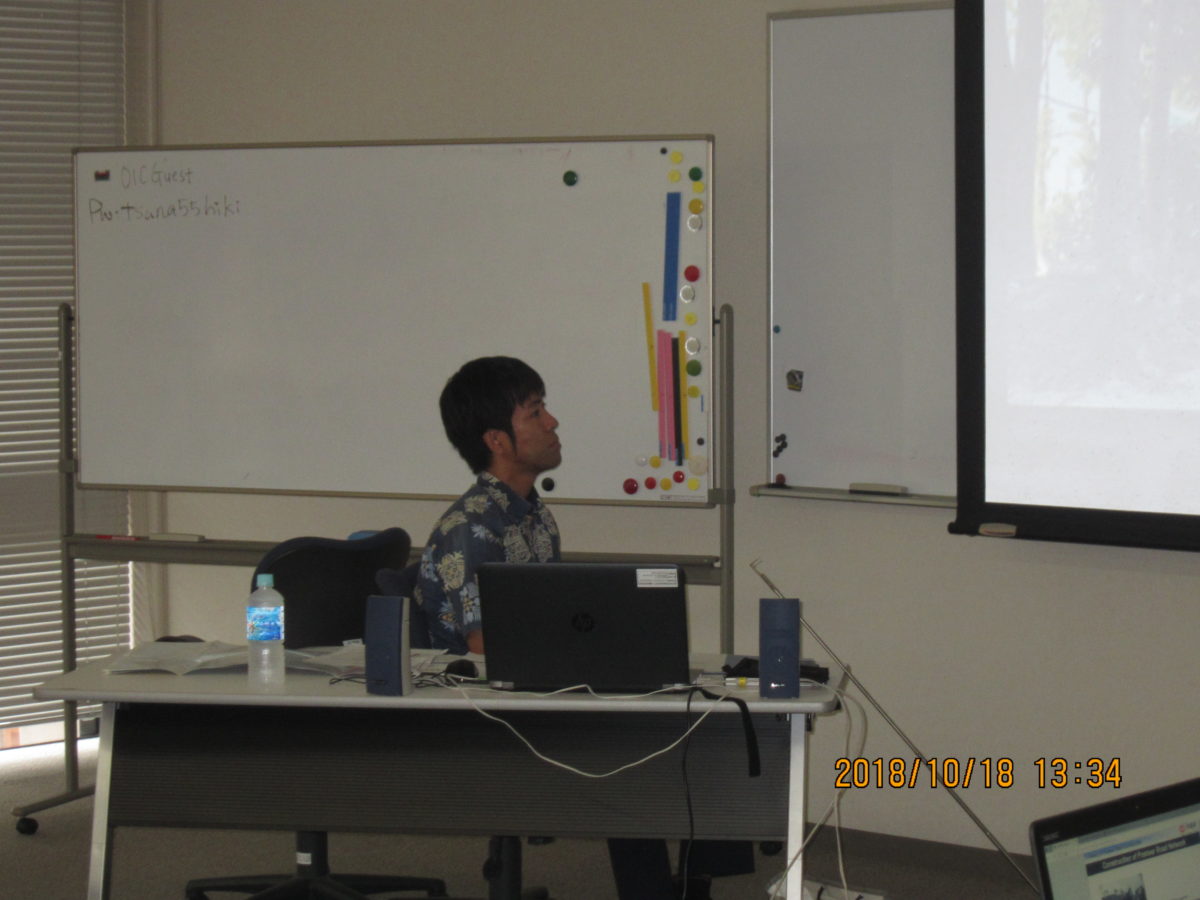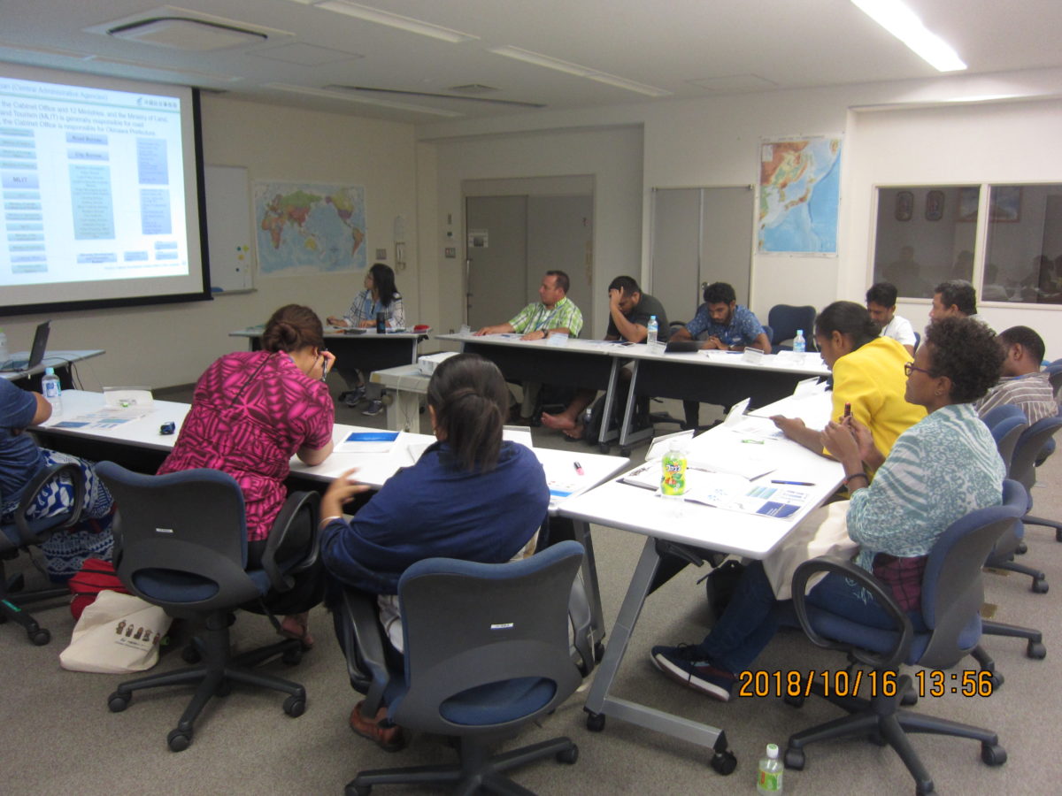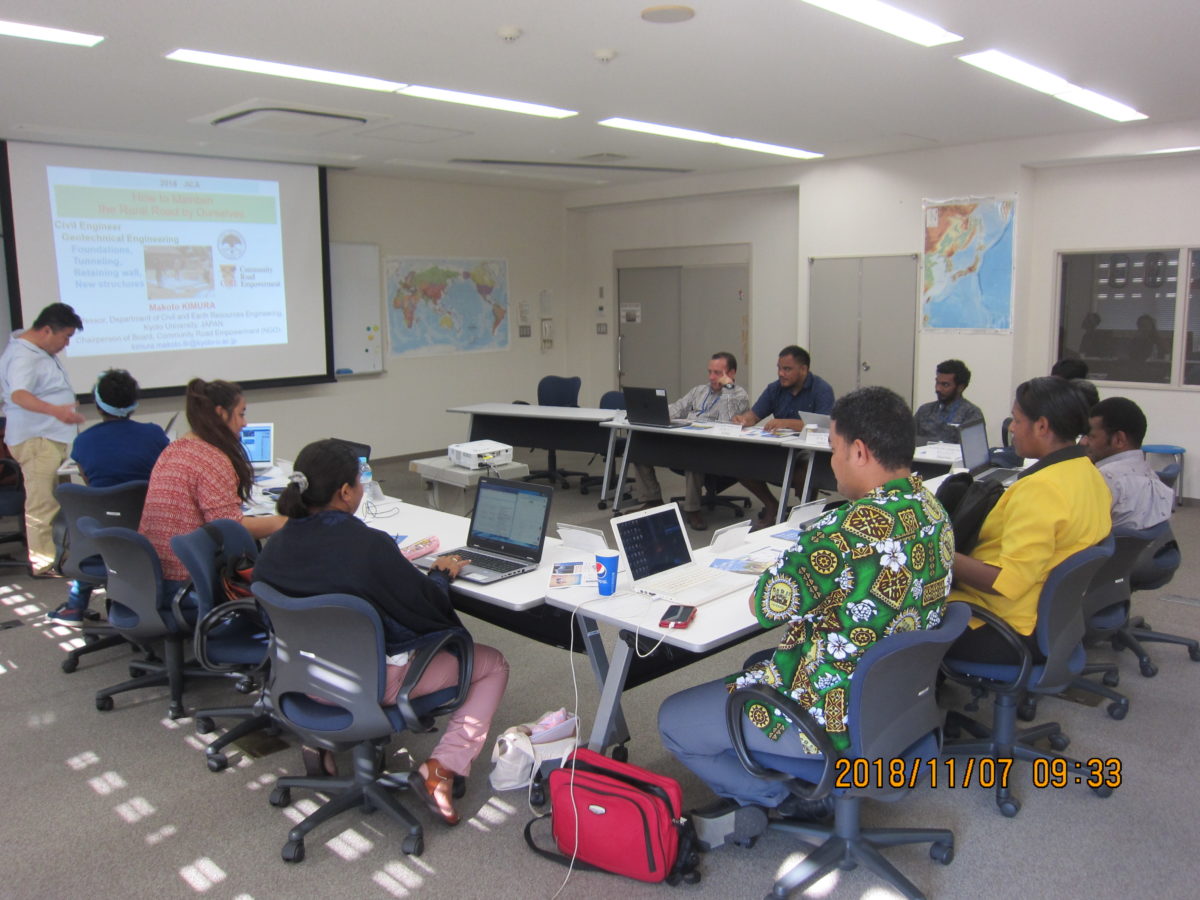 午前は沖縄総合事務局開発建設部上原防災課長による「道路の防災対策」というテーマでの講義で、地震・津波、火山、豪雨による災害の防災対策の説明がありました。研修生各国は同様の災害に悩まされ、災害時の対応や防災対策が自国とどのように違うのか、熱心に聞いていました。また、多くの研修生から災害時の行政のマニュアル英訳版の要望がありました。グローバル化が進む中、住民に対する災害時の対応ガイドラインの英訳版を作成している地方自治体はありました。