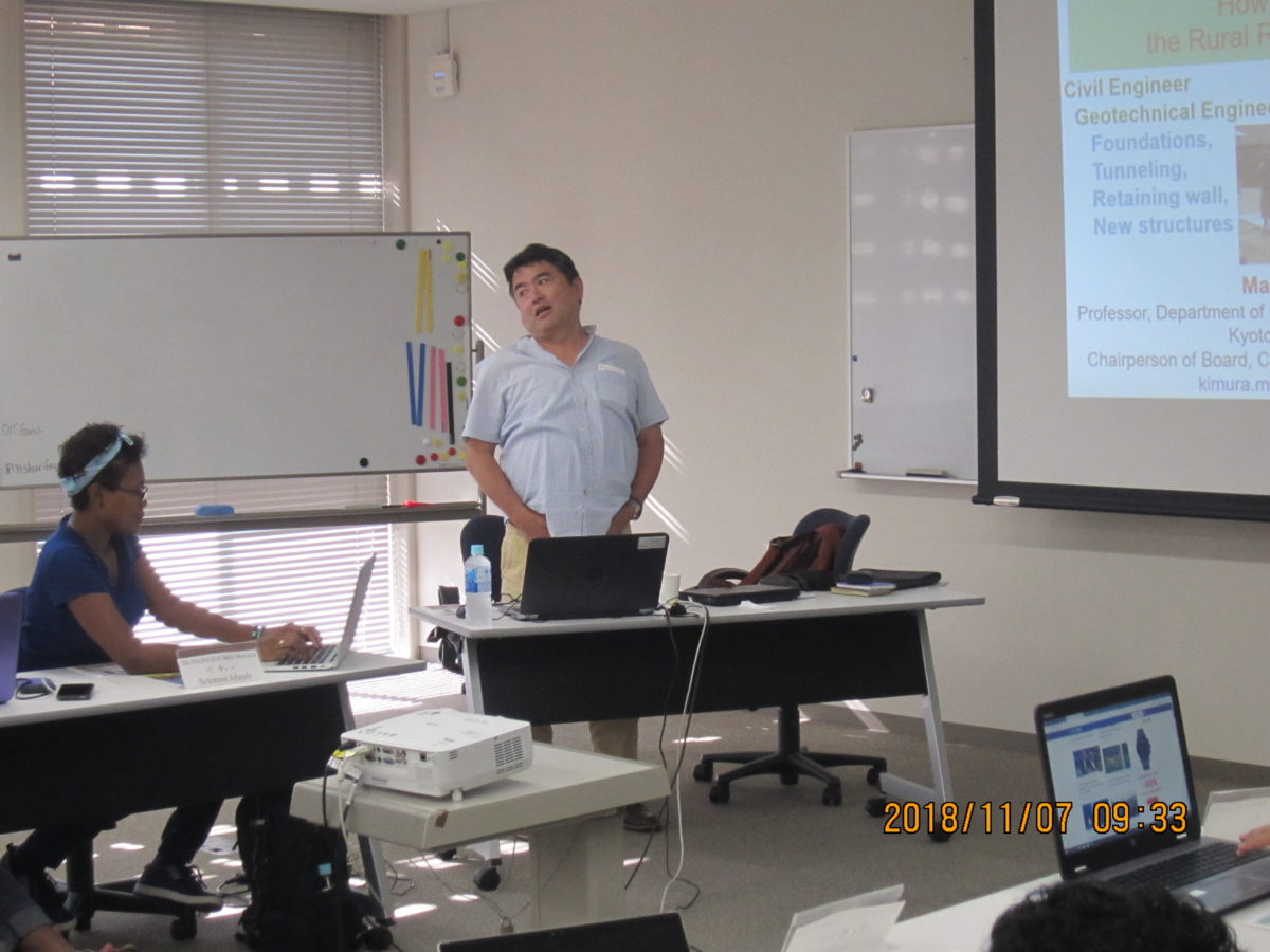 The lecture in the morning was given by Prof. Kimura of Graduate School of Kyoto University on "How to Maintain the Rural Road by Ourselves". He shared his experiences and achievements of NGO activities, developed under his leadership, in many countries especially in Africa. He emphasized the effectiveness of use of "do-nou" to maintain unpaved roads of rural areas. He also stressed on the importance of road among different infrastructures by giving actual overseas examples, showing video. His talk with good sense of humor attracted participants' attention throughout the lecture.