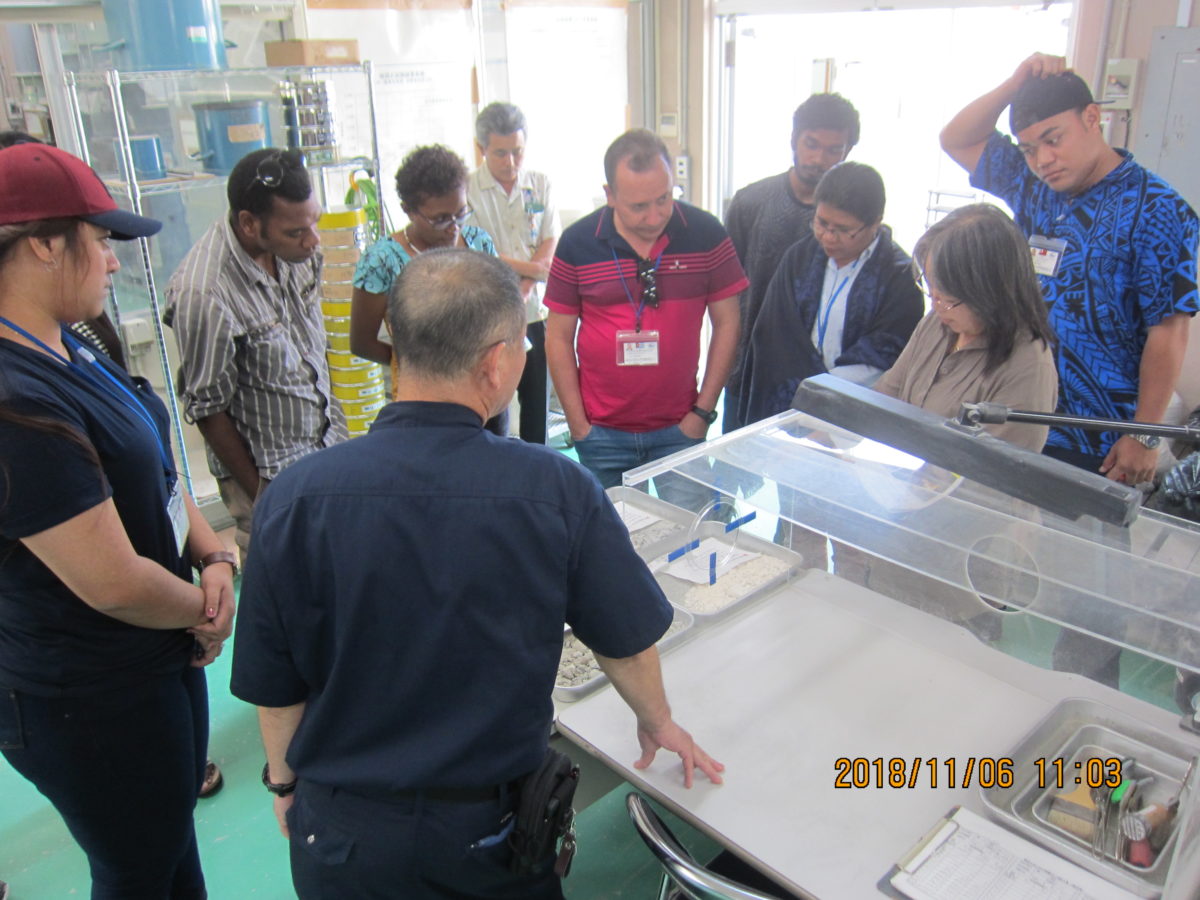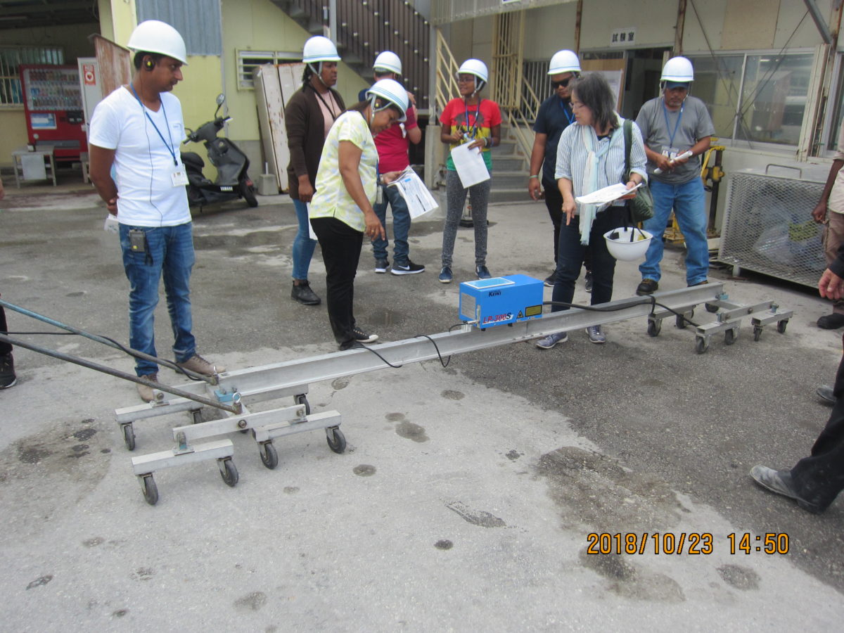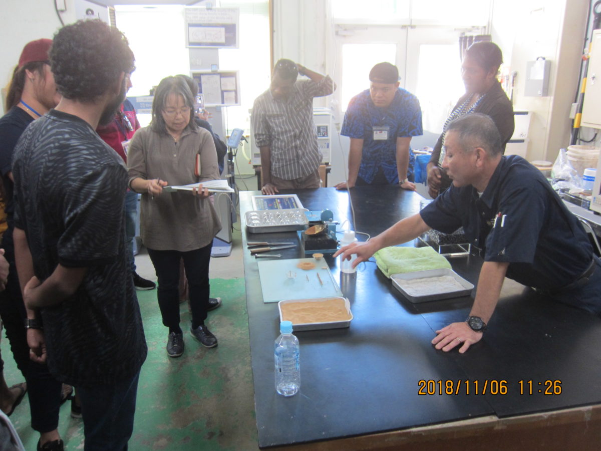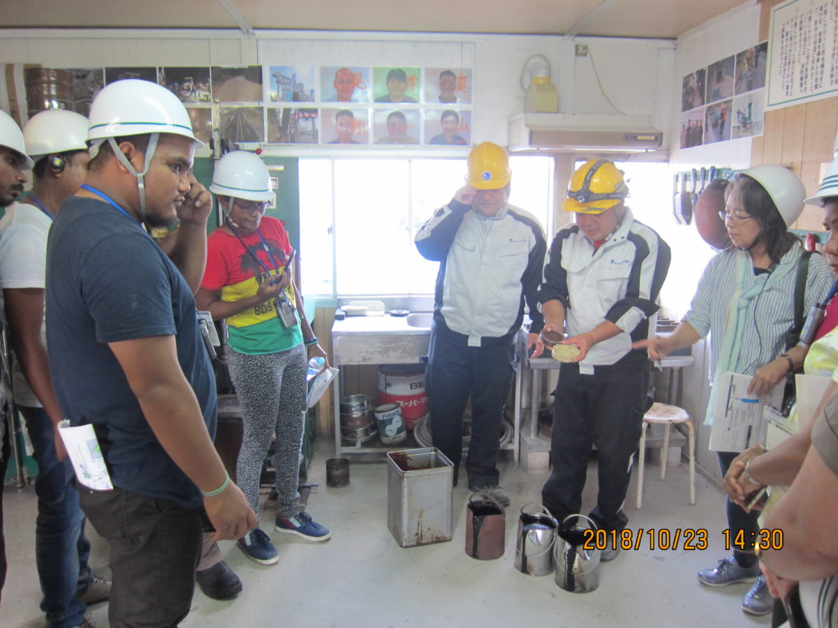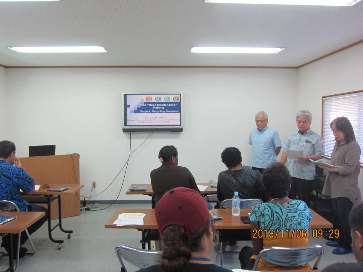 午前は沖縄県建設技術センターでの講義と試験設備の見学でした。講義は「リサイクル資材」(講師)と「舗装材料試験」(赤嶺講師)の2テーマでした。今回は、赤嶺講師のきめ細かい分かりやすい丁寧な説明と試験機材に興味を抱いて、熱心に聞いて、質問をしていました。また、リサイクル材にも各研修員とも関心を示し、具体的な用途や価格を含めた質問を繰り返していました。