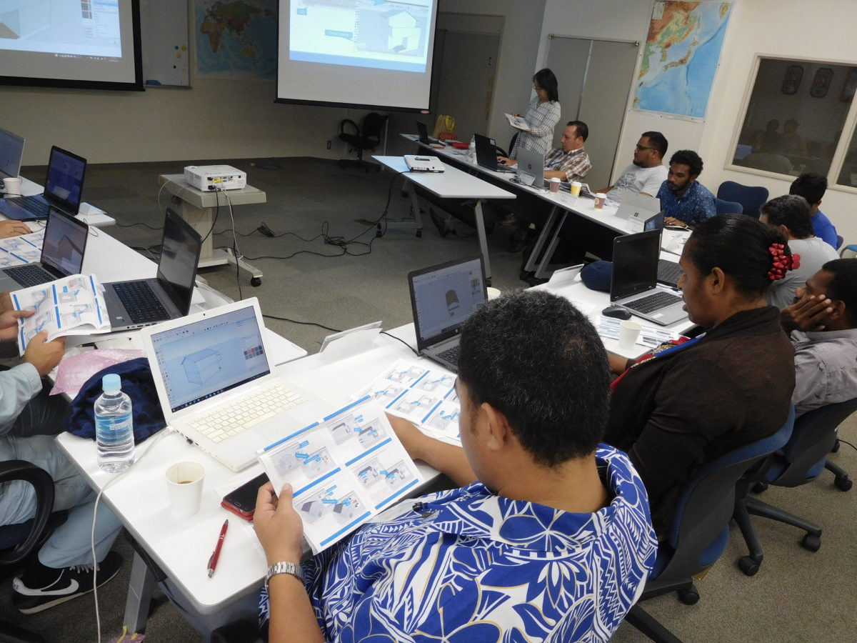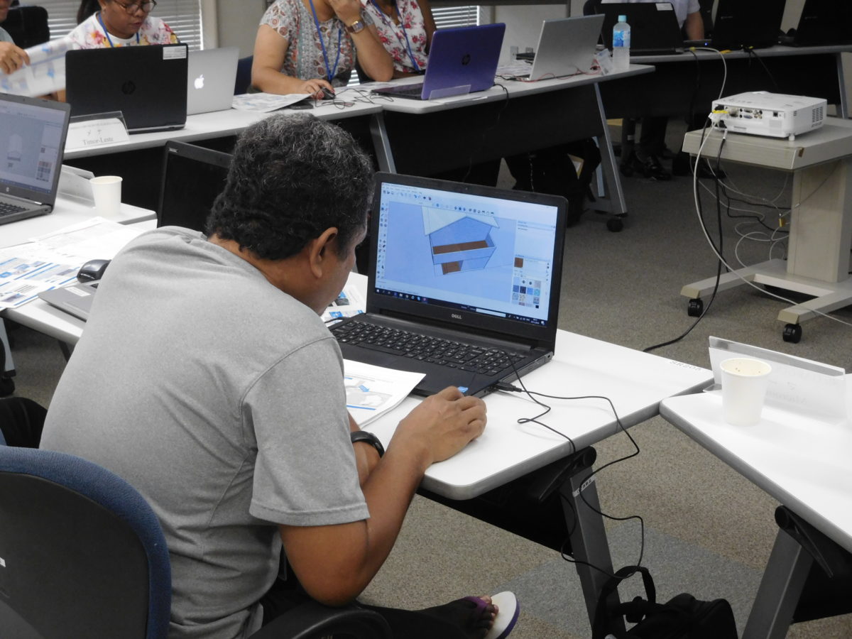 本日は(株)オカベメンテの鈴木・宮良・宮城講師による「3D-CADとドローン」と題した講義でした。午前は3Dデザインソフト:SketchUpによる3Dモデリング実践講習で、研修員は個々のパソコンにインストールした3Dソフトを使って、住宅や橋脚のモデリングを行いました。
