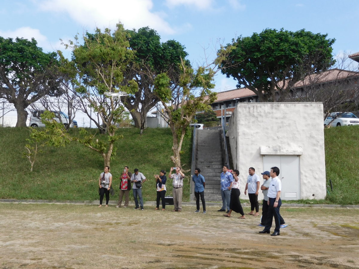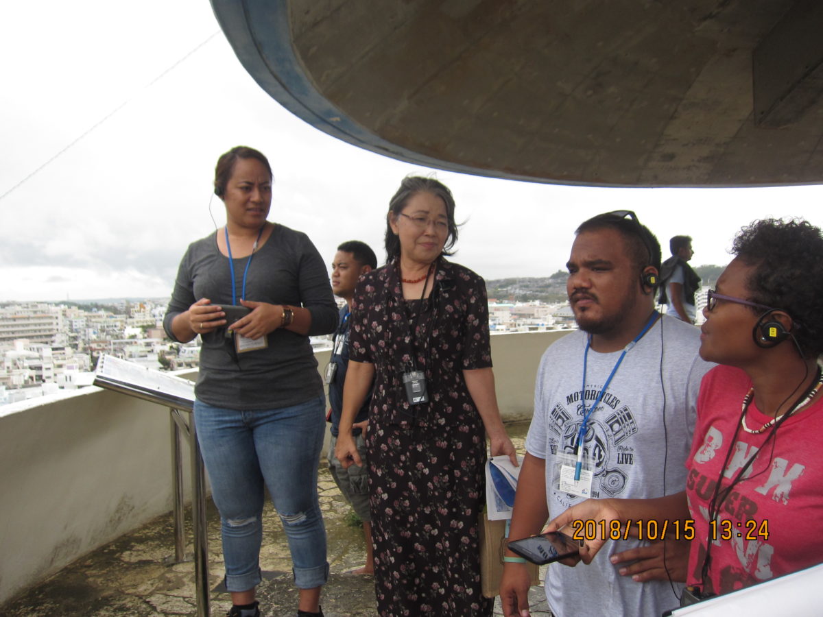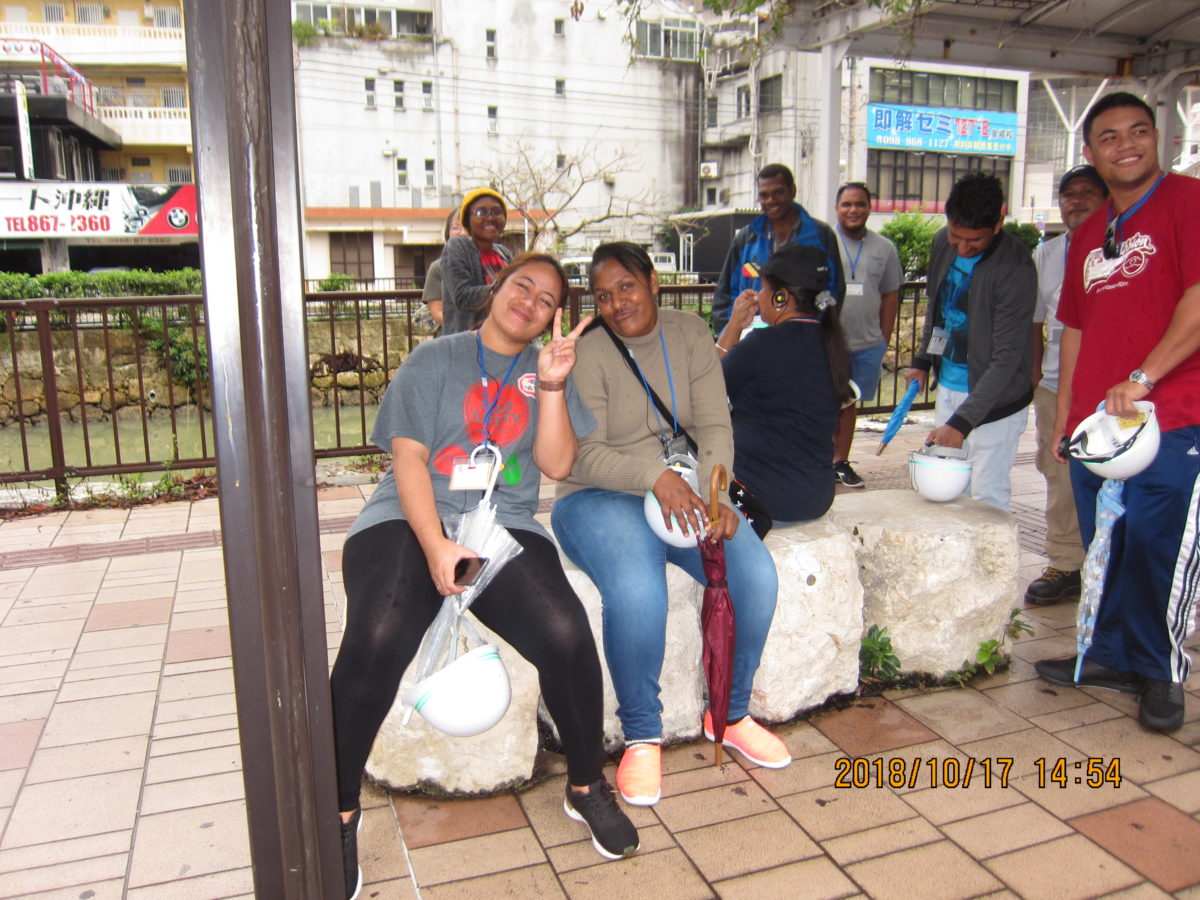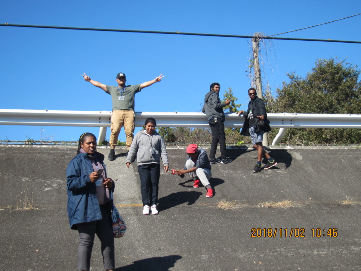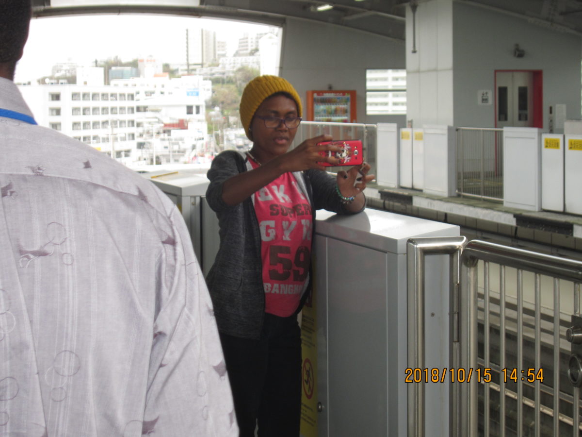 In the afternoon, the group went to Kakazu highland where they learned about the harsh battle fought at that site during the last Pacific war, and saw US Marine Corps Air Station Futenma from the observatory. Then they moved to Tropical Beach and enjoyed strolling around there. And they moved to Furujima station, one of the stations of Okinawa Urban Monorail Service, and experienced rising on the train up to Shuri Station, the destination station.