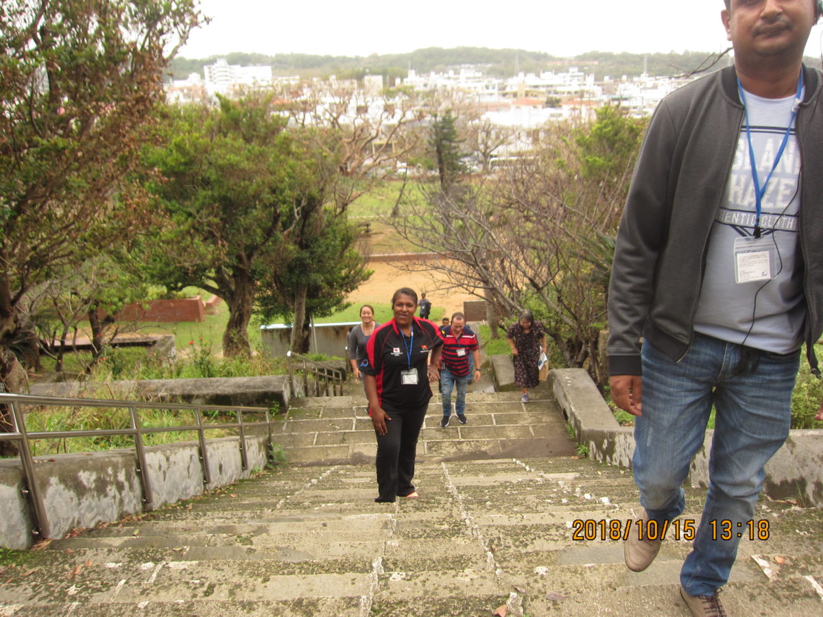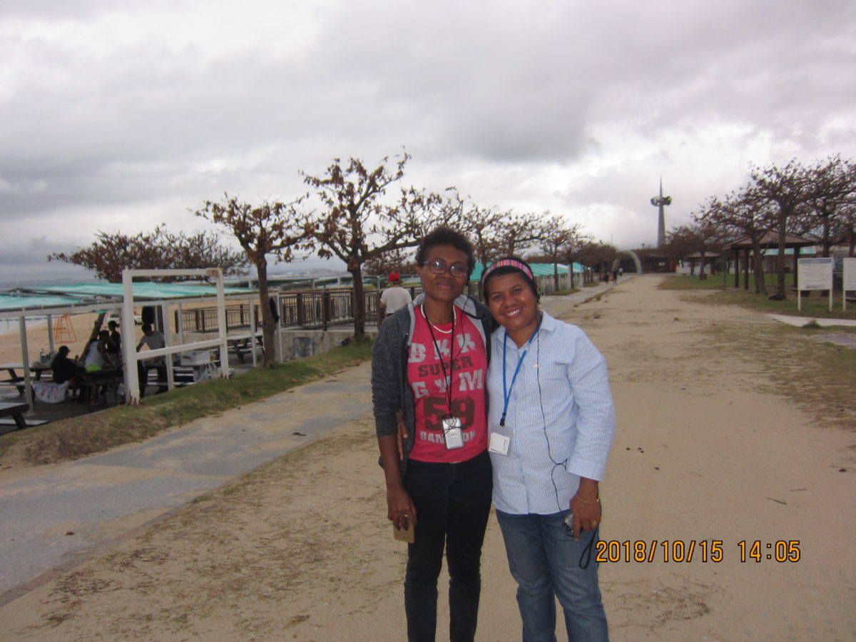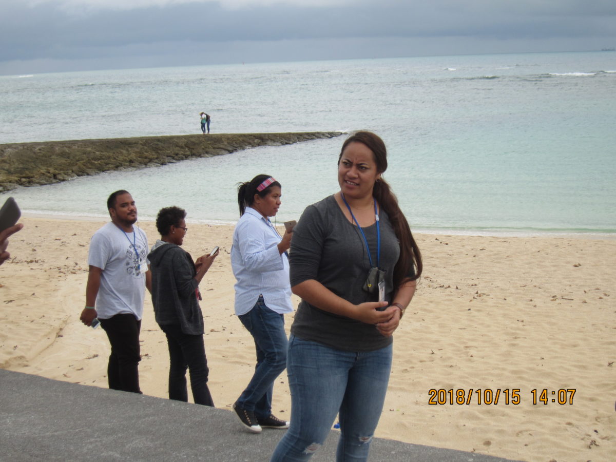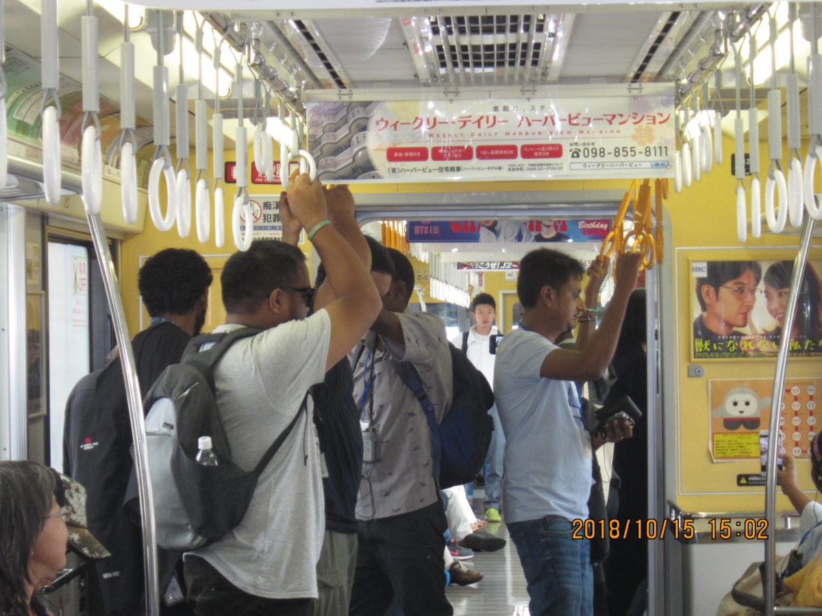 In the afternoon, the group went to Kakazu highland where they learned about the harsh battle fought at that site during the last Pacific war, and saw US Marine Corps Air Station Futenma from the observatory. Then they moved to Tropical Beach and enjoyed strolling around there. And they moved to Furujima station, one of the stations of Okinawa Urban Monorail Service, and experienced rising on the train up to Shuri Station, the destination station.