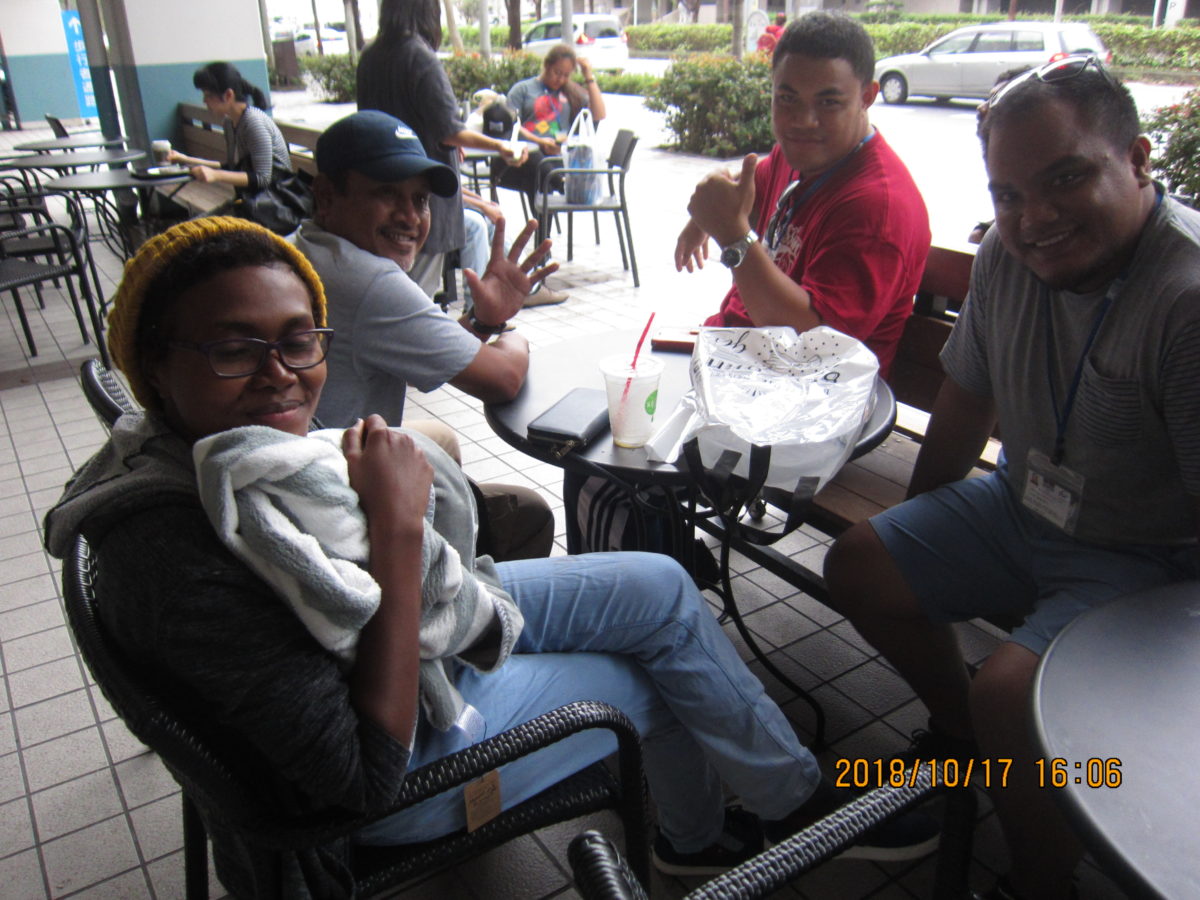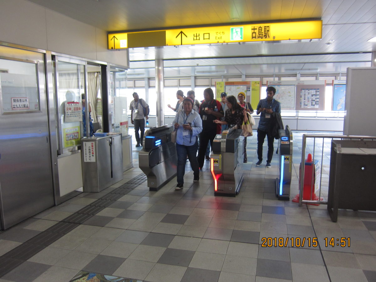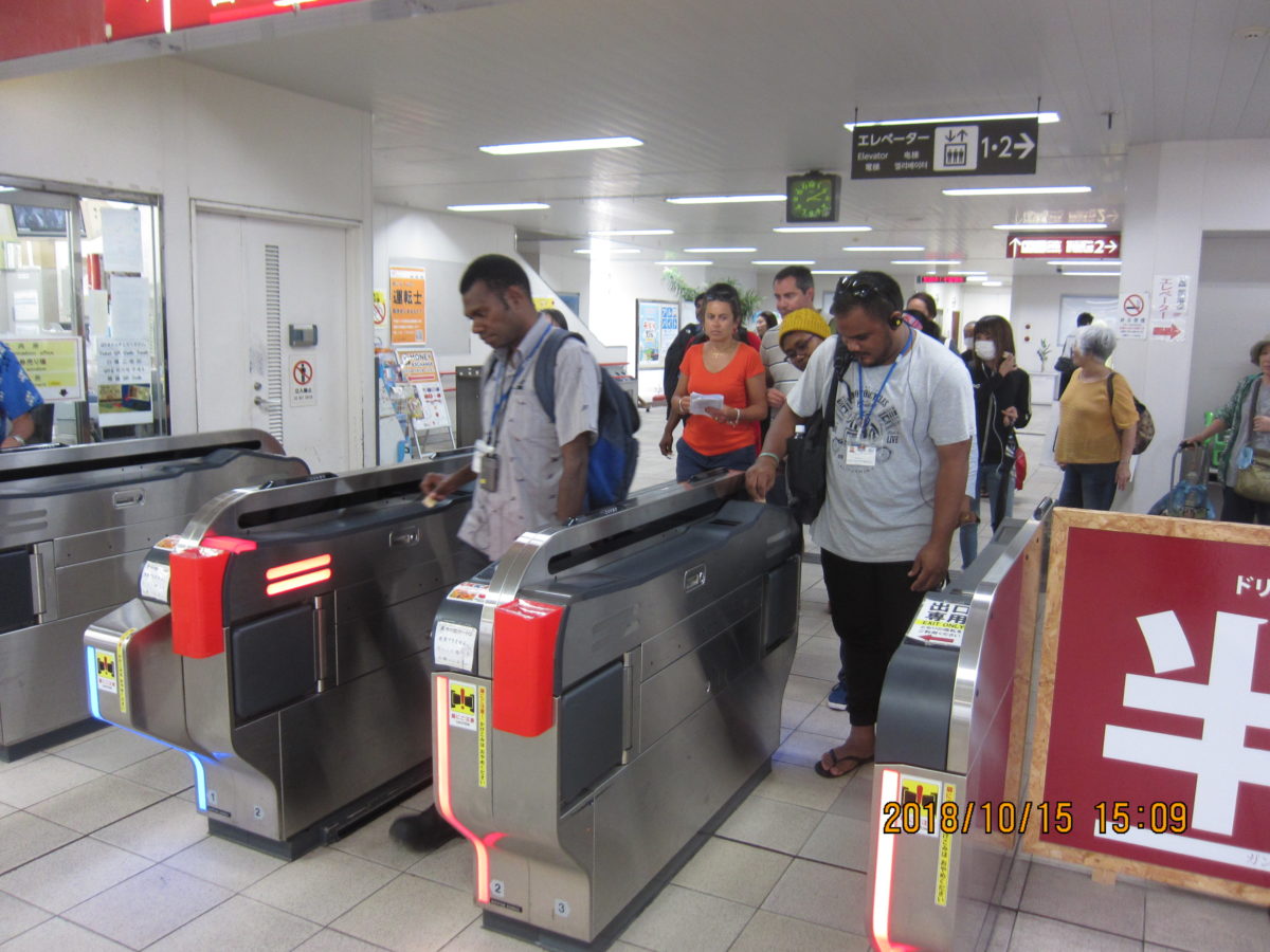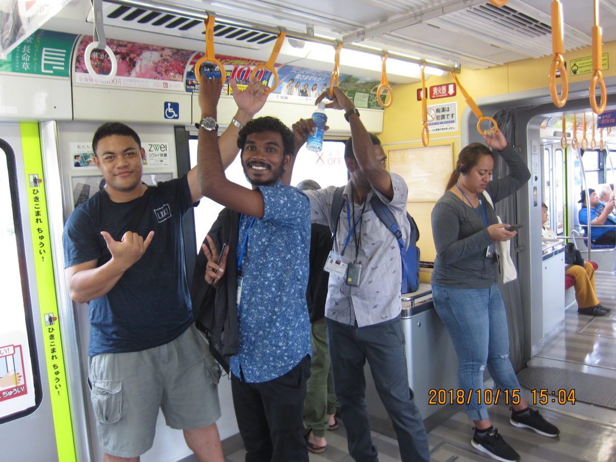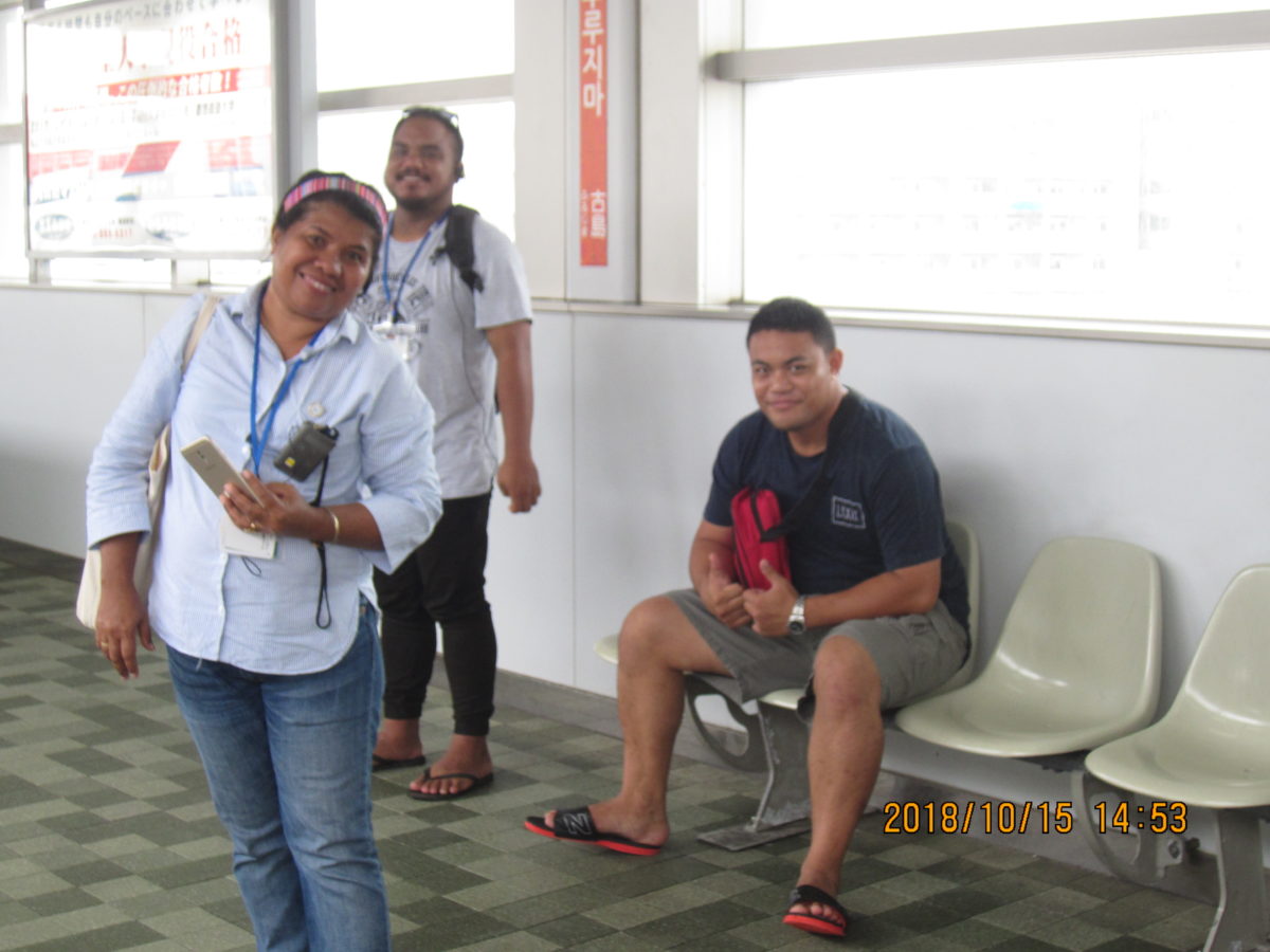 In the afternoon, the group went to Kakazu highland where they learned about the harsh battle fought at that site during the last Pacific war, and saw US Marine Corps Air Station Futenma from the observatory. Then they moved to Tropical Beach and enjoyed strolling around there. And they moved to Furujima station, one of the stations of Okinawa Urban Monorail Service, and experienced rising on the train up to Shuri Station, the destination station.