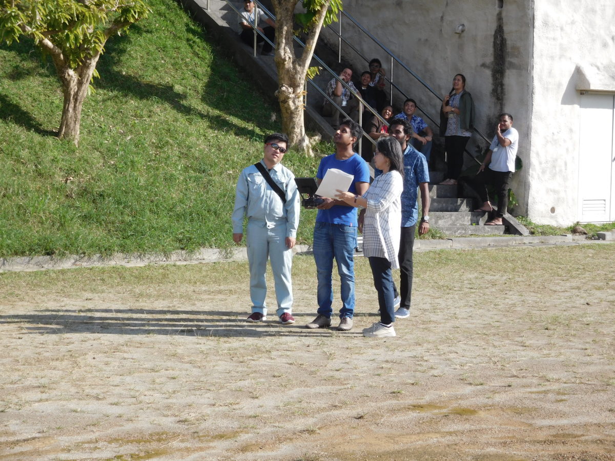 午後はドローン空撮による3D地形測量の概要とドローン操縦に当たっての注意事項を学んだ後、グラウンドにおいて各研修員がドローン操縦を経験しました。ドローン空撮を終えた後には空撮写真や動画・3Dモデル等を確認し、ドローン測量の優位性を認識することが出来たようです。