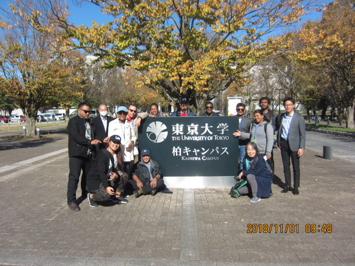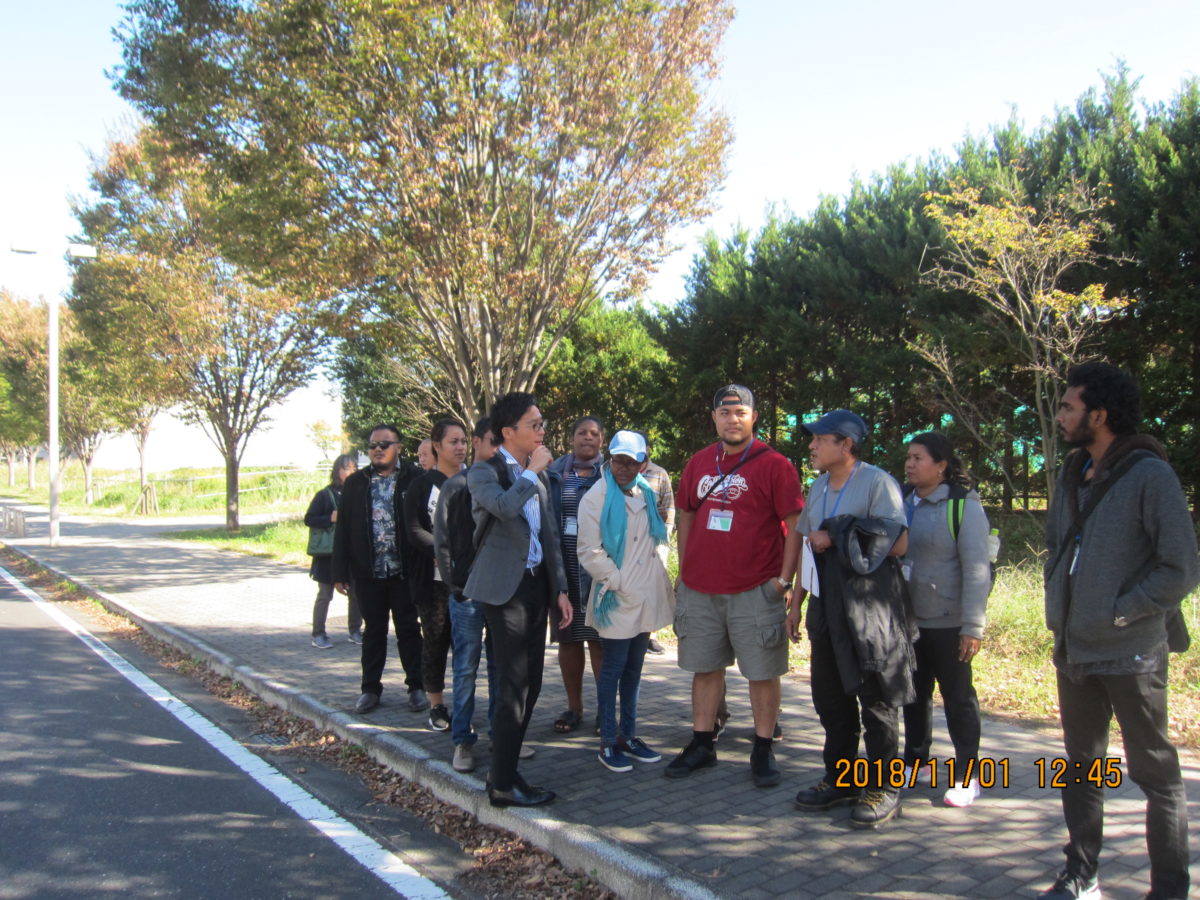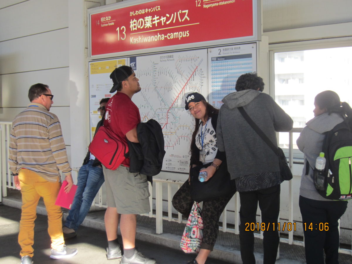 After lunch, Mr. Inoue, a graduate student, showed us university facilities on the campus. There was a surprising event that we accidentally saw Prof. Kajita, a novel prize winner in physics, in front of his laboratory building. At the end of the campus tour, Mr. Inoue escorted us to a conceptual model of eco-friendly community installed in front of Kashiwanoha Campus Station.