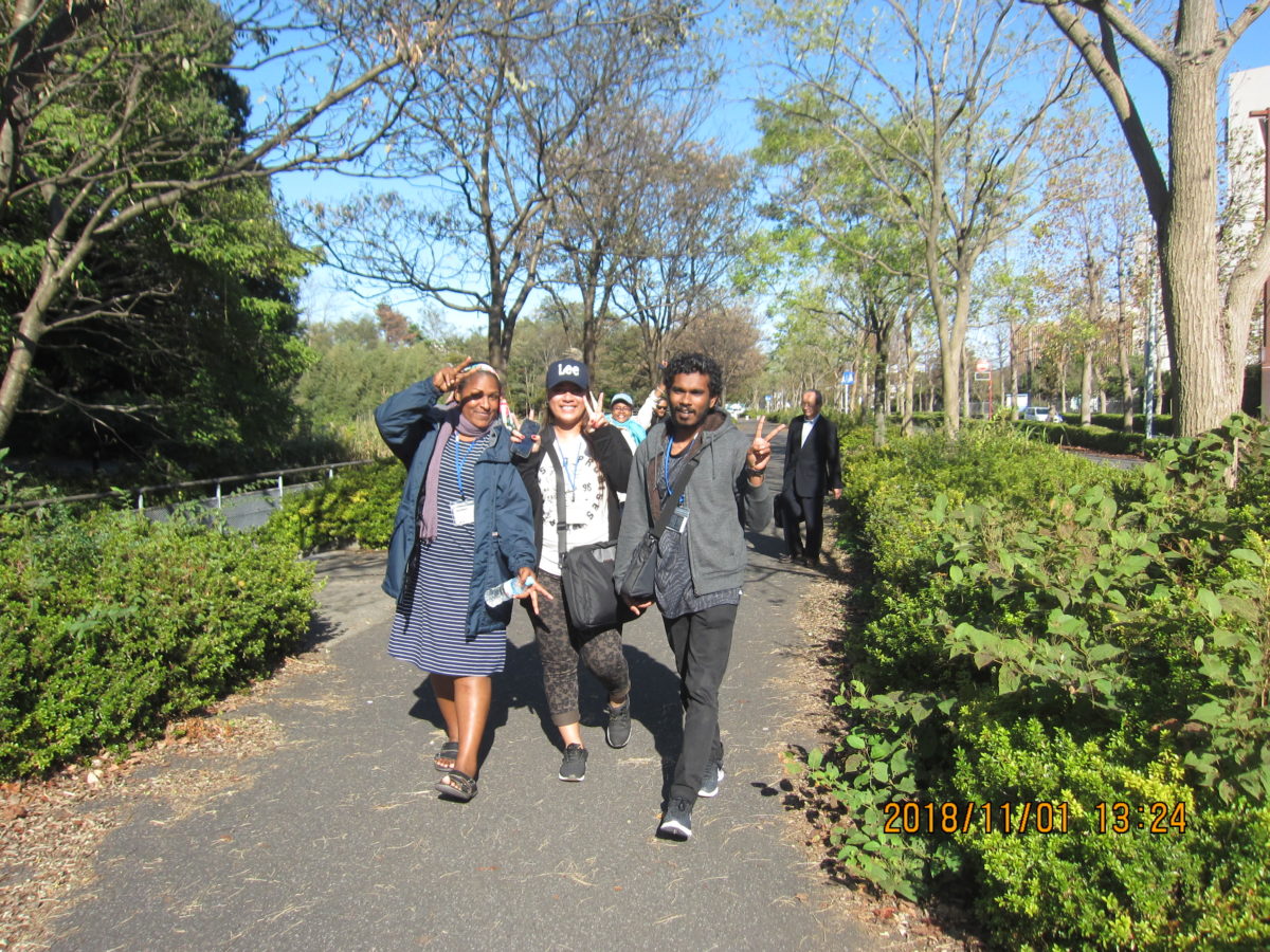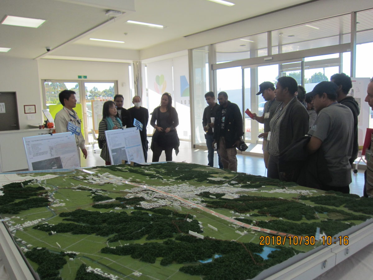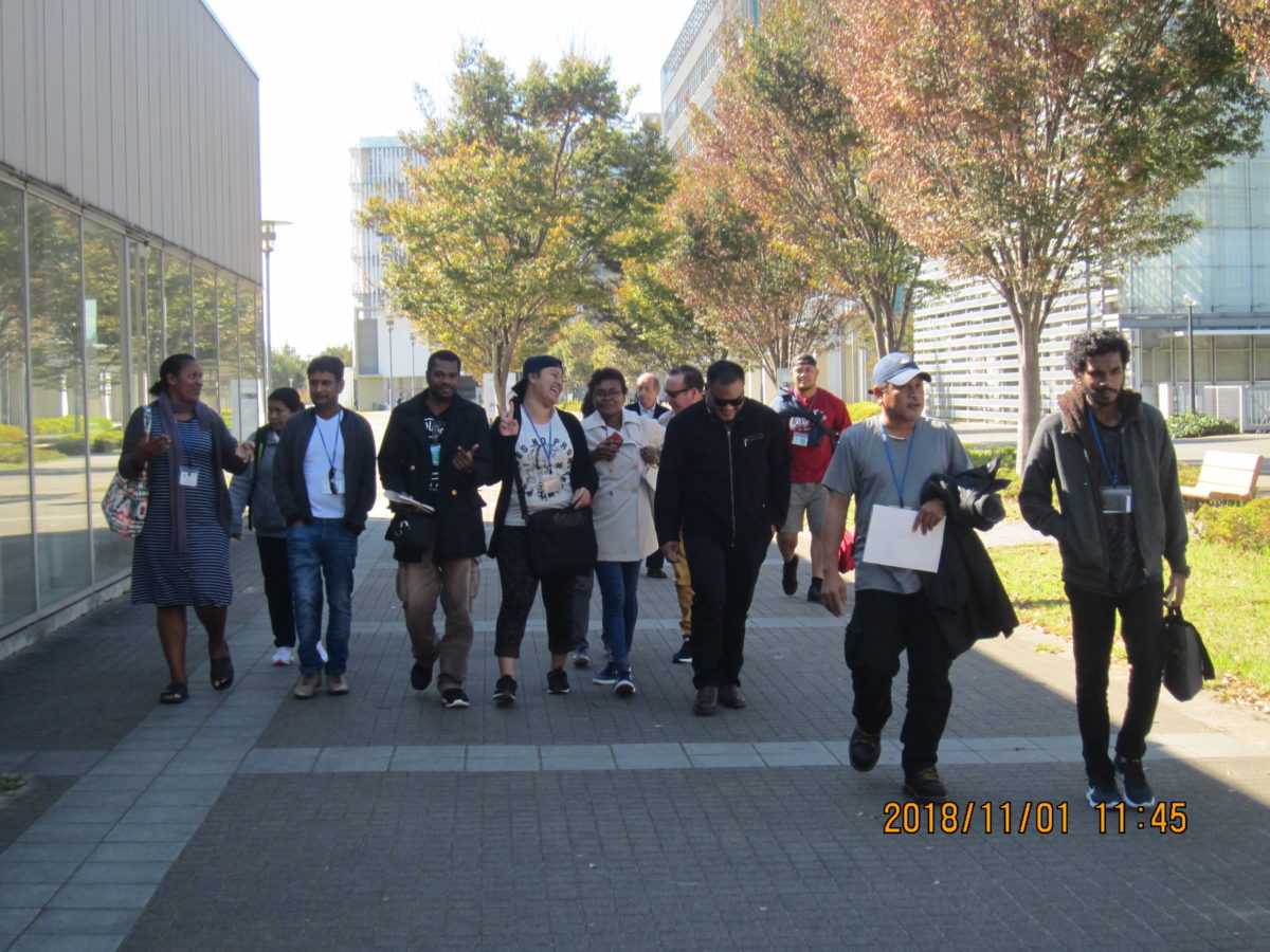After lunch, Mr. Inoue, a graduate student, showed us university facilities on the campus. There was a surprising event that we accidentally saw Prof. Kajita, a novel prize winner in physics, in front of his laboratory building. At the end of the campus tour, Mr. Inoue escorted us to a conceptual model of eco-friendly community installed in front of Kashiwanoha Campus Station.