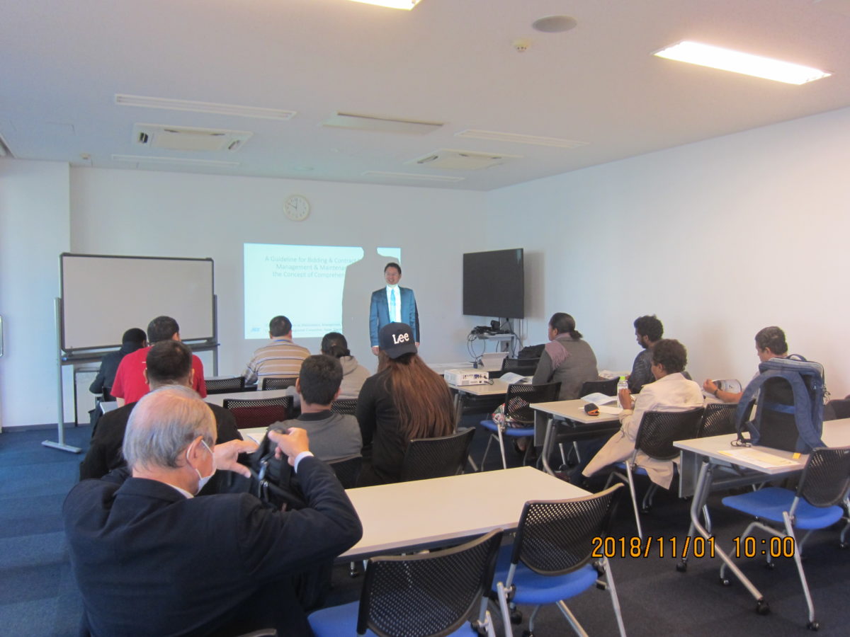Wehad a lecture given by Professor Horita on "A Guideline for Bidding & Contract Systems for Management & Maintenance Projects: the Concept of Comprehensive Contracts" in a meeting room of library building, University of Tokyo Kashiwanoha Campus in the morning. He presented that Sasago Tunnel Incident was a trigger of establishment of road maintenance system and elaborated on new system of bidding for road maintenance contract. Participants answered to the questions posed by Prof. Horita and listened carefully to the lecture as they compared the system of bidding and contract of their countries and that of Japan.