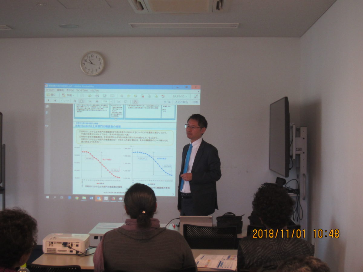 午前は、東京大学(柏の葉キャンパス)の図書館の会議室で、堀田教授の「日本の維持管理工事の入札制度について」をテーマにした講義でした。まず、先生は、笹子トンネル事故が道路維持制度整備のきっかけになったことや維持管理工事に対し入札の新たな方式について説明しました。研修生は先生の質問に答えながら、自国の入札契約制度と比較し興味を持って聞いていました。