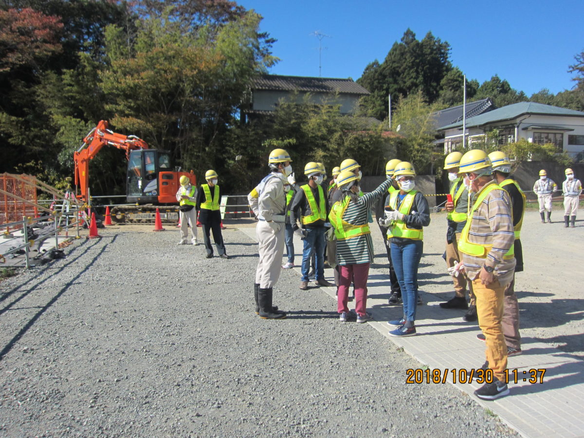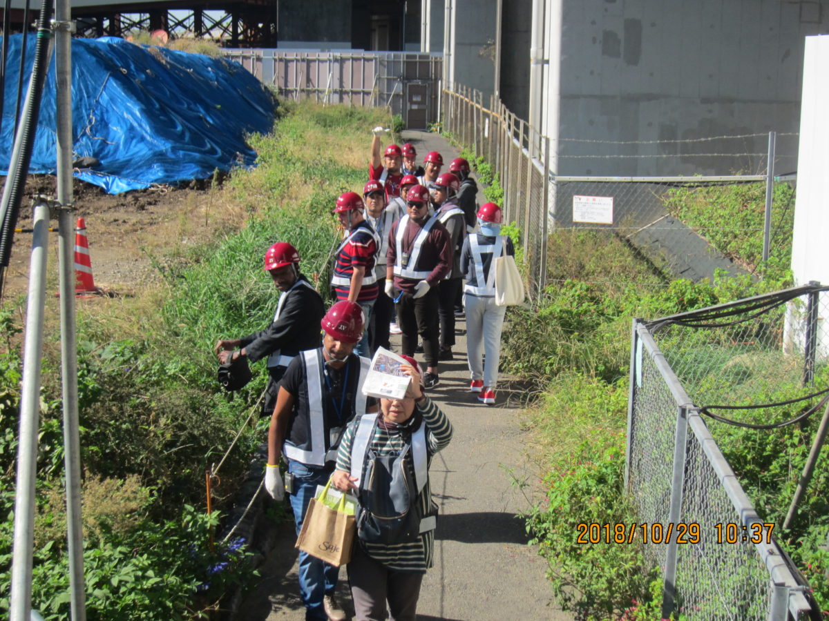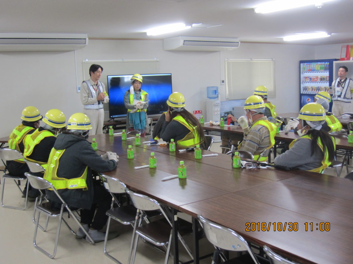 マイクロバスで高速道路を乗り継いで、東日本大震災による被害を受け帰還困難区域である福島県双葉町内に入り、バリケードで立入りが規制され、また廃墟のような建物や住宅等異常な状況を視察しました。午前は、事務所で概要説明を受けてから、除染等に伴う廃棄物処理、中間貯蔵施設、処分場等の見学でした。午後は、まず、双葉インターチェンジ工事、河川、護岸(防潮堤)工事現場の見学でした。道路や現地では、現在の放射線量が標示されていて、研修生はその数値に関心を示し、質問をしていました。