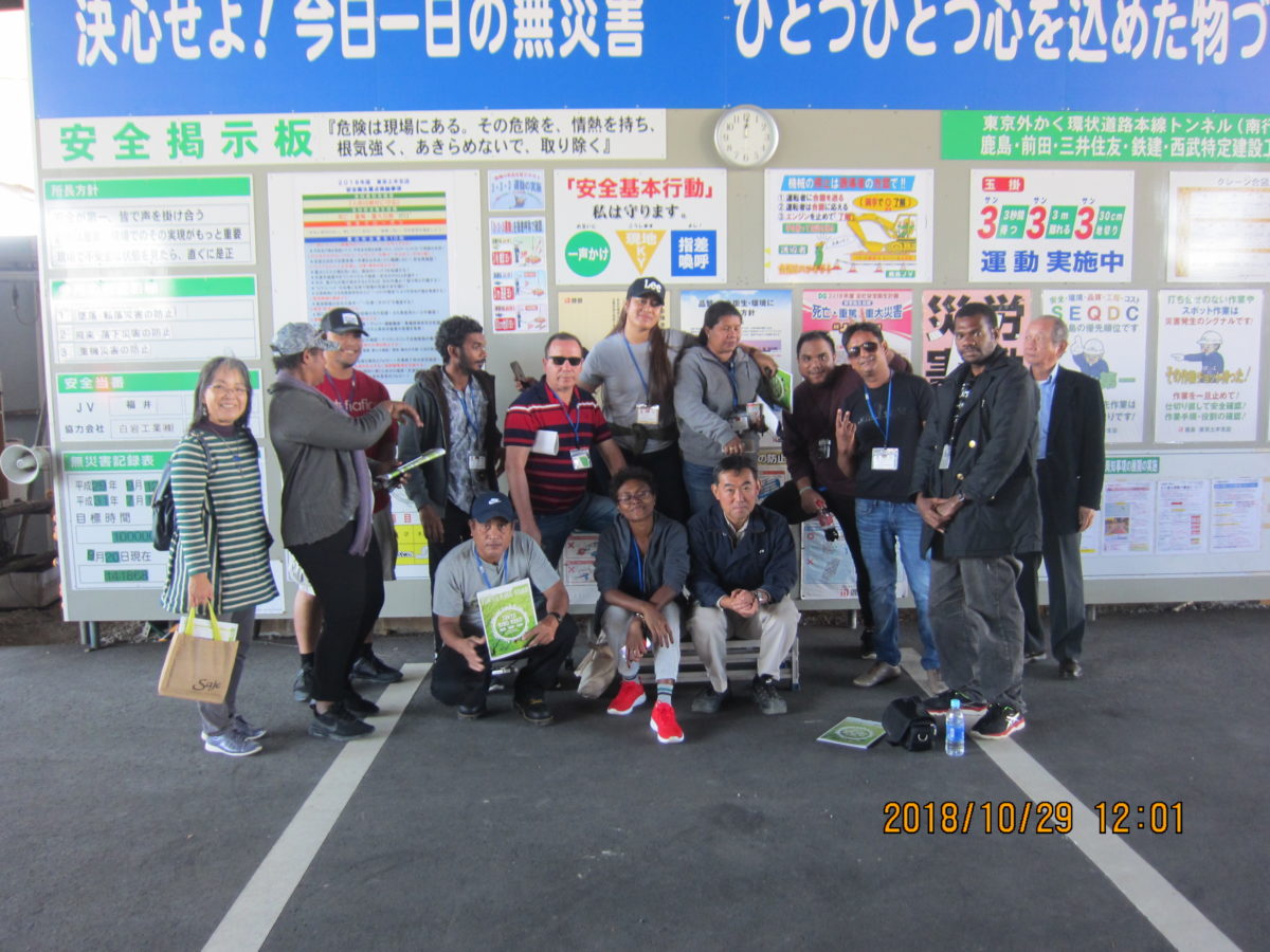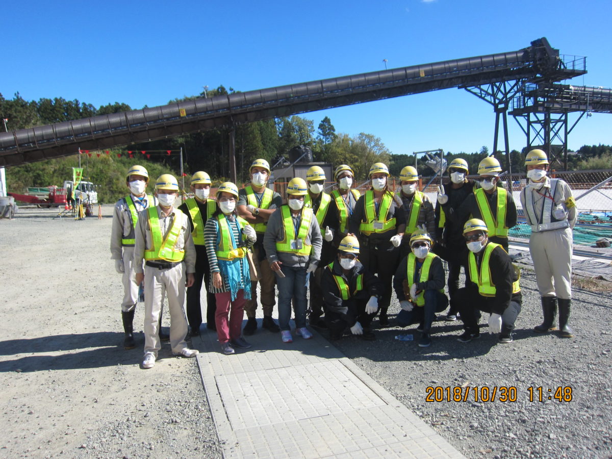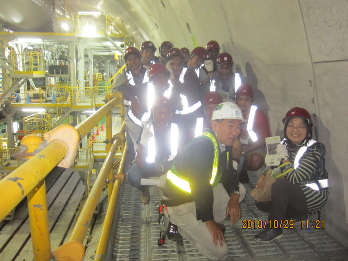 NEXCO東日本発注の、東京外郭環状道路本線トンネル(南行)東名北工事の現場見学でした。外径15.8m(内径14.5m)・延長9,155mの日本最大のシールド工事です。昨年は初期掘進が終わったばかりでしたが、今年4月から掘進を開始、順調に進み、約500m掘り進んでいました。まず、会議室で持木副所長から本工事の概要の説明を受けた後、研修生は全員ヘルメット・チョッキを身に着け、現場を案内して頂きました。初めてのシールド工事現場に興味津々で、また、何もかもスケールが大き過ぎる現場にビックリ仰天の様子でした。シールド現場見学終了後、東京駅から新幹線に乗って郡山に向かいました。東京よりかなり気温の低い郡山にコートを羽織る研修生もいました。
