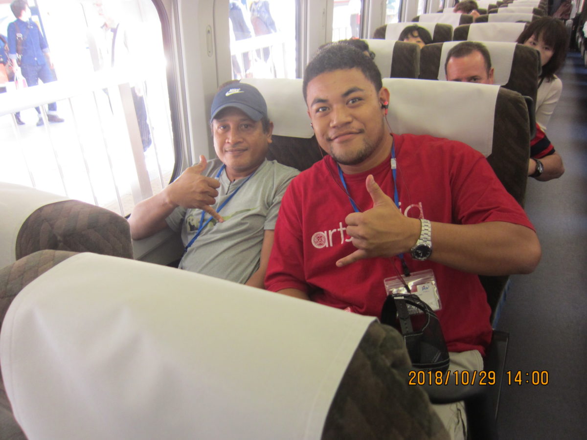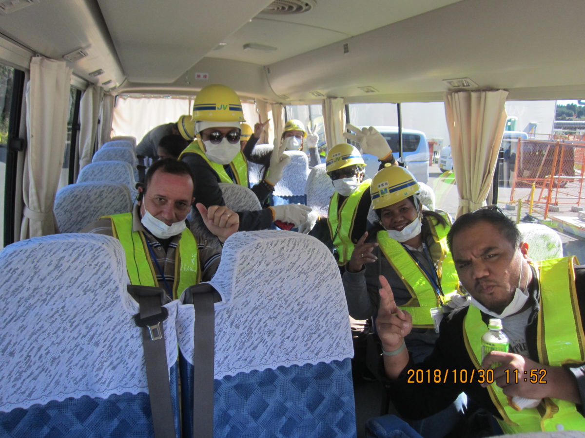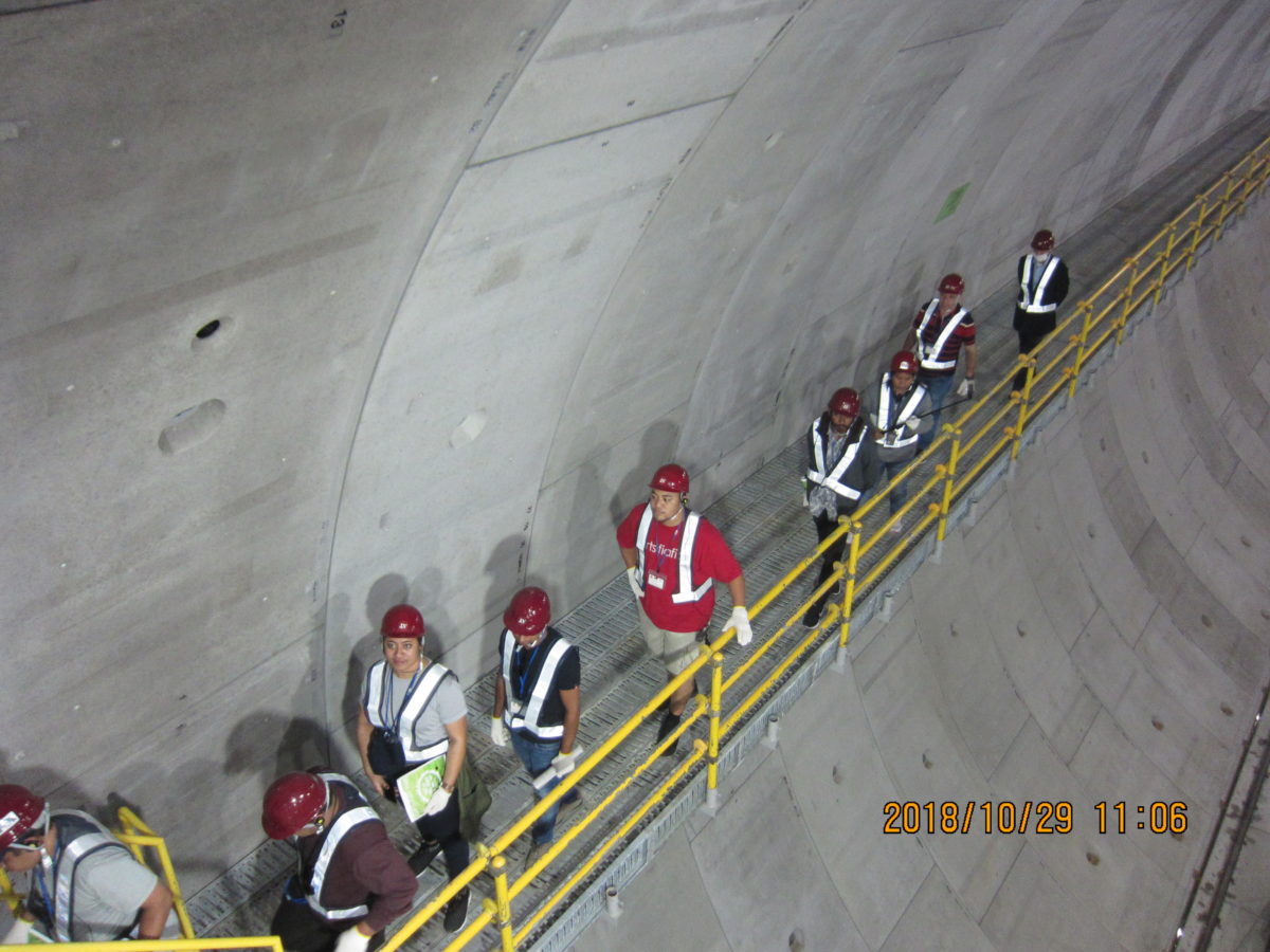 NEXCO東日本発注の、東京外郭環状道路本線トンネル(南行)東名北工事の現場見学でした。外径15.8m(内径14.5m)・延長9,155mの日本最大のシールド工事です。昨年は初期掘進が終わったばかりでしたが、今年4月から掘進を開始、順調に進み、約500m掘り進んでいました。まず、会議室で持木副所長から本工事の概要の説明を受けた後、研修生は全員ヘルメット・チョッキを身に着け、現場を案内して頂きました。初めてのシールド工事現場に興味津々で、また、何もかもスケールが大き過ぎる現場にビックリ仰天の様子でした。シールド現場見学終了後、東京駅から新幹線に乗って郡山に向かいました。東京よりかなり気温の低い郡山にコートを羽織る研修生もいました。