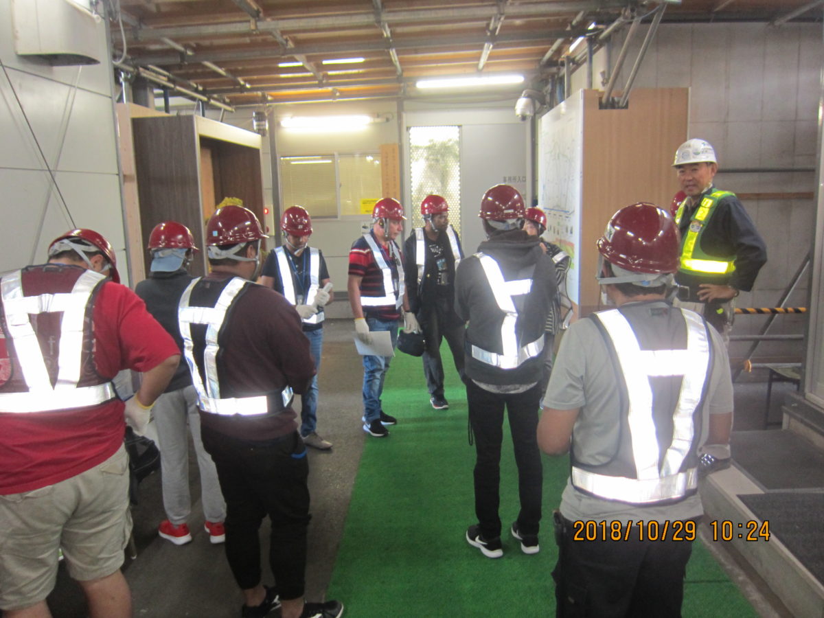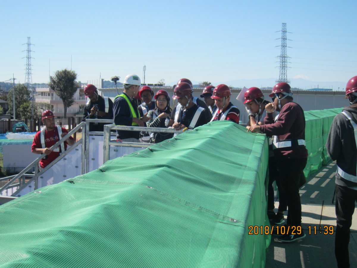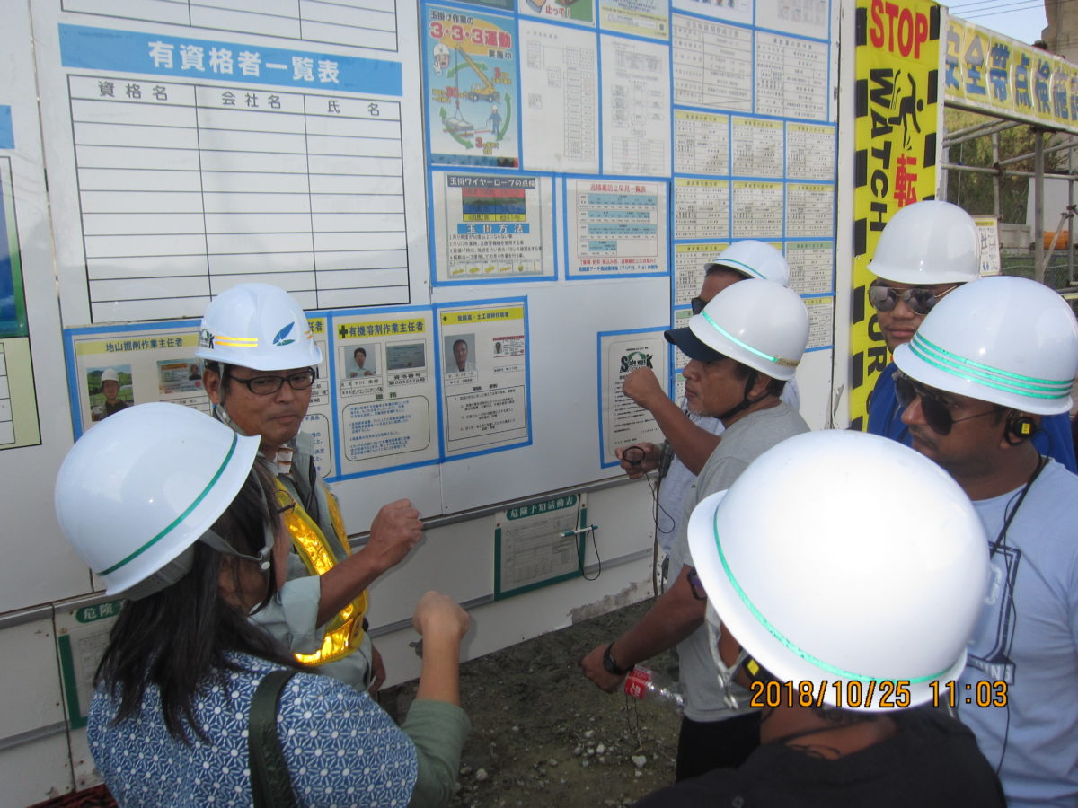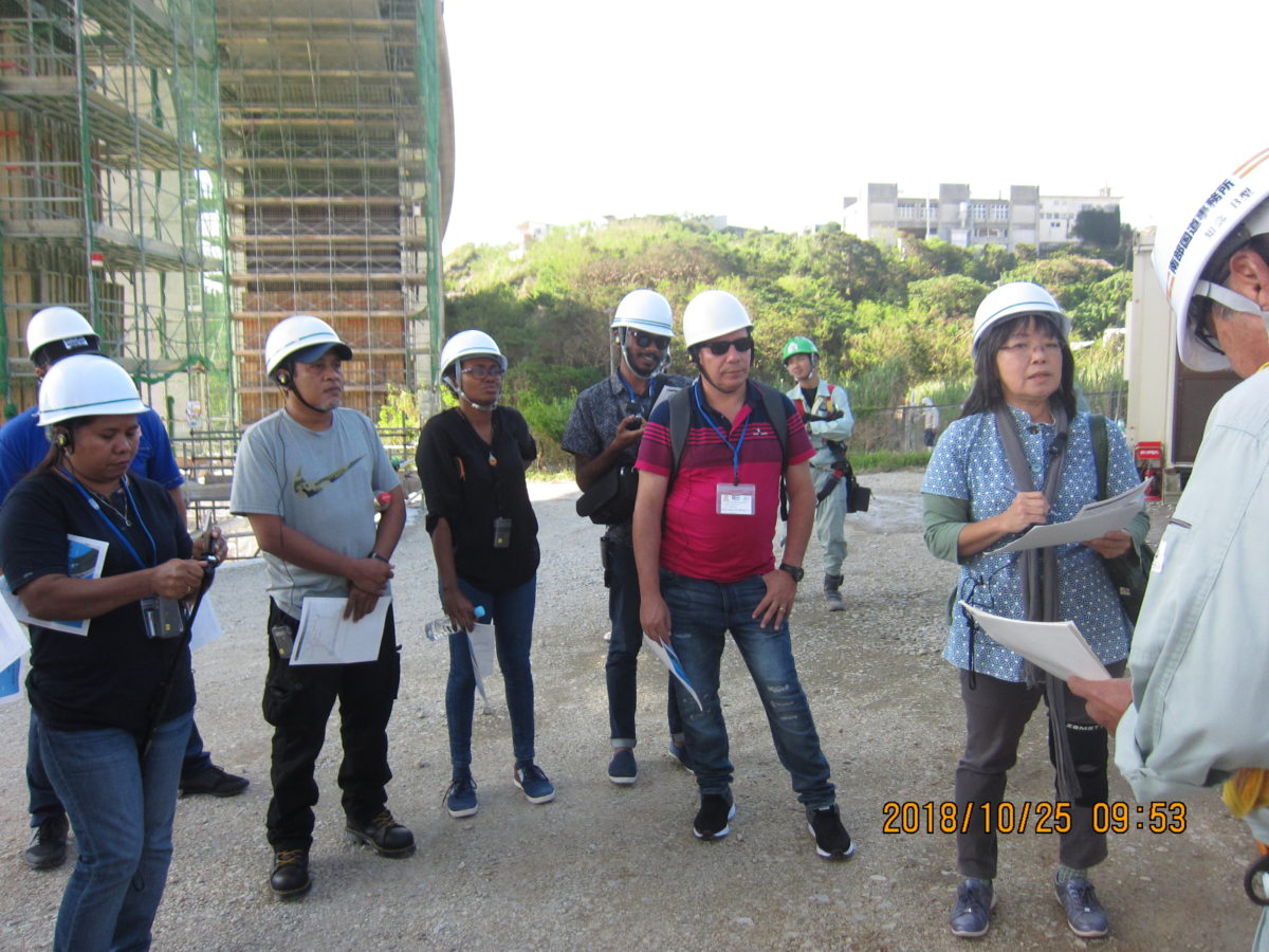 午後は、沖縄県発注の工事現場視察でした。まず、南部東道路の施工現場を大里メモリアルパークから眺めました。南部東道路建設現場事務所から工事概要の説明があり、南部圏域の振興に寄与する地域高規格道路工事、事業の経緯や整備効果等の説明がありました。完成は8年後とのことです。次は、浦添西原線の災害防除工事の見学で、昨年の大雨で擁壁に亀裂が生じて、放置すると災害を引き起こす危険があり、その対策工事です。抑制杭(H型鋼)による地滑り防止対策工法が採用されています。研修生は、仮設足場上での櫓による杭打ち工事に興味を持っていました。