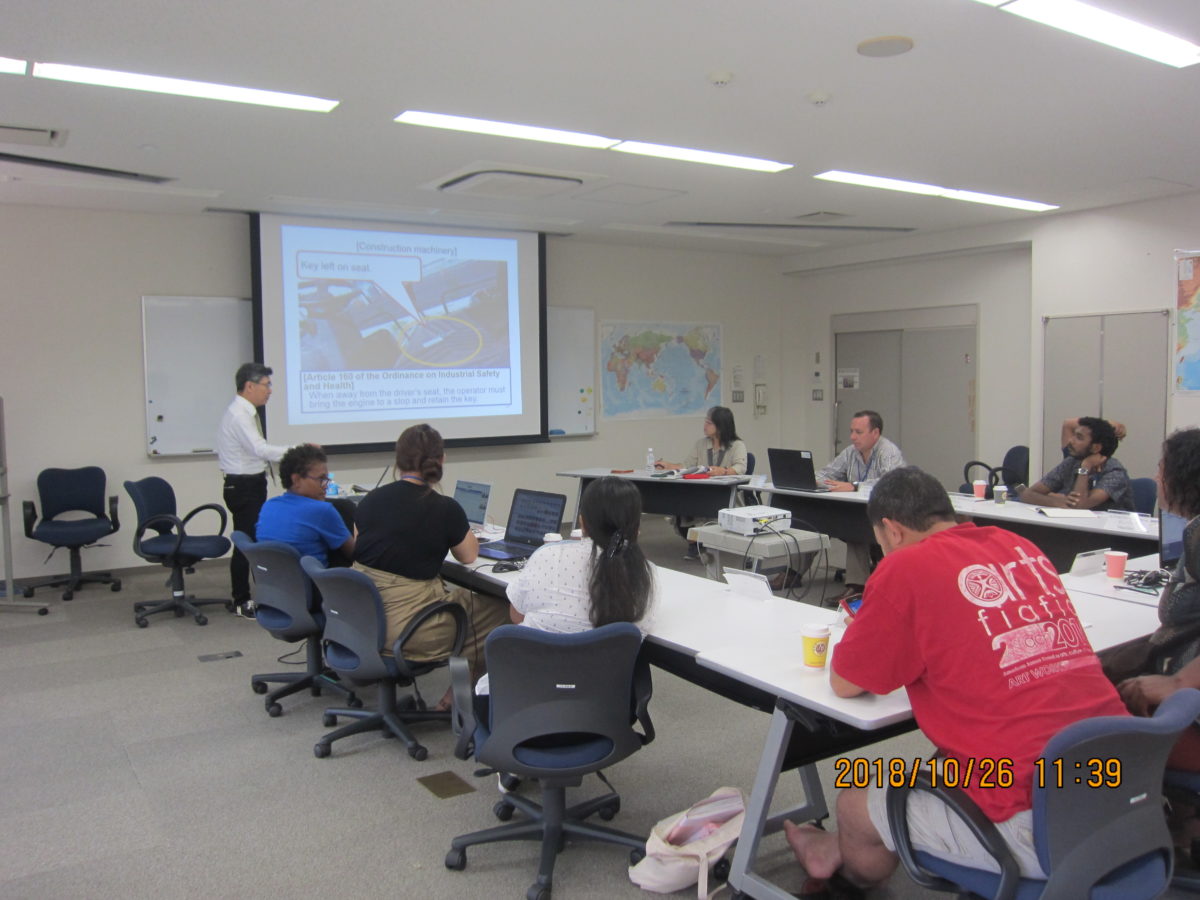 午前は、福田隆さんの「日本における安全衛生管理」の講義でした。前半は、労働基準法、労働安全衛生法等関係法令について学び、関連法律が制定された経緯や主な内容の説明を受けました。後半は、研修員が安全パトロールの査察者として、写真を見ながら不安全設備、不安全行動をチェックするという実習形式でした。ほとんどの事例に対し、研修生から的確なコメントが得られ、講師から高い評価を貰っていました。