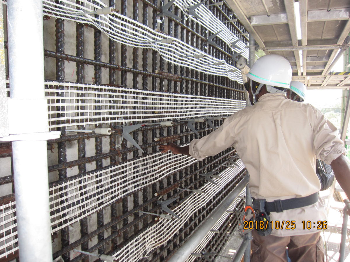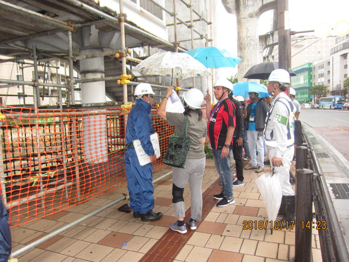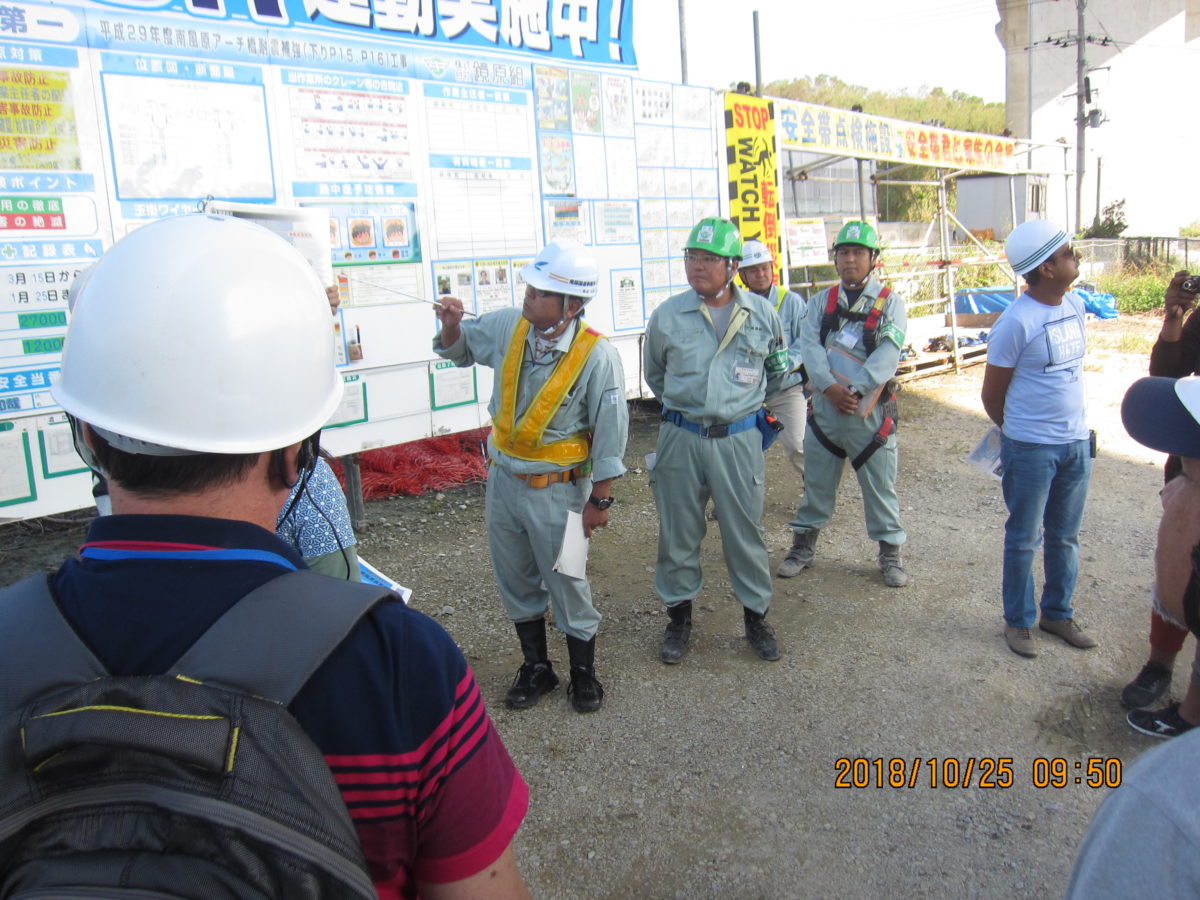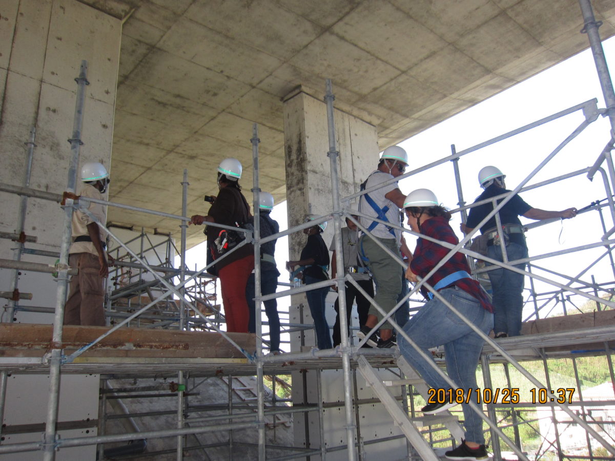午前は、沖縄総合事務局発注の南風原アーチ橋耐震補強工事の現場見学で、南部国道事務所から現場説明後、高さ約30mの足場に上って作業箇所を視察しました。全員安全帯を装着し、足元を確認しながら昇降設備をゆっくりと登って行きました。構造はRC多径間連続バランスアーチ橋で、現行基準である大規模地震対応の耐震補強であり、橋脚に「しなやかさ」を与え、地震のエネルギーを吸収するように補強する工事です。例えば、本体構造物への差し筋は1本毎となっています。