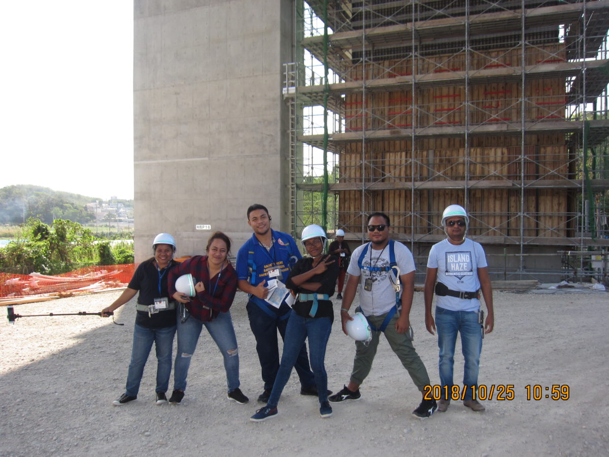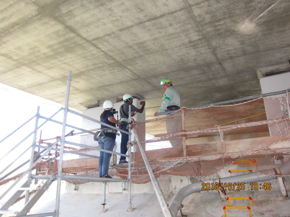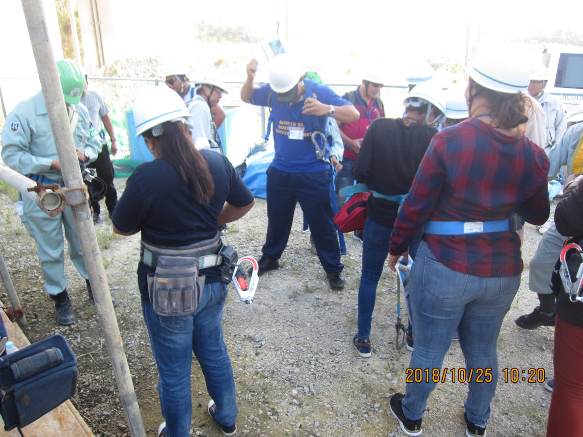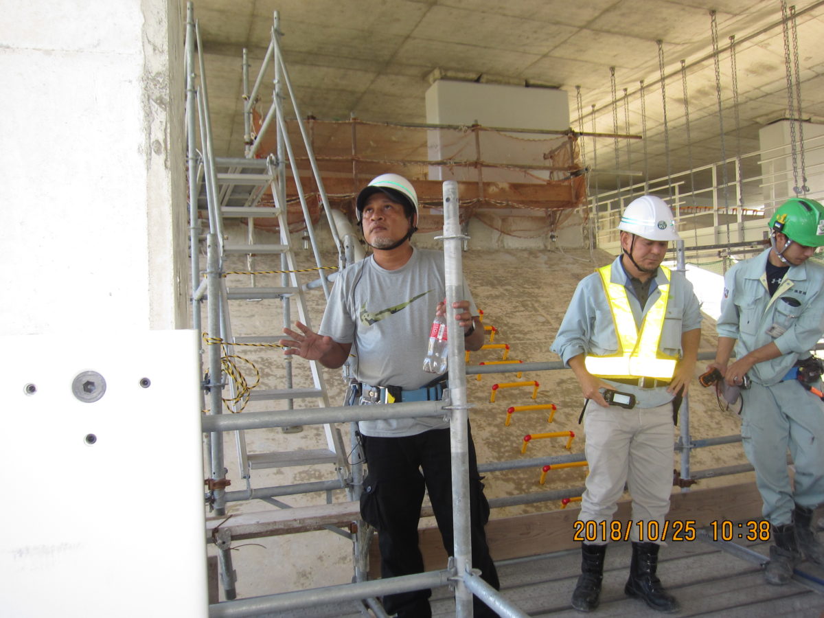 午前は、沖縄総合事務局発注の南風原アーチ橋耐震補強工事の現場見学で、南部国道事務所から現場説明後、高さ約30mの足場に上って作業箇所を視察しました。全員安全帯を装着し、足元を確認しながら昇降設備をゆっくりと登って行きました。構造はRC多径間連続バランスアーチ橋で、現行基準である大規模地震対応の耐震補強であり、橋脚に「しなやかさ」を与え、地震のエネルギーを吸収するように補強する工事です。例えば、本体構造物への差し筋は1本毎となっています。