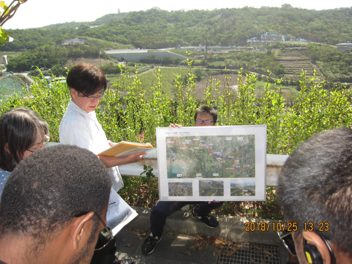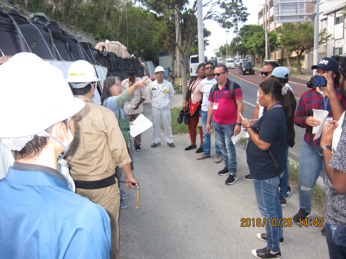 The site the group visited in the afternoon was the work ordered by Okinawa prefectural government. We looked at road under construction from the hill of Ozato Memorial Park. The staff from Nanbu East Road Construction Management Office explained the outline, how this road construction would contribute to promotion of southern region community, and other effects out of the work. It will be completed 8 years later. Then we moved to Urasoe-Nishihara line road to observe a disaster prevention work. The work was determined because retaining wall had cracks after severe rain last year, and further damage was expected to occur if left it without any treatment. Use of restraining pile (H steel pile) was adopted to prevent landslide. The participants were interested in the pile drive by the tower installed in provisional staging.