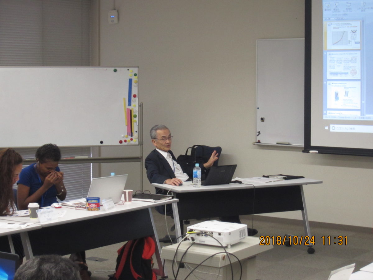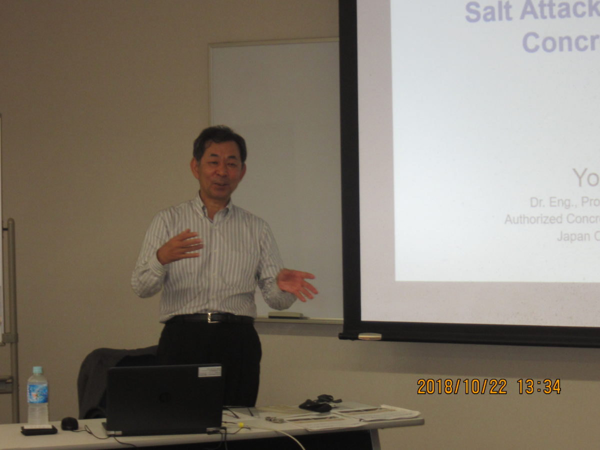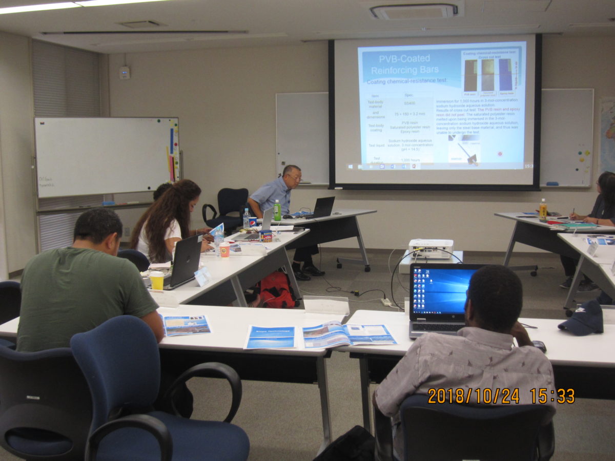 In the afternoon, participants joined a lecture given by Prof. Yabuki, Emiretus Professor at University of the Ryukyus. He discussed on maintenance engineering of steel bridge (countermeasures against corrosion ofsteel bridge). He elaborated on the environment which causes steel bridge to corrode, and its mechanism based on verified data. He explained that Okinawa is the most suitable site for experiment for verification as its natural environmentis harsh on steel bridge more than other places in Japan. He showed various anti-corrosive measures and important points in maintenance and inspection, developed based on the knowledge relating to corrosion.