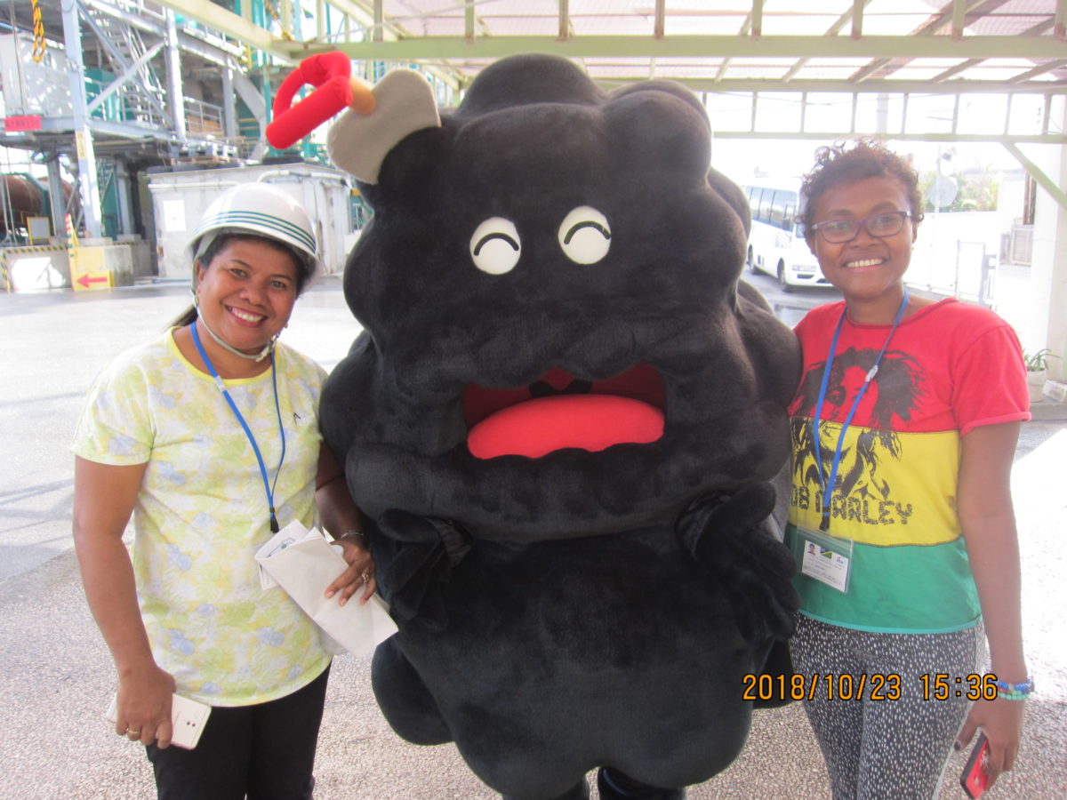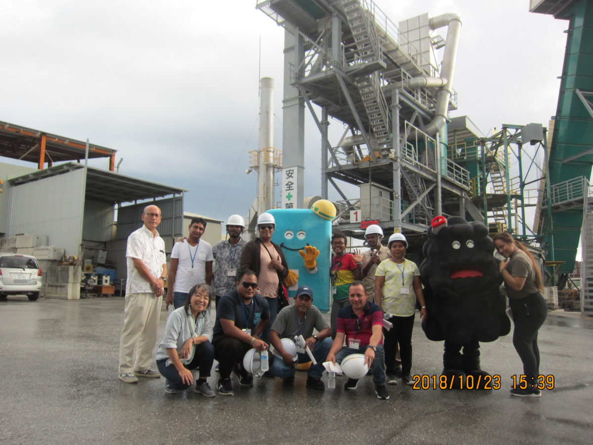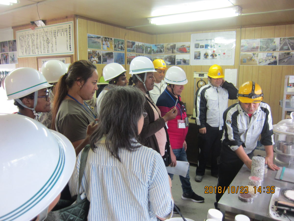 午後は、(株)七和のアスファルトプラントの見学でした。最初に会議室でプラント各設備と製造フローの説明を受けました。昨年から、新たにアスファルト保存サイロが建設されていました。その後、実際の設備や材料置き場を見学しました。研修員からは見学中に質問が投げかけられ、七和の技術者岸本さんら3名にその対応に当たって頂きました。そして、試験室等で浸透試験を実際に学び・体験し、また平坦性を測定する新しい測定器材の紹介を受けました。最後に会議室で(株)七和のポリシーや実績の説明を受けました。そして、ゆるキャラのアスコン君とロード君に見送られてプラントを後にしました。