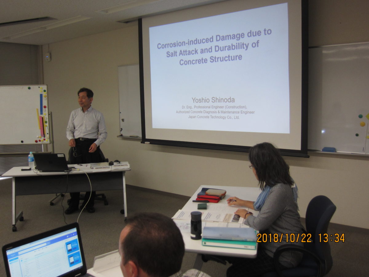 午後は「塩害とコンクリート構造物の耐久性」、及び「コンクリート舗装の基礎」というテーマで篠田さん(工学博士・技術士・コンクリート診断士)の講義でした。コンクリートの基礎についての質問から始まりました。そして、コンクリートの耐久性の観点から、塩害のメカニズムや進行状況、劣化の要因、及び塩害対策技術(ステンレス等)等について、研修生に質問しながら、詳細に解説して頂きました。研修員は塩害の基準や劣化要因の推移に興味を示していました。又最後にコンクリート舗装の基礎についても学びました。