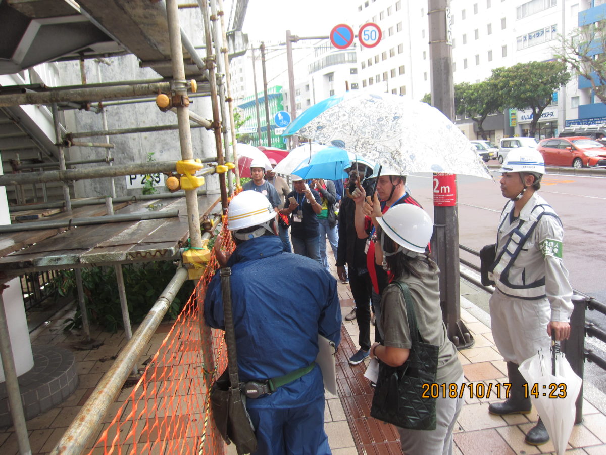 In the morning, the group went out to observe the aseismic reinforcement work on arch-type bridge in Haebaru ordered by Okinawa General Bureau. At first, a staff from Nanbu National Highway Management Office briefed us an outline of the work, then we walked up the scaffold at 30 m above the ground to observe the actual work. All participants wore safety belt (harness) and slowly moved up the stairs, watching their steps carefully. It was the RC multiple span continuous balanced bridge. The reinforcement work needed to be conducted as to fit to the current standard that is to be resistant to large-scale earthquake. For instance, individual bars to be connected to the bridge main body is done alternatively.
