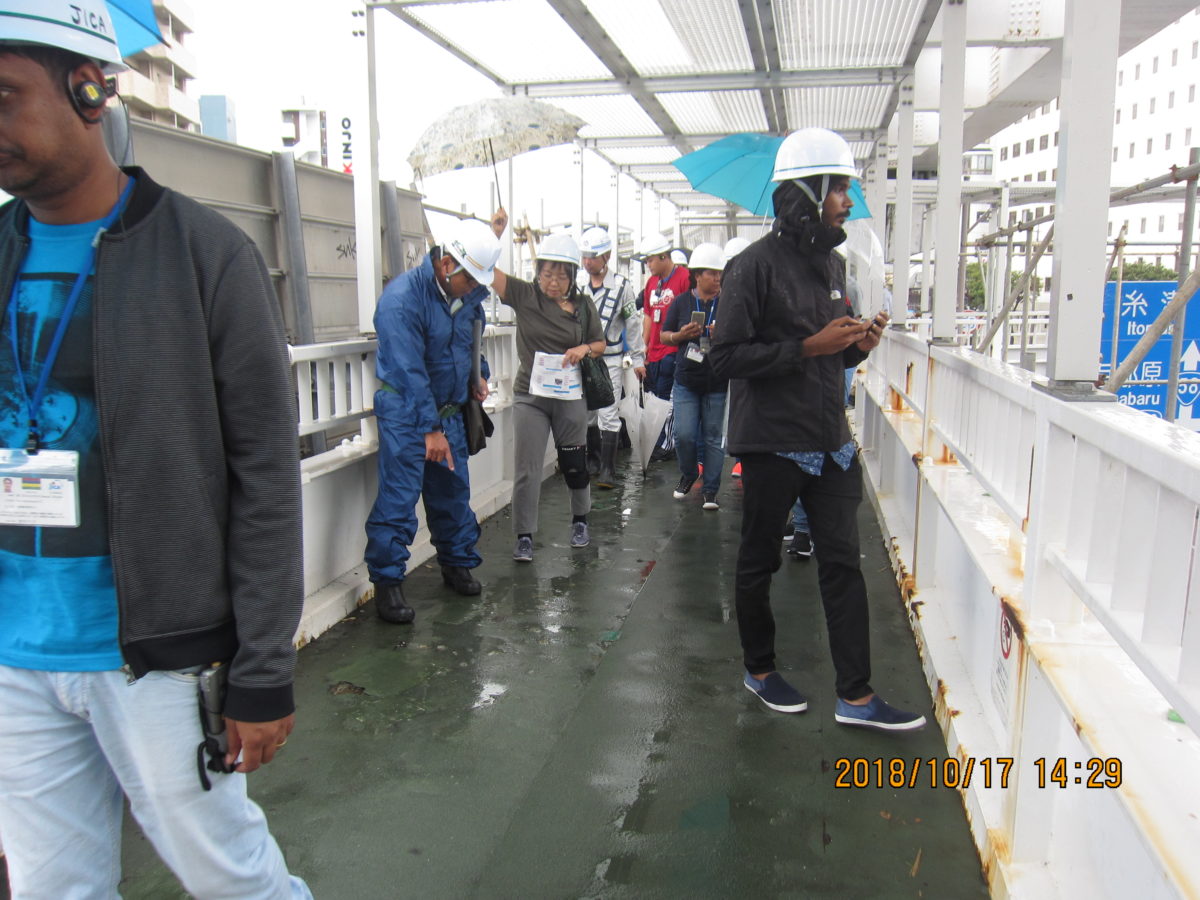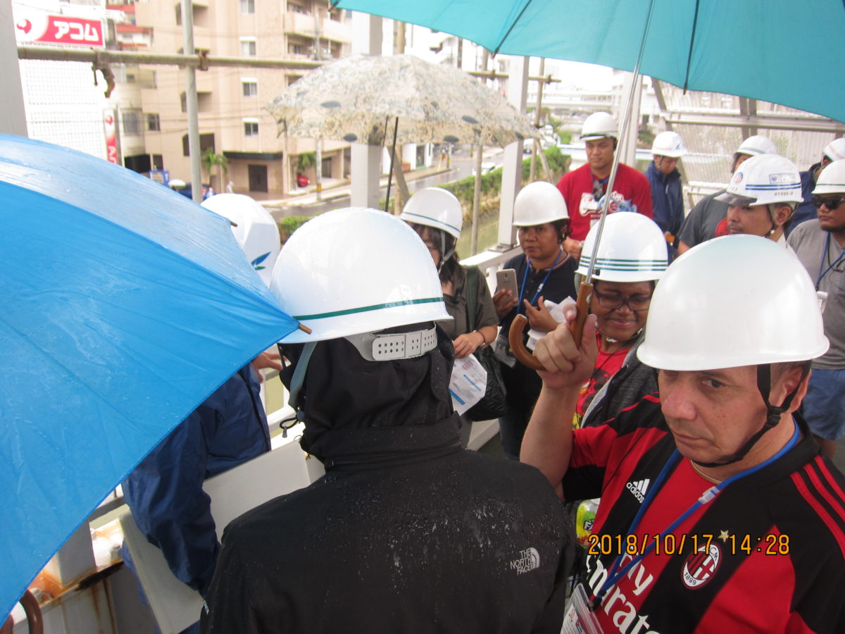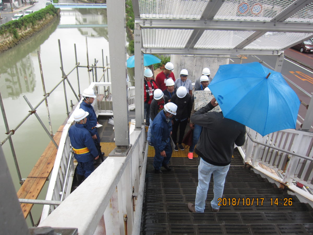 The participants went to see repair work of Izumizaki Pedestrian Bridge, a work ordered by Okinawa General Bureau in the afternoon. Rain had continued falling since the morning, so we had a briefing given by the contractee of the work with opening umbrellas. The participants were asking questions such as guarantee period or about scaffold. Then, the group walked on the bridge observing the condition of it, and asking specific questions such as how to select a method of repair depending on the degree of corrosion.