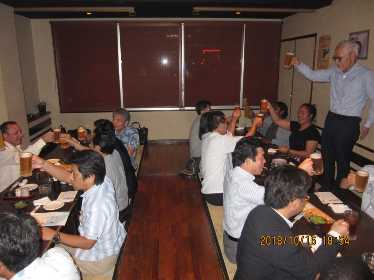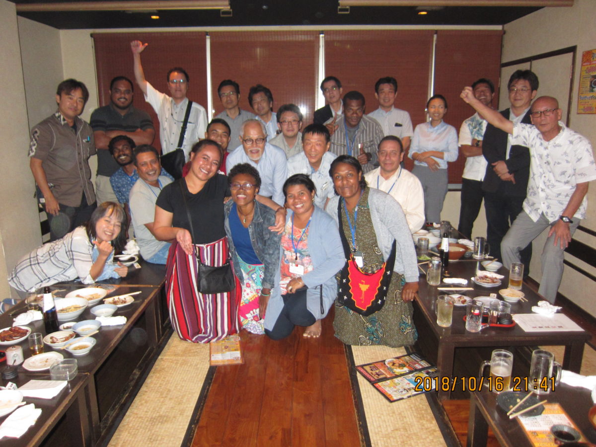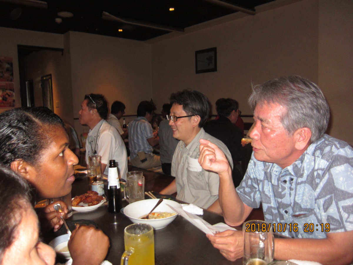 又、夜には那覇市内の居酒屋で懇親会を開催し、国、沖縄県、大学、及び民間会社の講師の方々とも一緒にオリオンビールや泡盛を飲みながら楽しい時間を過ごしました。