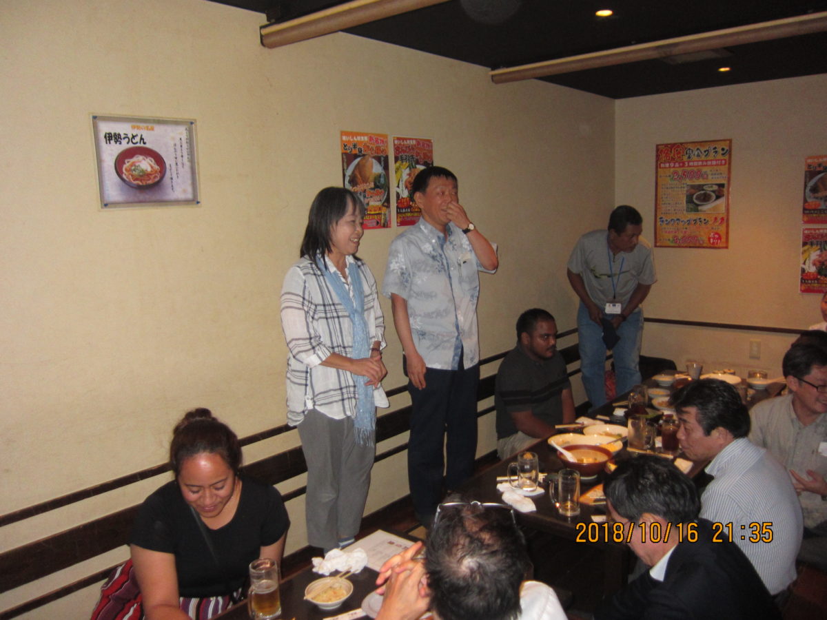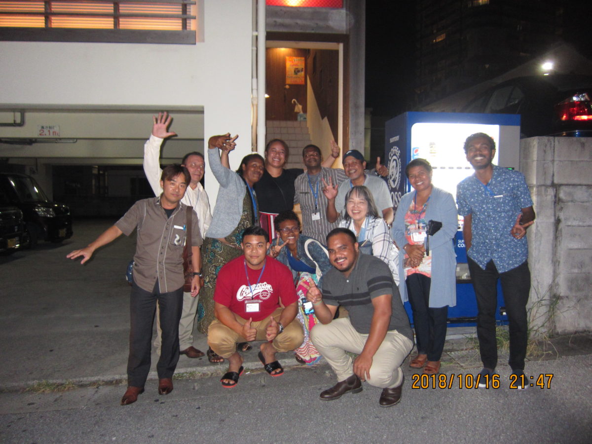 In the evening, NPO Green Earth hosted a welcome party for the participants in a restaurant in Naha city. The party was joined by the lecturers of our training who belong to national government, Okinawa prefectural government, university and private corporations. We all enjoyed the joyous evening together with local foods and drinks (some enjoyed the taste of Orion Beer and Awamori!).