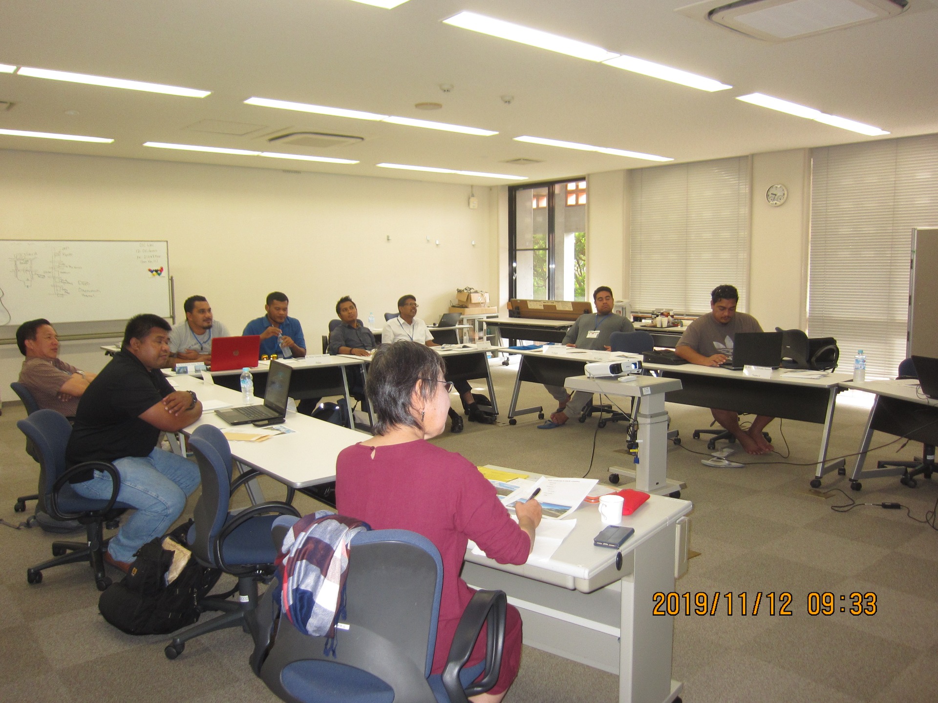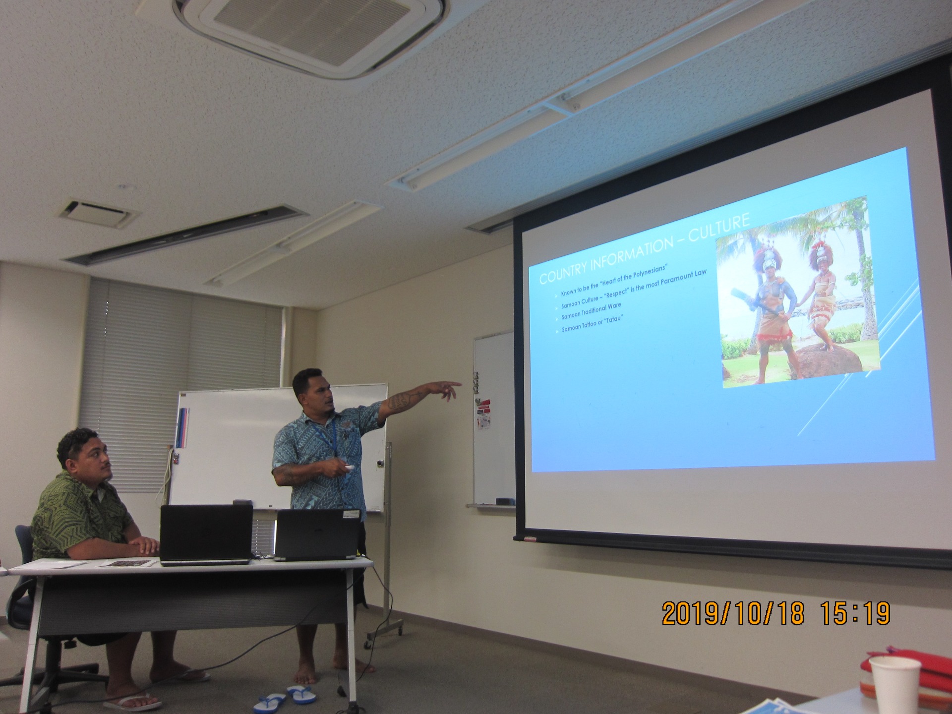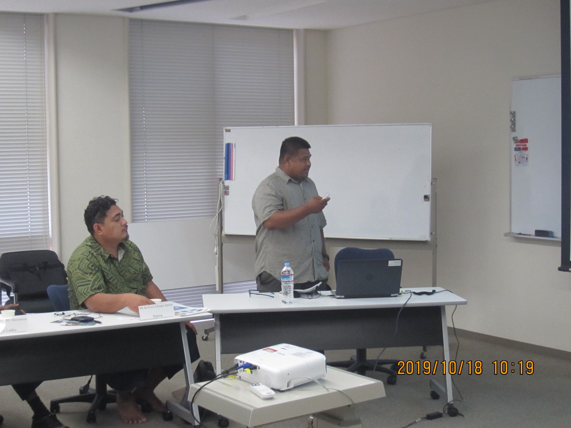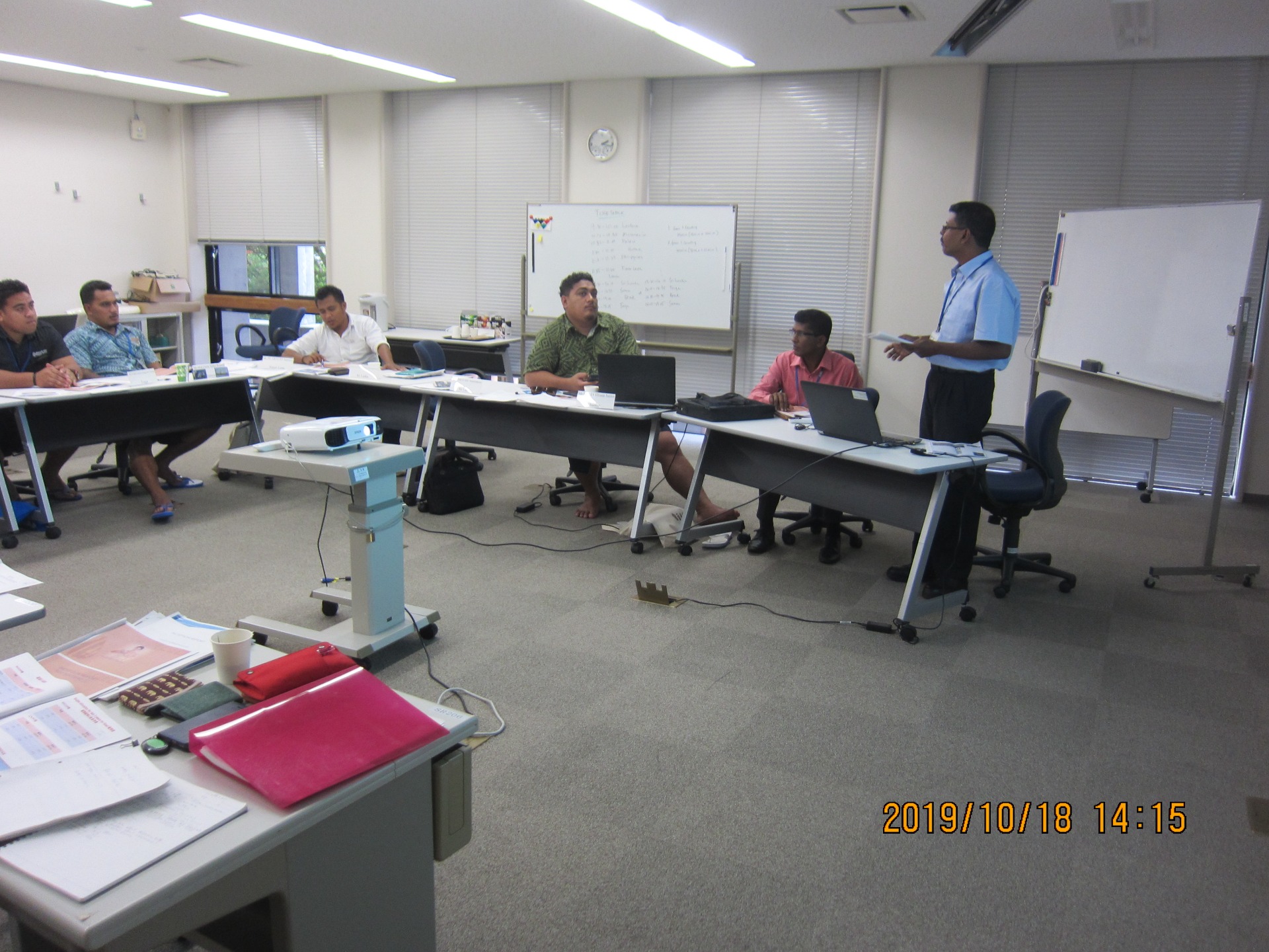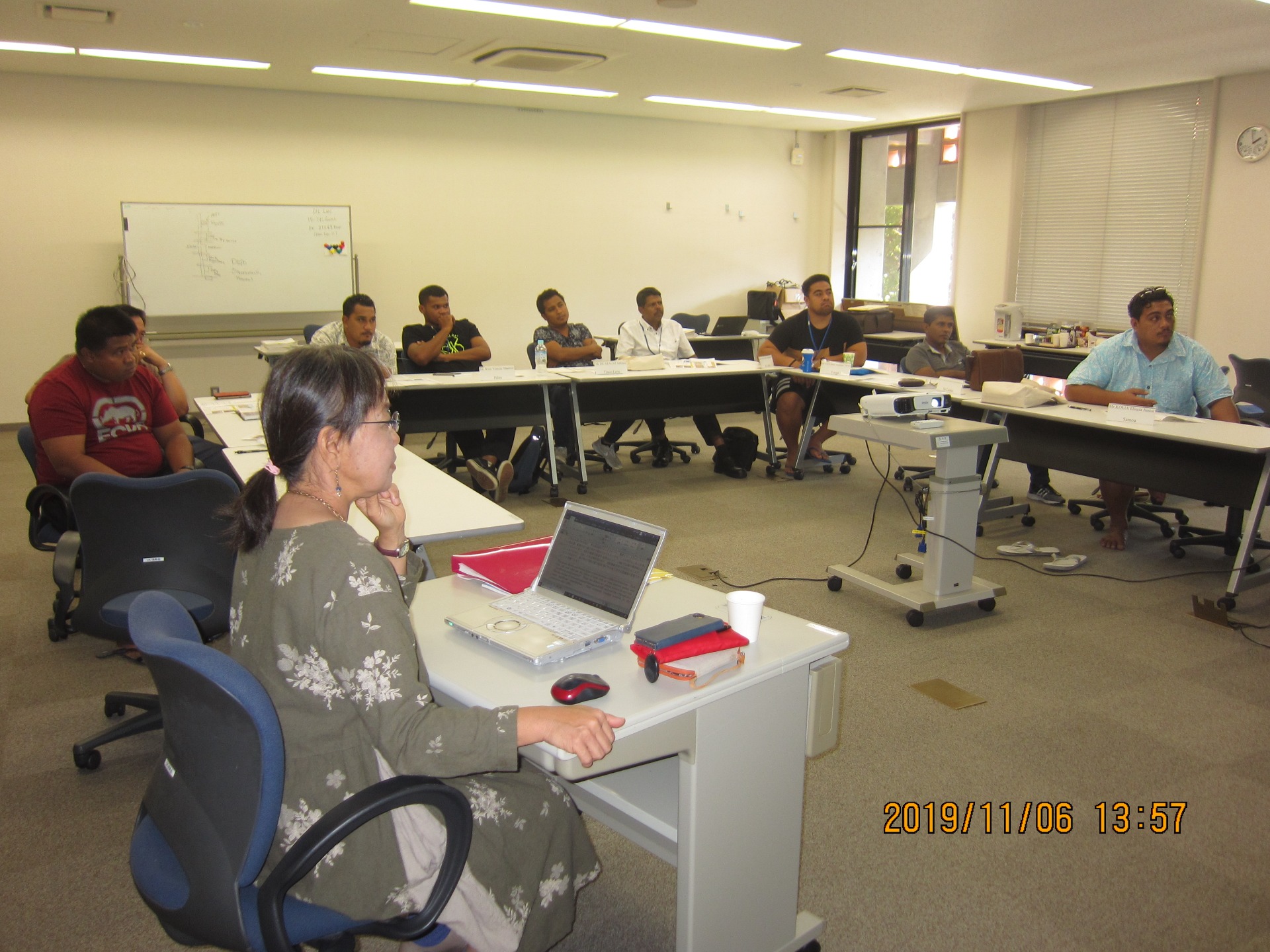 本日は研修生の「サマリーレポート発表会」でした。今回の研修で学んだことを自国の課題等にどのように役立てられるのか等をレポートに纏め、研修生一人一人が発表しました。発表時間はひとり30分(発表15分、質疑応答等15分)でした。コメンテーターとして矢吹先生(琉球大学)、下地さん(沖縄総合事務局)、前村さん(沖縄県)、及び松田さん(しまたて協会)に出席して頂きました。各コメンテーターと各研修生の質疑応答、また適切なコメンテーターからのアドバイス等を頂きました。研修生各国の課題解決に向けて、前向きな議論、アドバイス等があり、今後の取組が待たれます。