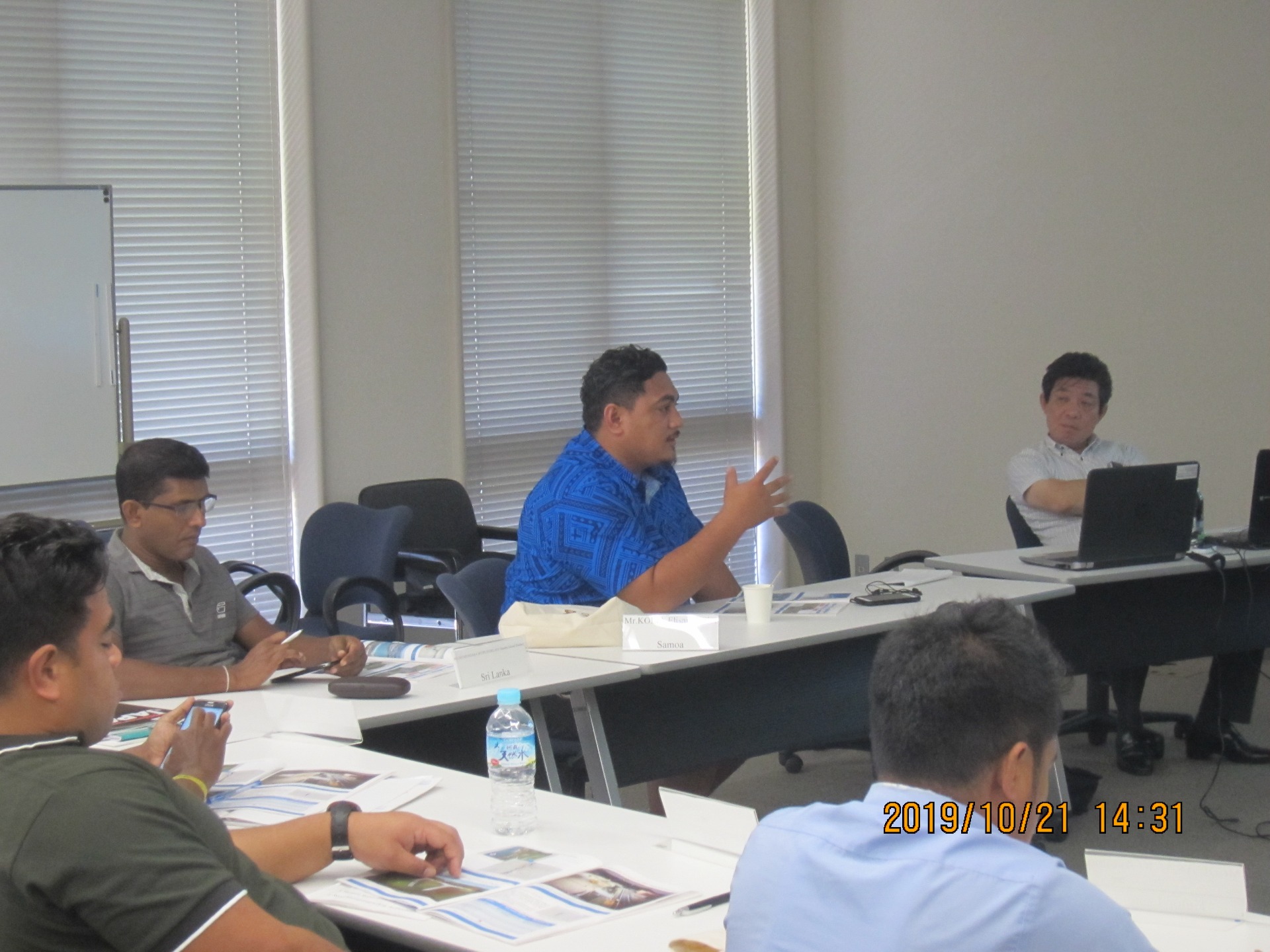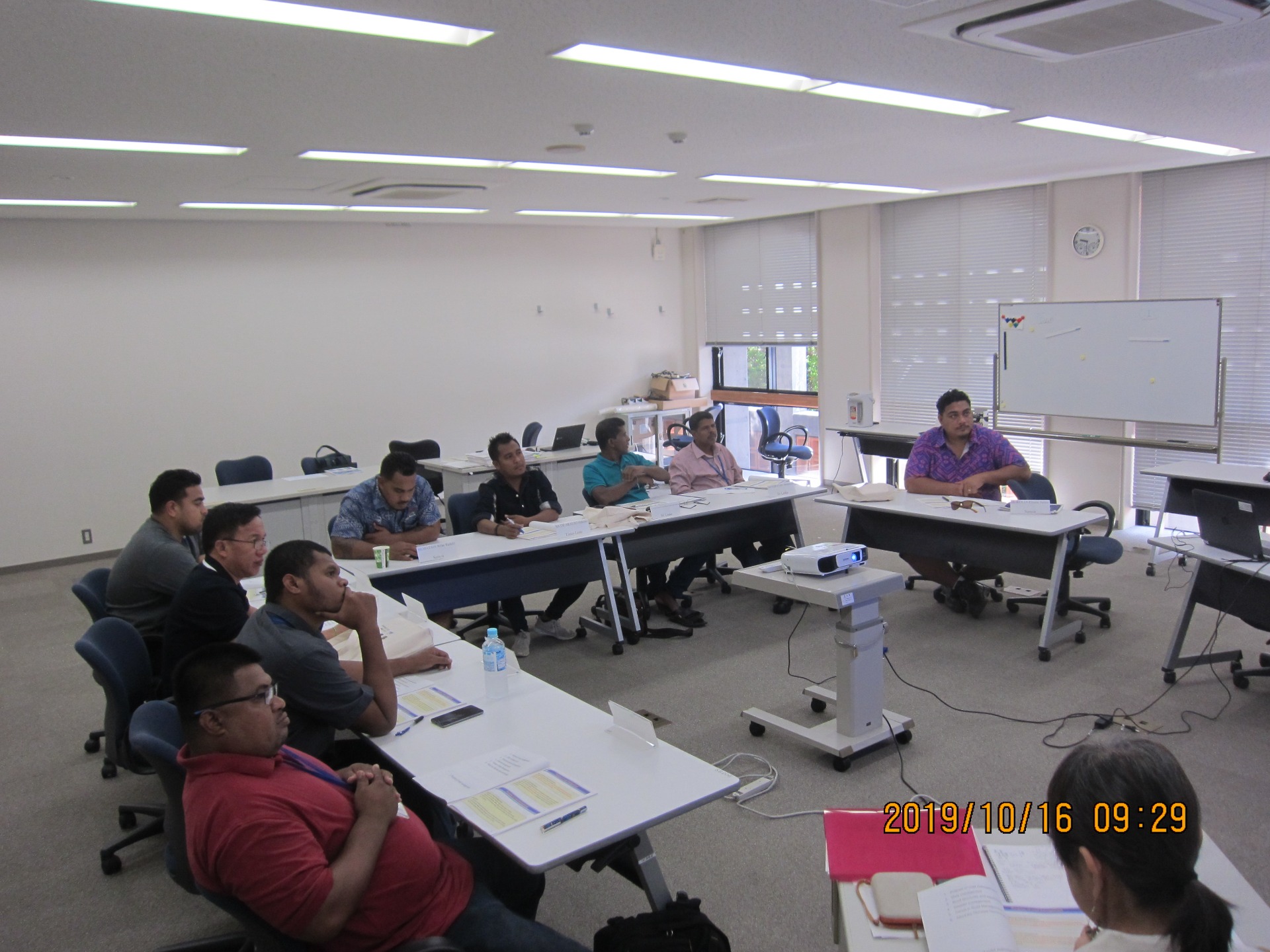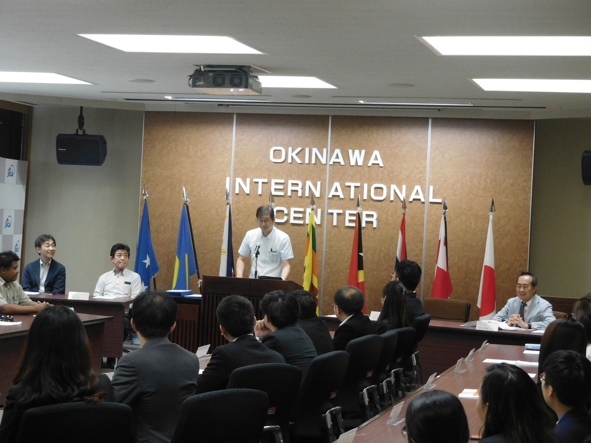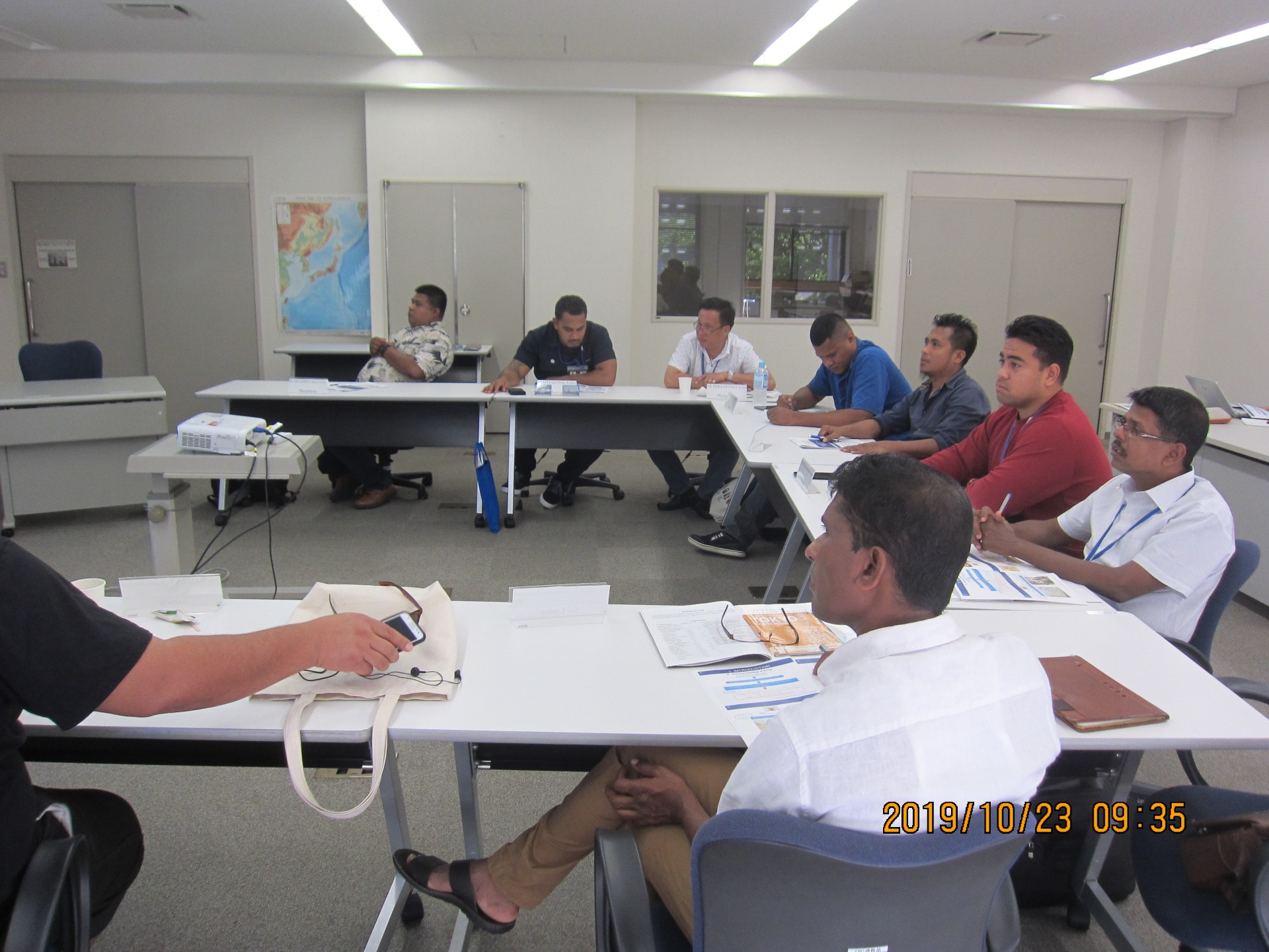 本日は研修生の「サマリーレポート発表会」でした。今回の研修で学んだことを自国の課題等にどのように役立てられるのか等をレポートに纏め、研修生一人一人が発表しました。発表時間はひとり30分(発表15分、質疑応答等15分)でした。コメンテーターとして矢吹先生(琉球大学)、下地さん(沖縄総合事務局)、前村さん(沖縄県)、及び松田さん(しまたて協会)に出席して頂きました。各コメンテーターと各研修生の質疑応答、また適切なコメンテーターからのアドバイス等を頂きました。研修生各国の課題解決に向けて、前向きな議論、アドバイス等があり、今後の取組が待たれます。