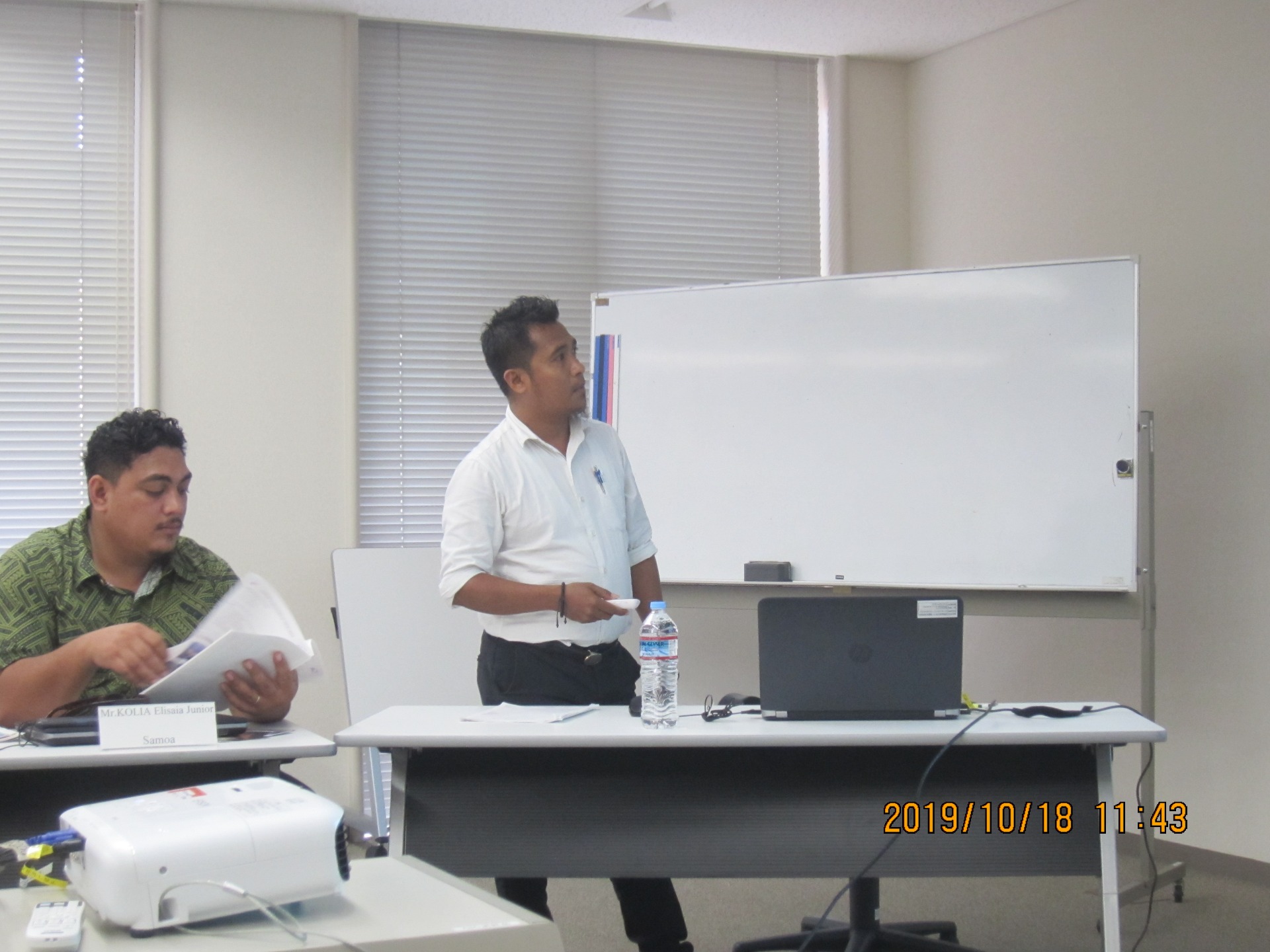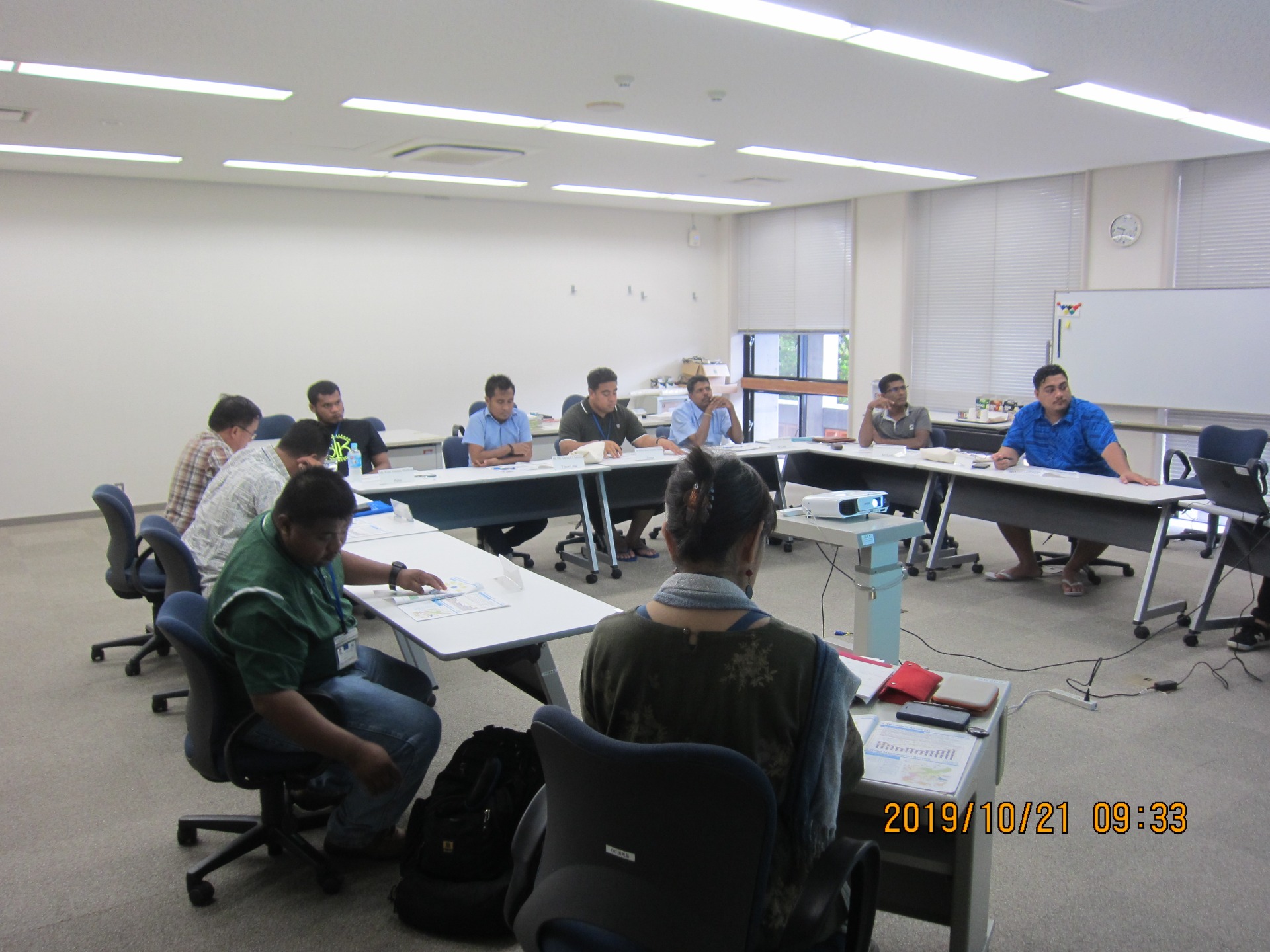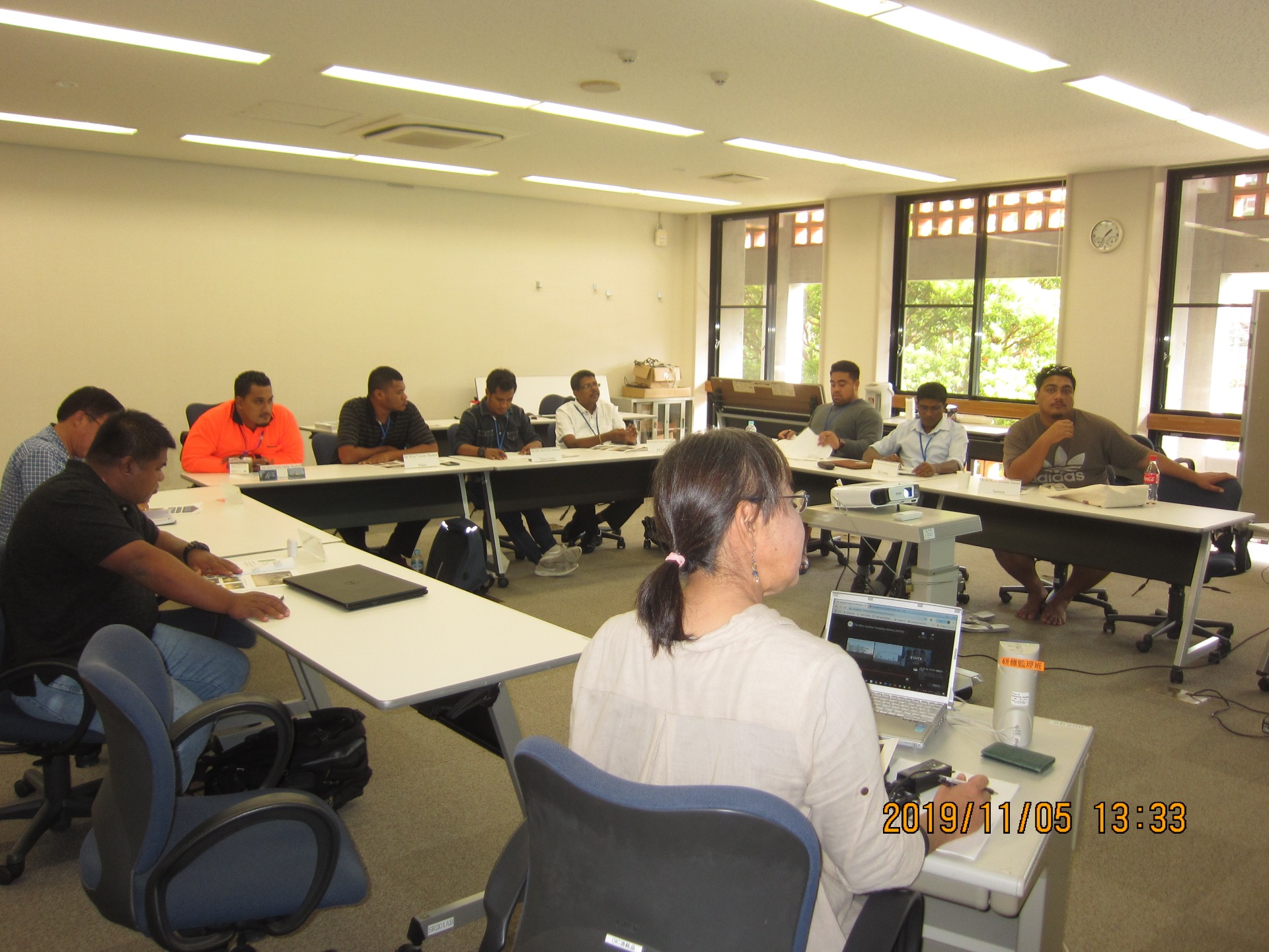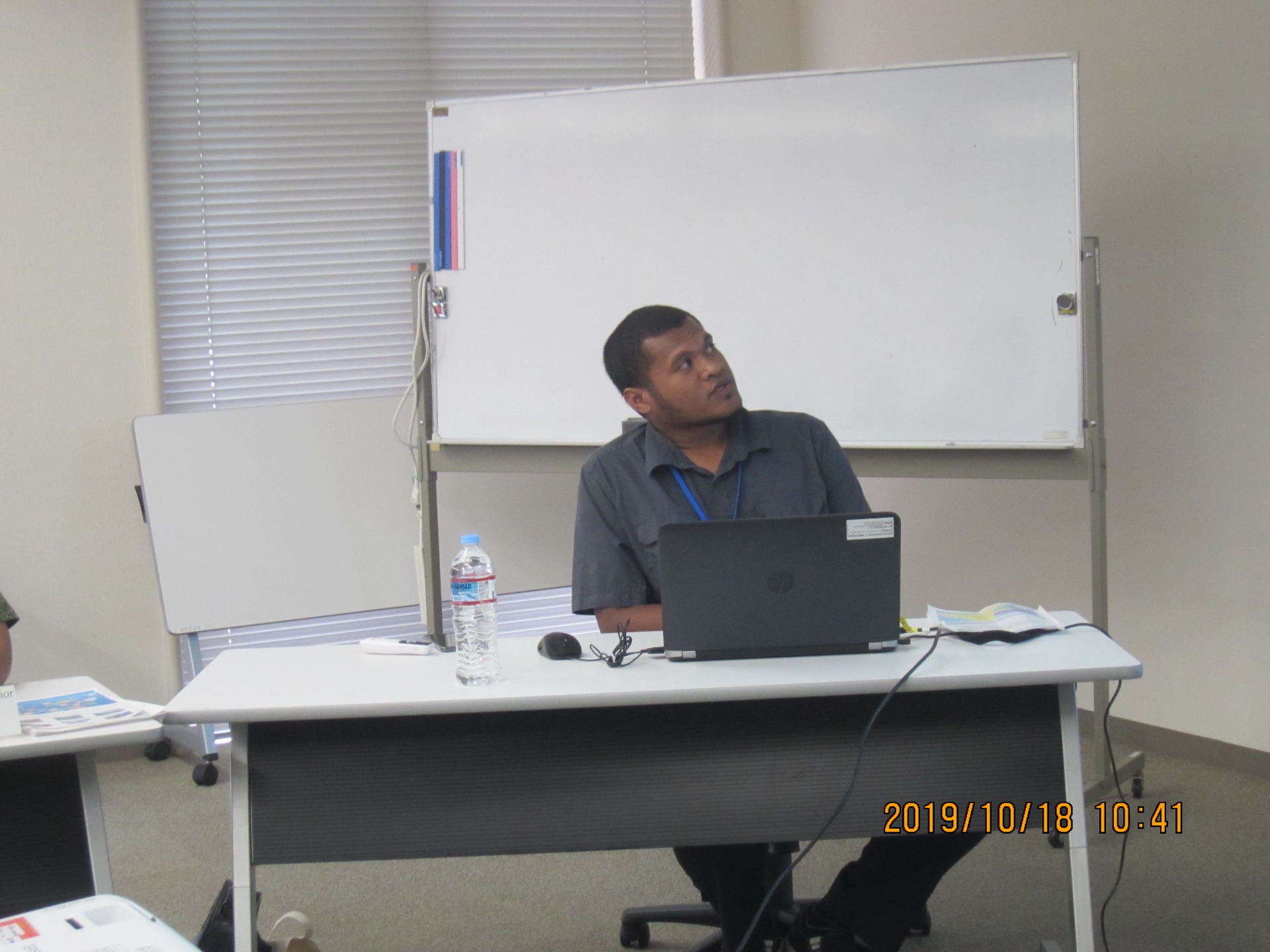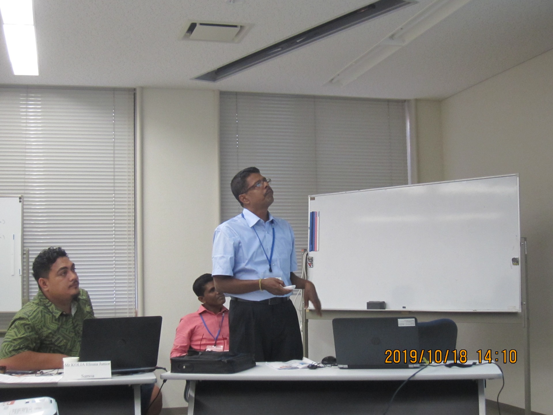 本日は研修生の「サマリーレポート発表会」でした。今回の研修で学んだことを自国の課題等にどのように役立てられるのか等をレポートに纏め、研修生一人一人が発表しました。発表時間はひとり30分(発表15分、質疑応答等15分)でした。コメンテーターとして矢吹先生(琉球大学)、下地さん(沖縄総合事務局)、前村さん(沖縄県)、及び松田さん(しまたて協会)に出席して頂きました。各コメンテーターと各研修生の質疑応答、また適切なコメンテーターからのアドバイス等を頂きました。研修生各国の課題解決に向けて、前向きな議論、アドバイス等があり、今後の取組が待たれます。
